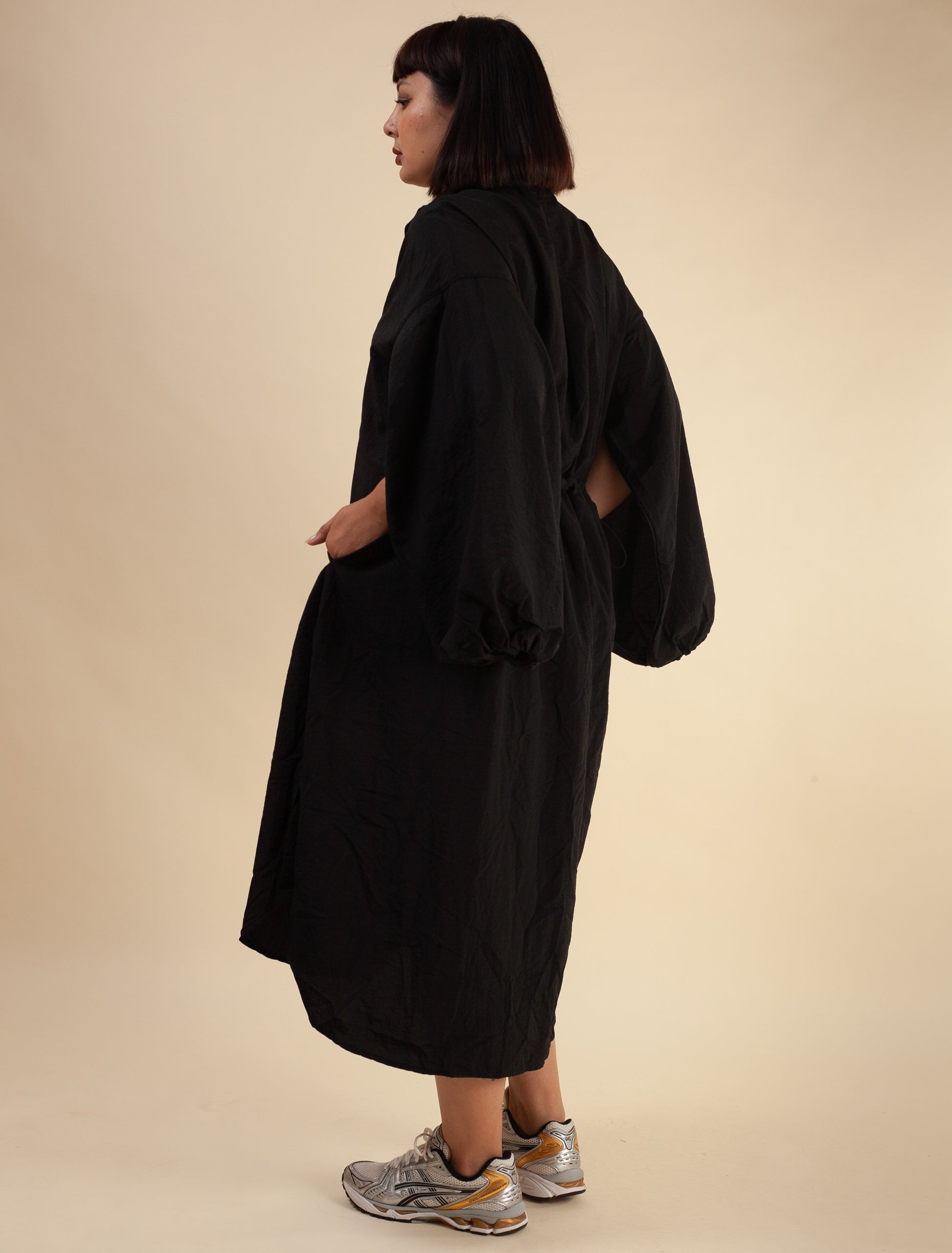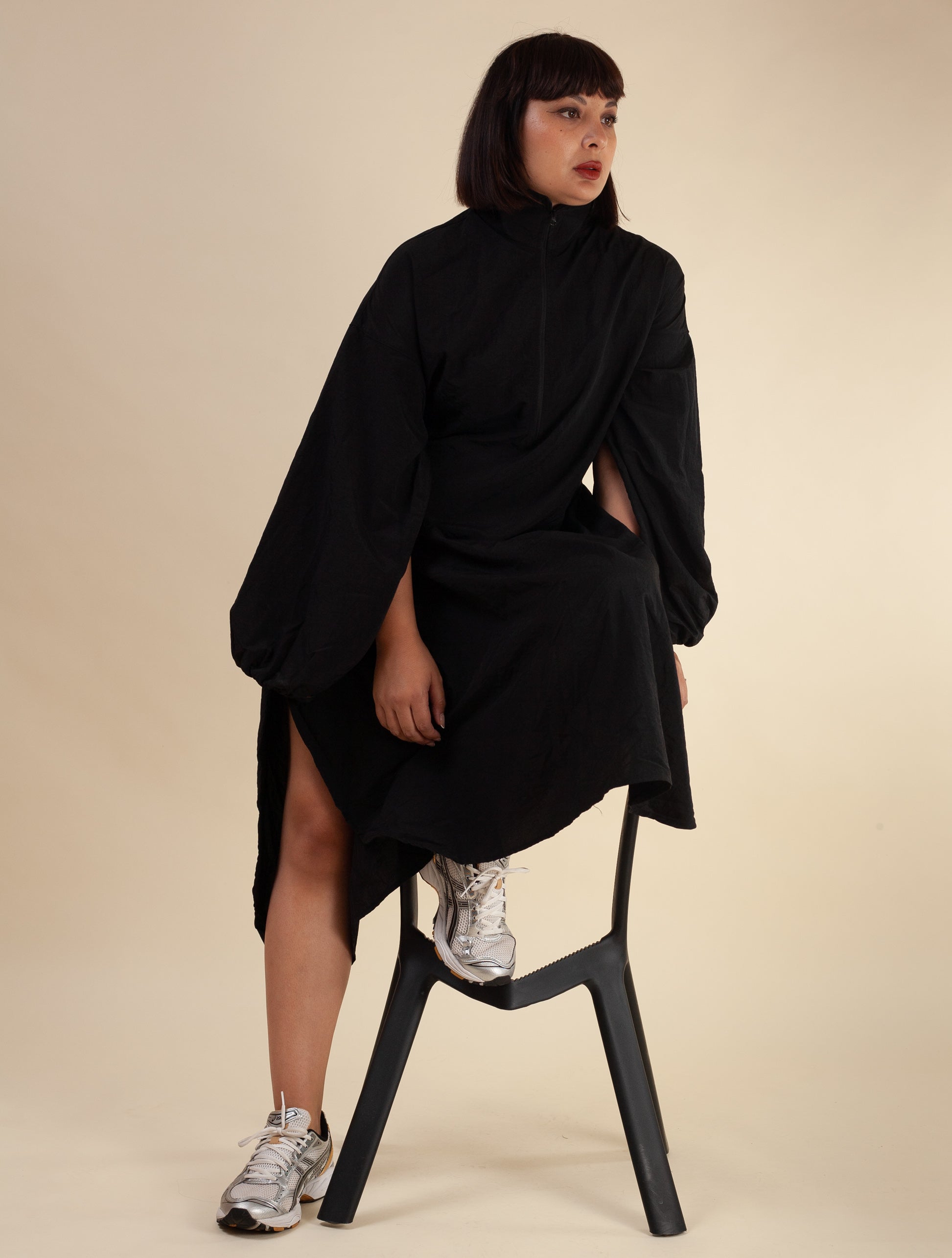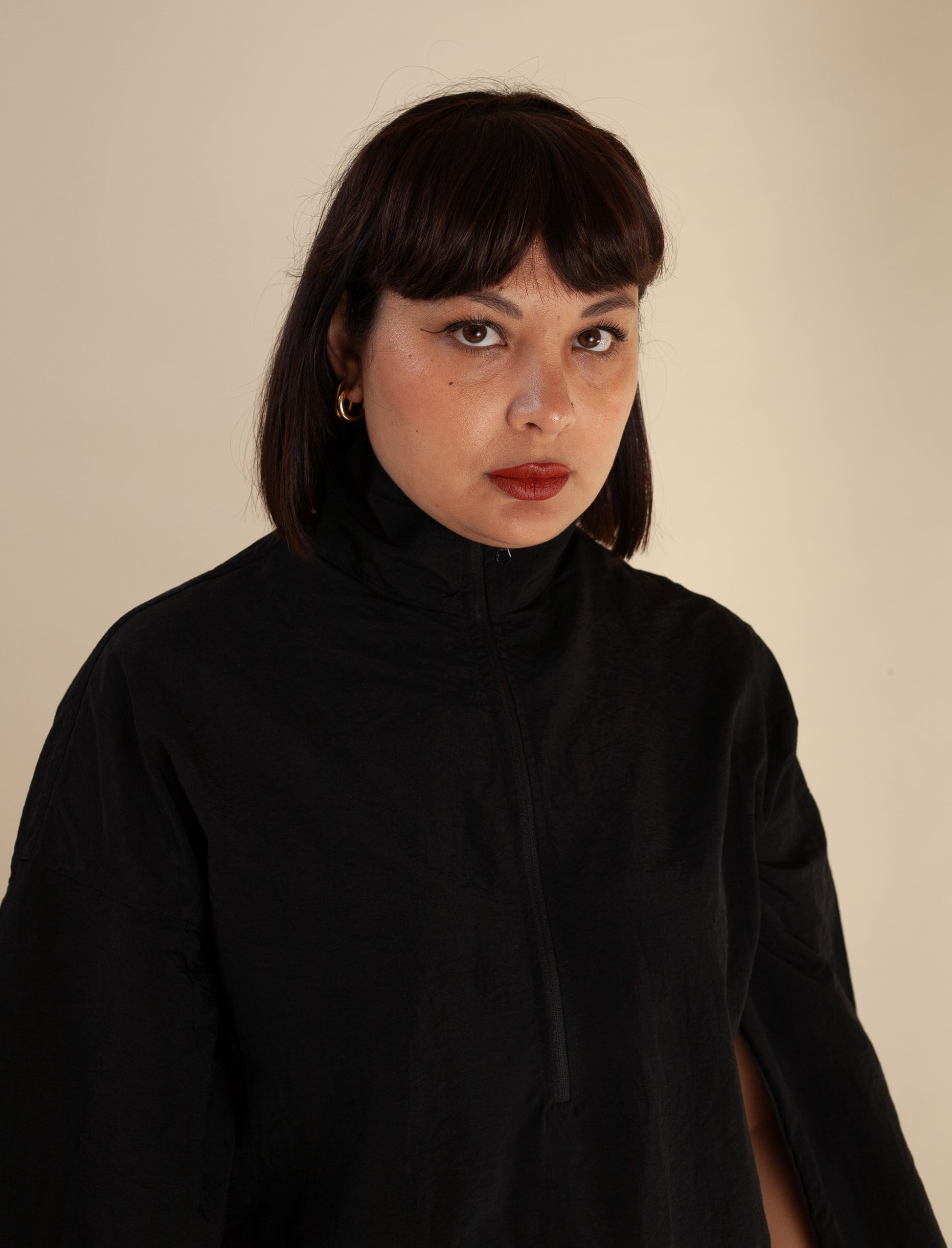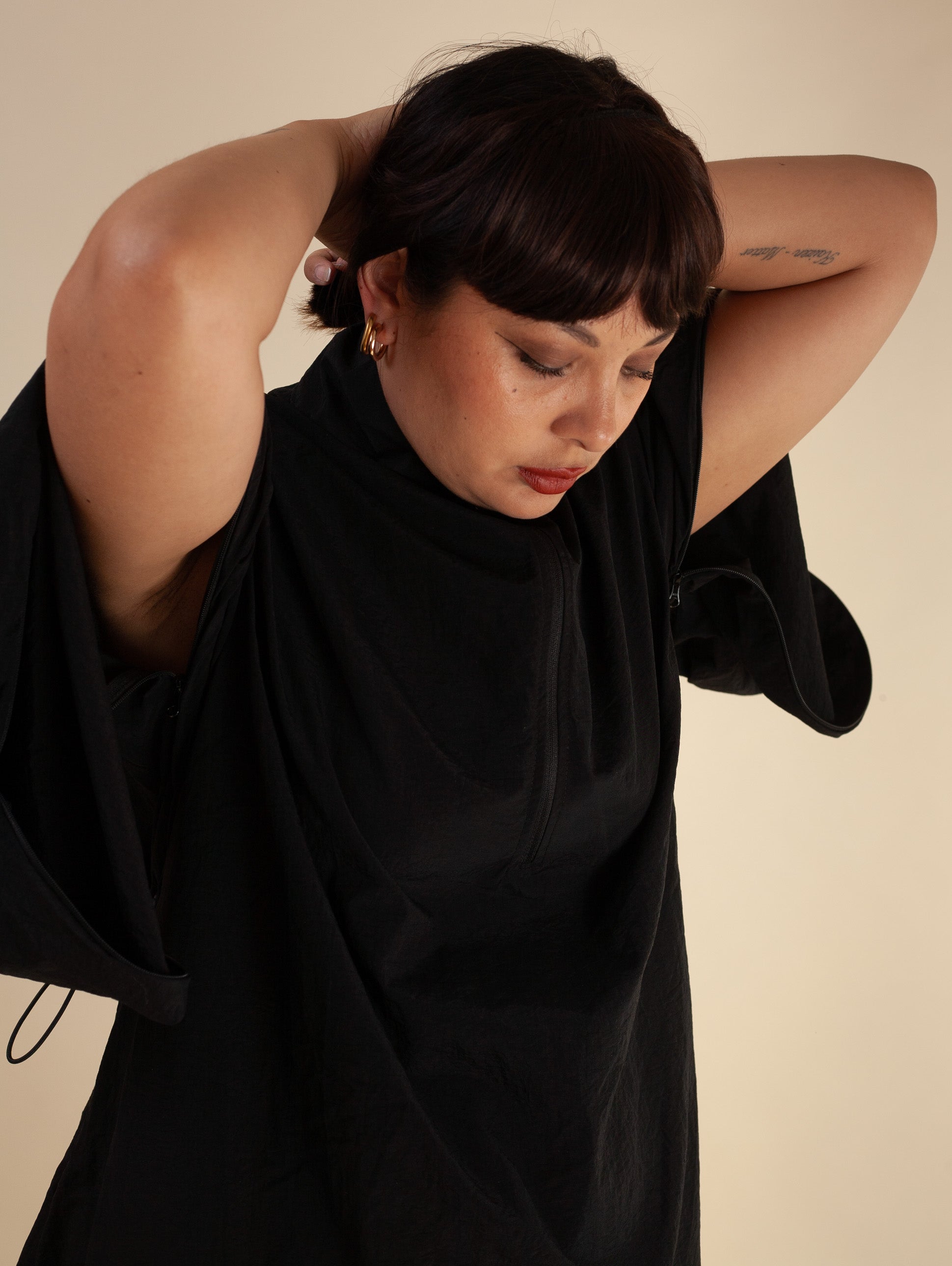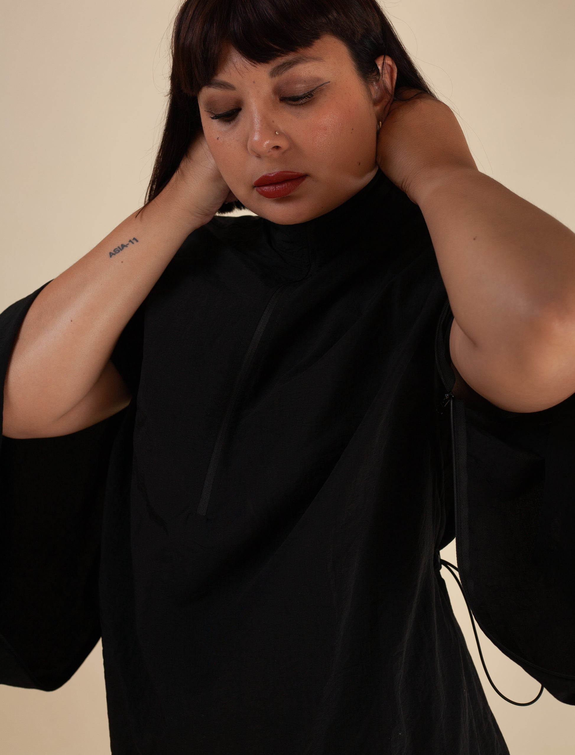 Made from superior quality technical fabric. It has a zip front turtle neck detail, long billowing sleeves with invisible zip closure details for trans-seasonal versatility. It also has an adjustable draw string back detail making it a comfortable everyday piece for a professional and relaxed look. It has an angelic flow as you walk and is slightly longer at the back than the front.