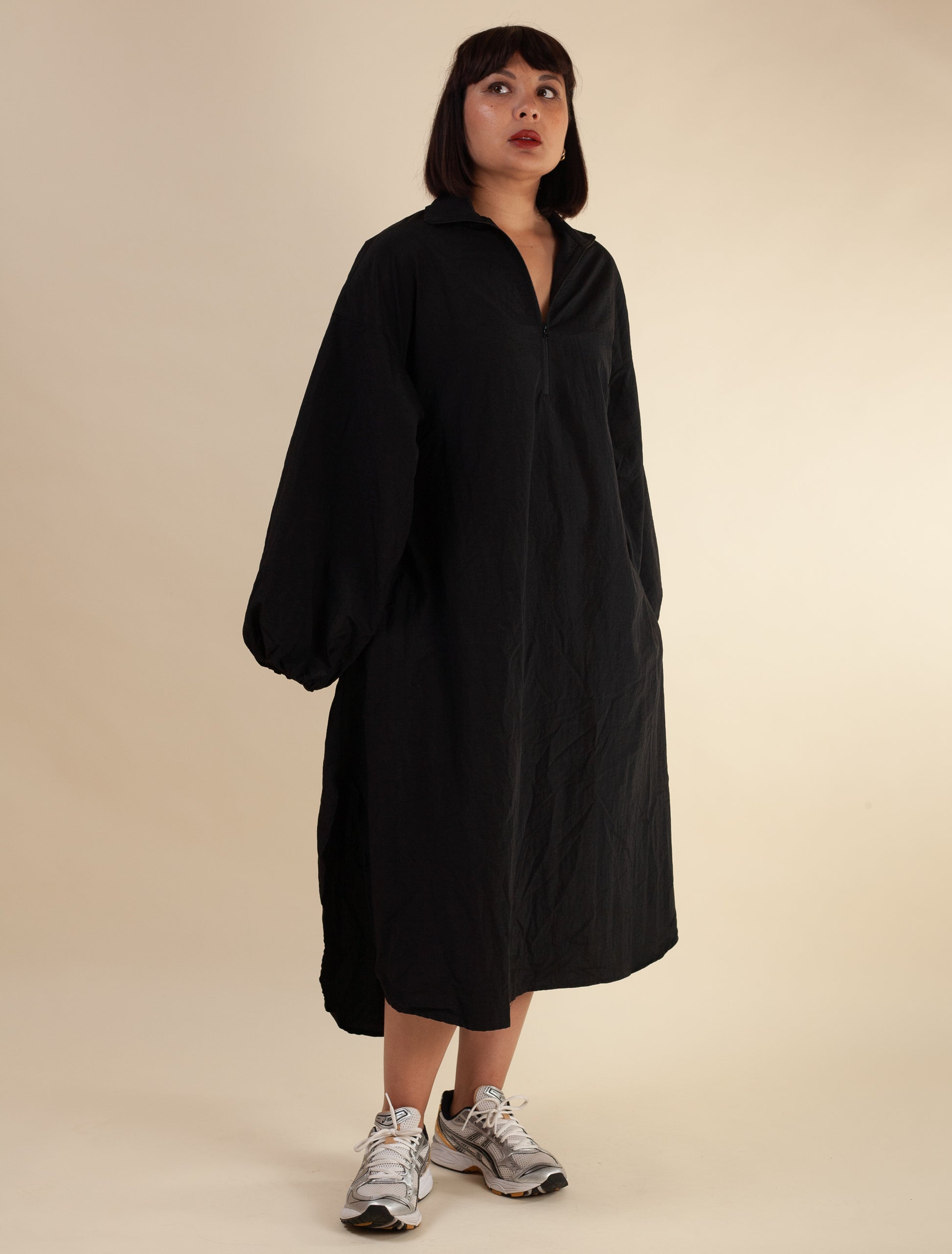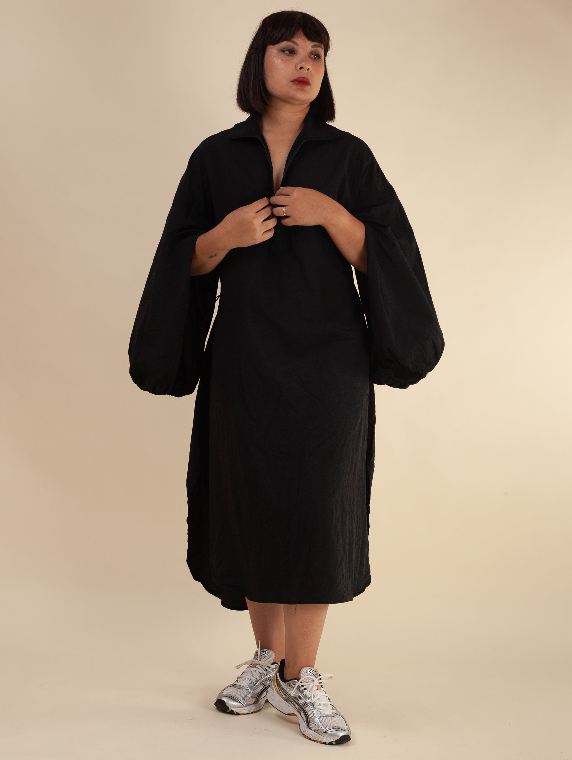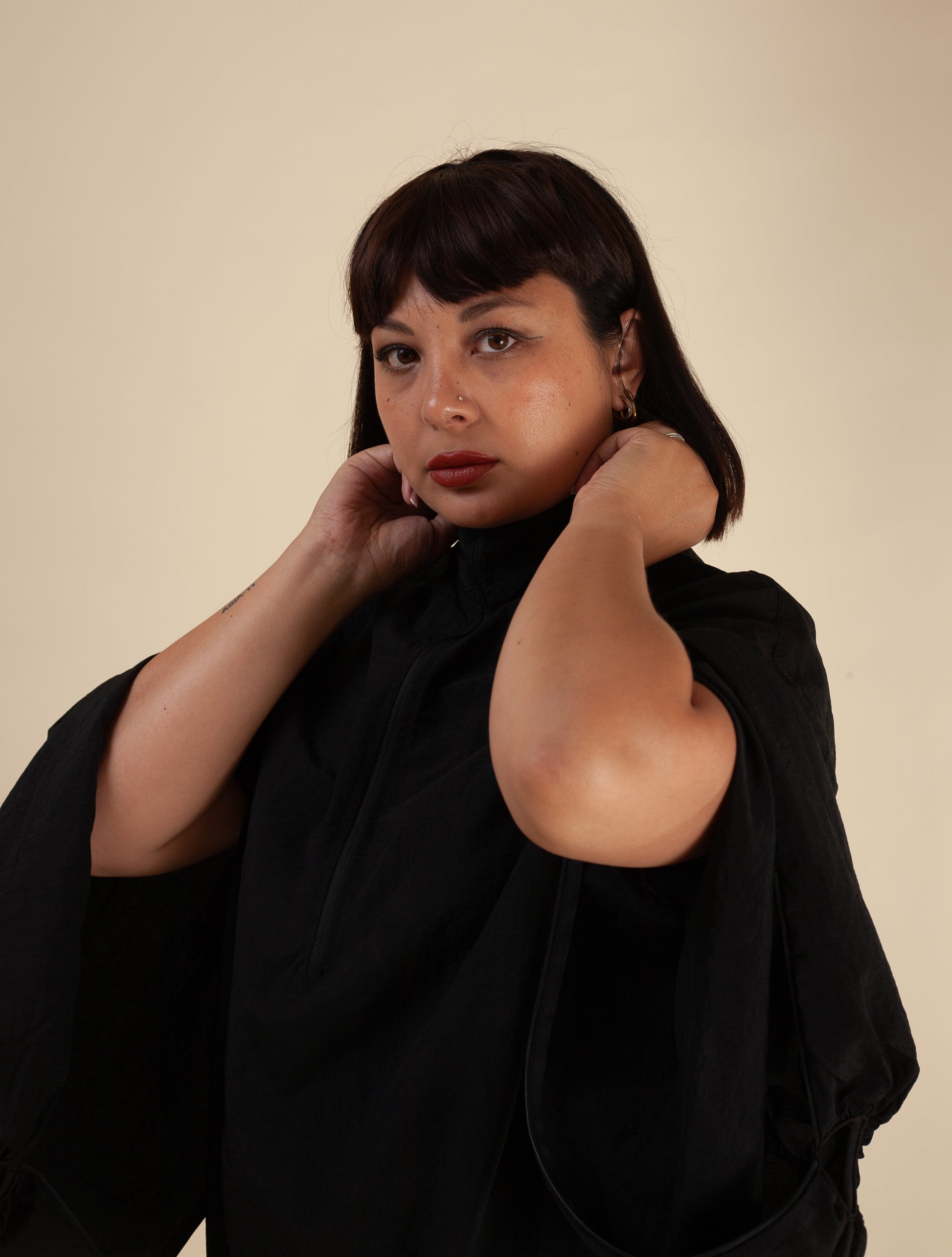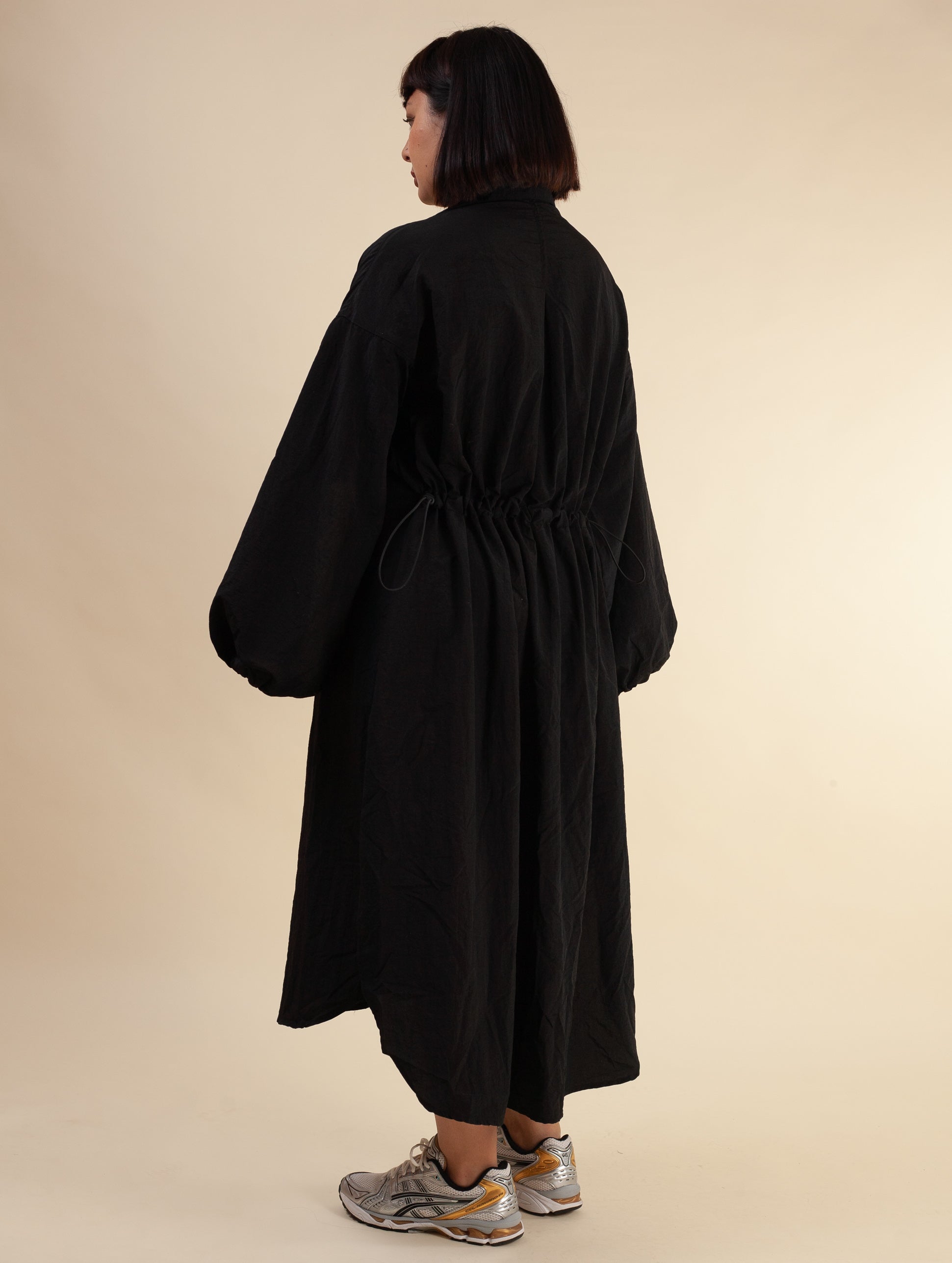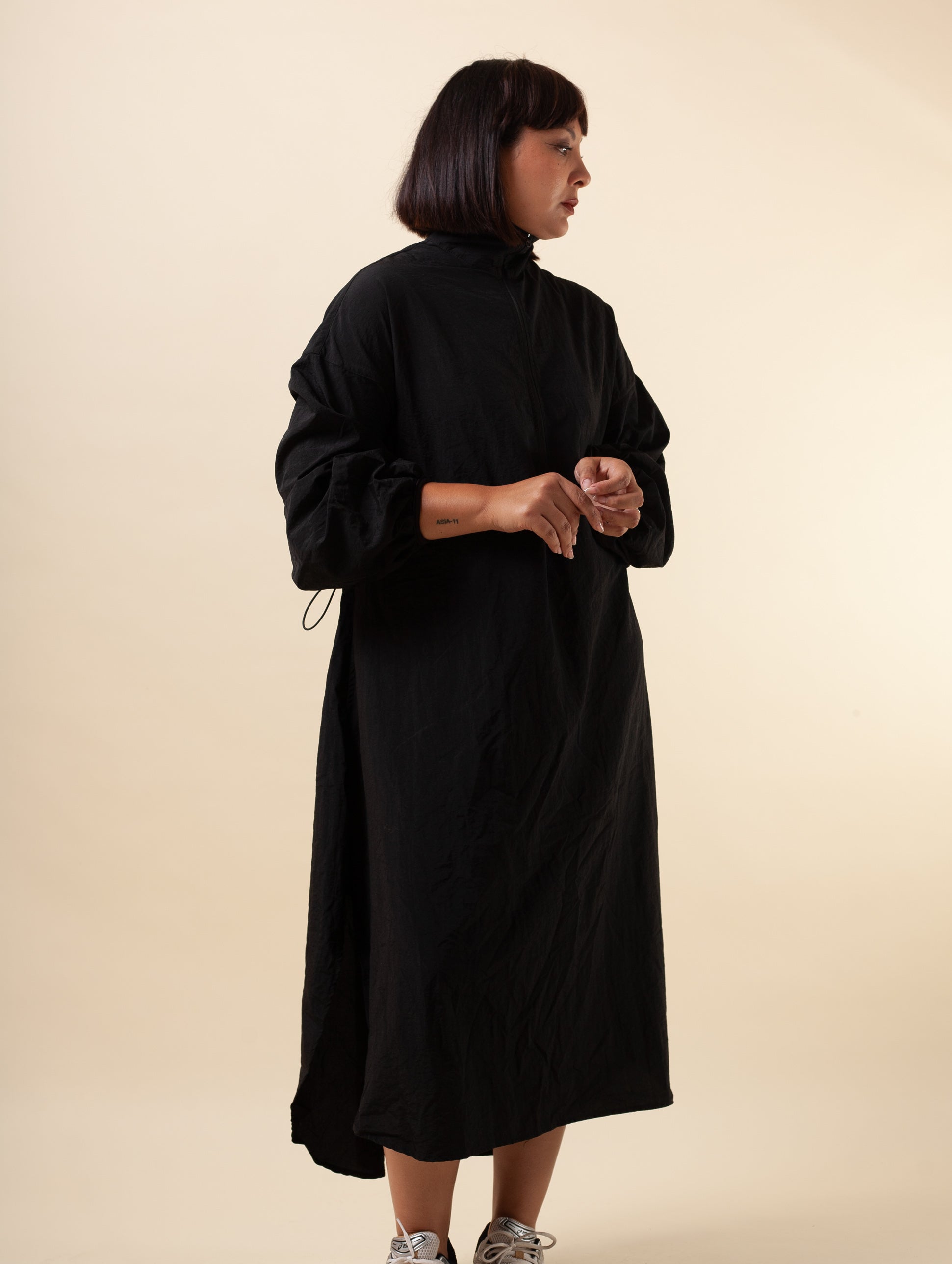 Made from superior quality technical fabric. It has a zip front turtle neck detail, long billowing sleeves with invisible zip closure details for trans-seasonal versatility. It also has an adjustable draw string back detail making it a comfortable everyday piece for a professional and relaxed look. It has an angelic flow as you walk and is slightly longer at the back than the front.