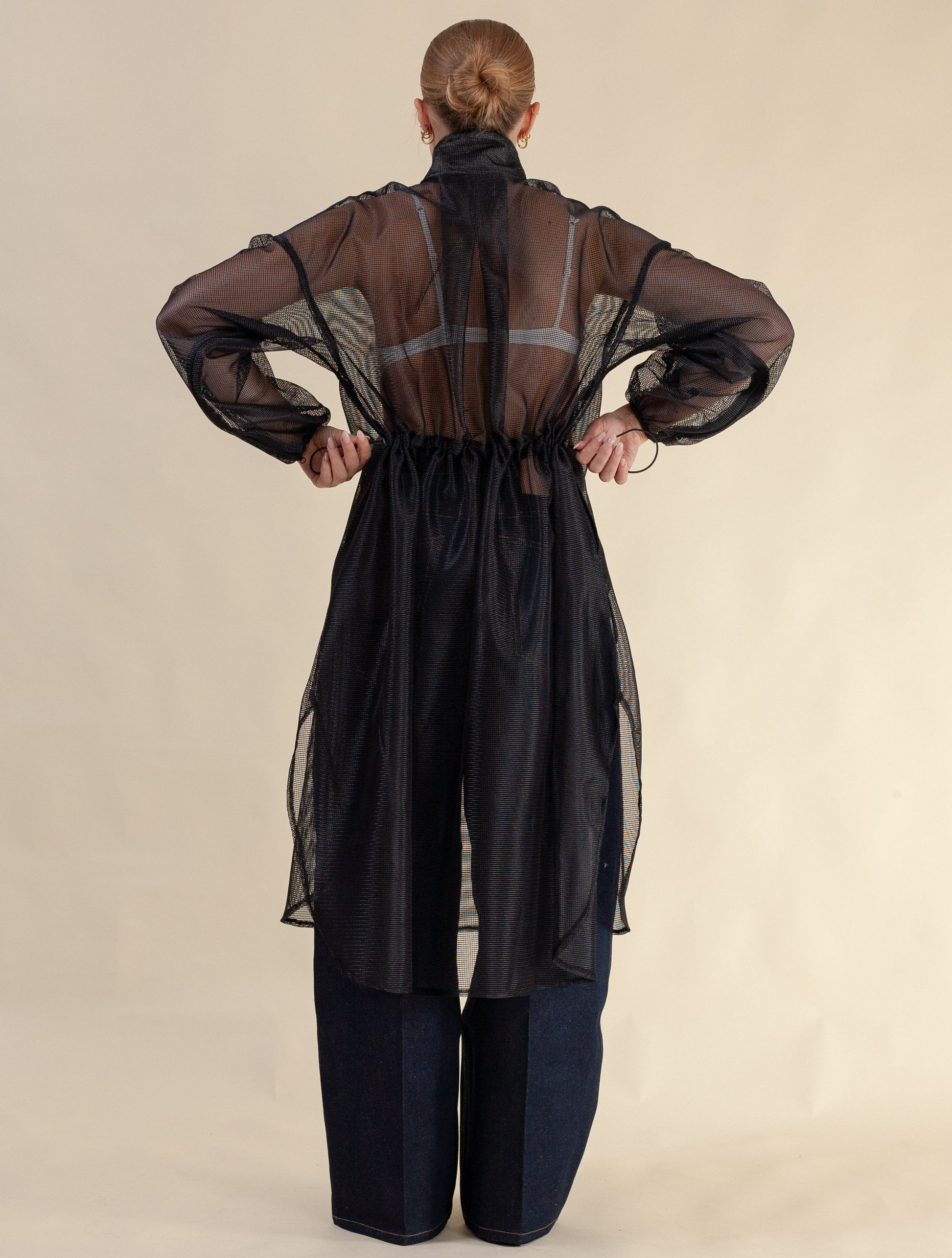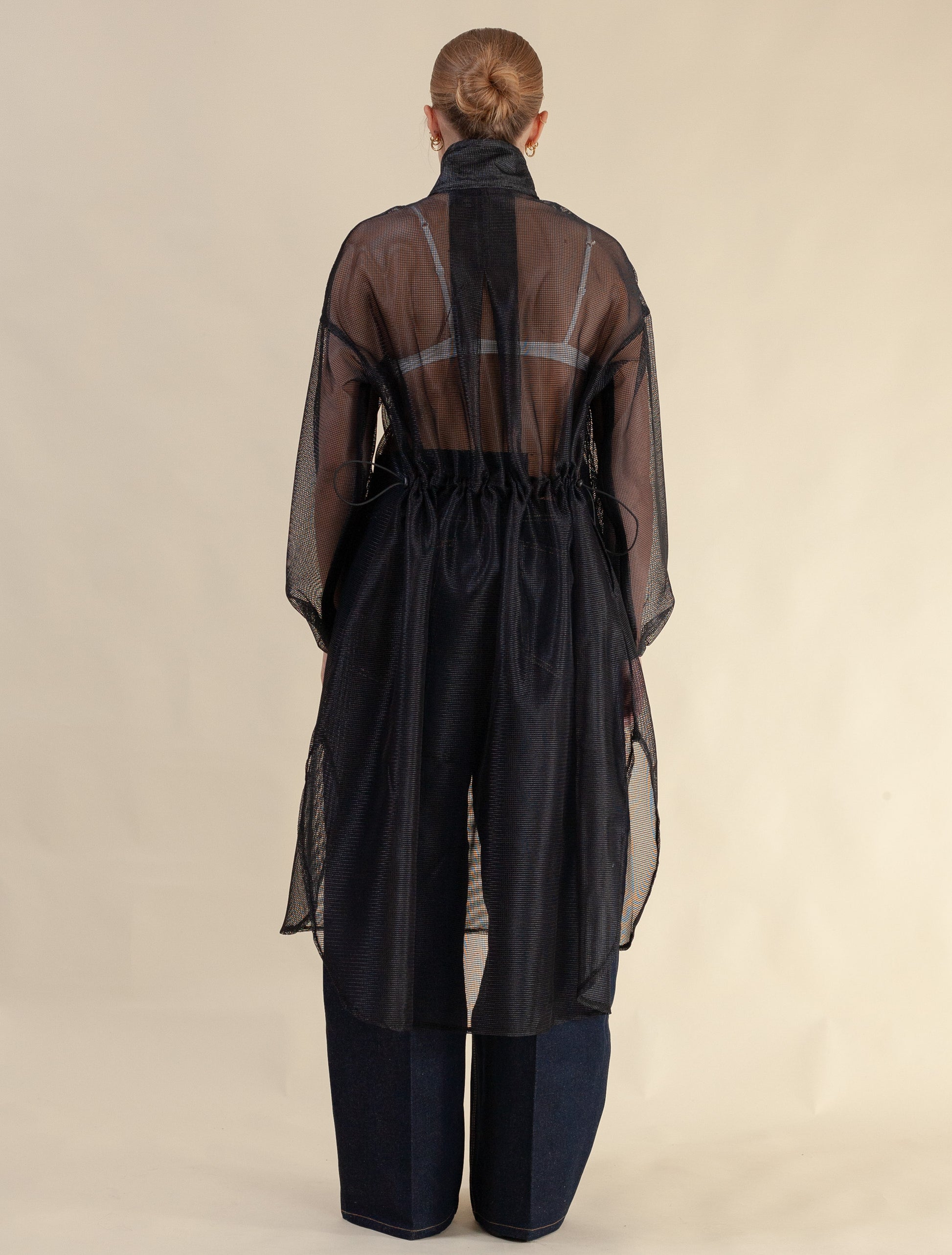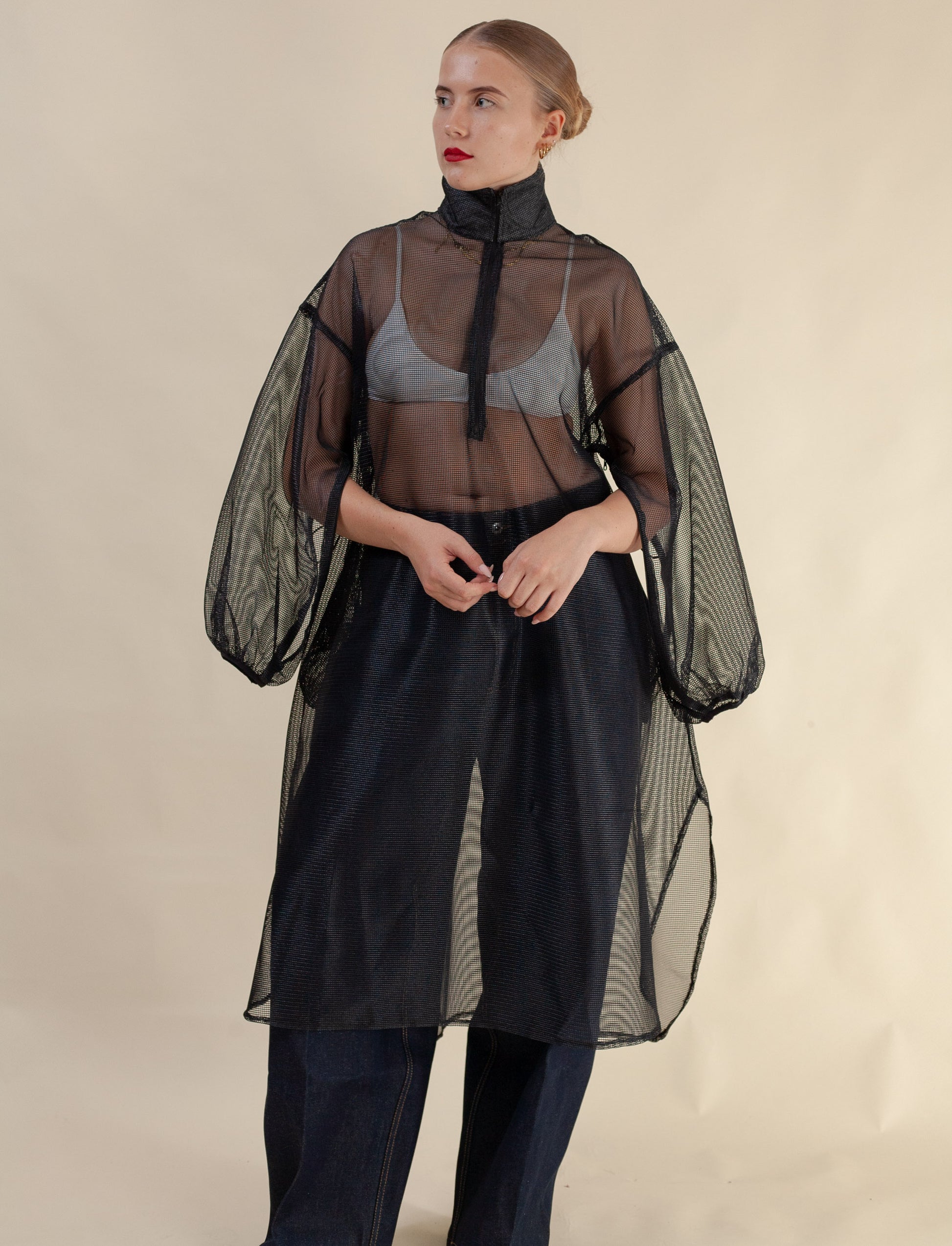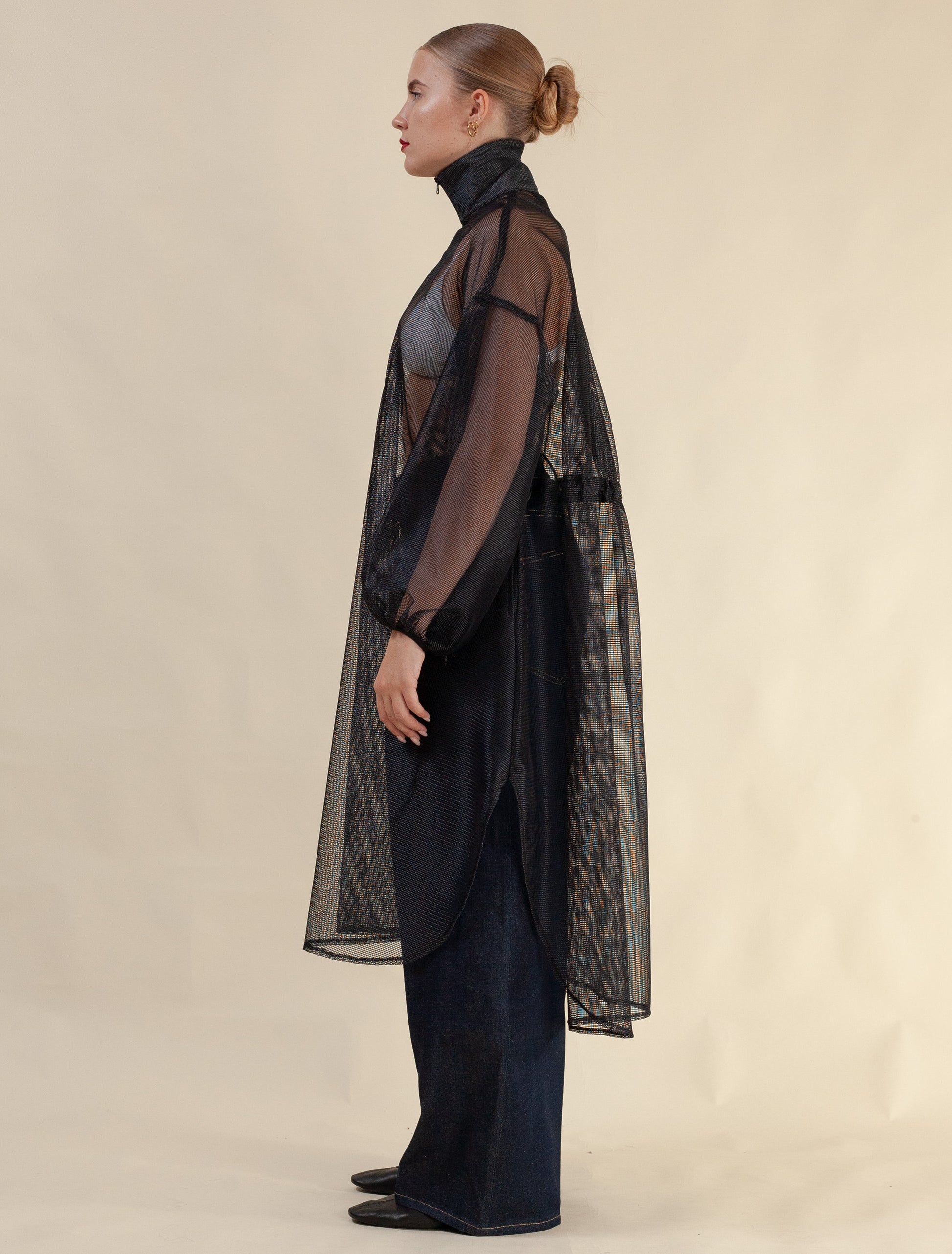 Made from superior quality technical Mesh. It has a zip front turtle neck detail, long billowing sleeves with invisible zip closure details for trans-seasonal versatility. It also has an adjustable draw string back detail making it a comfortable everyday piece for a professional and relaxed look. It has an angelic flow as you walk and is slightly longer at the back than the front.