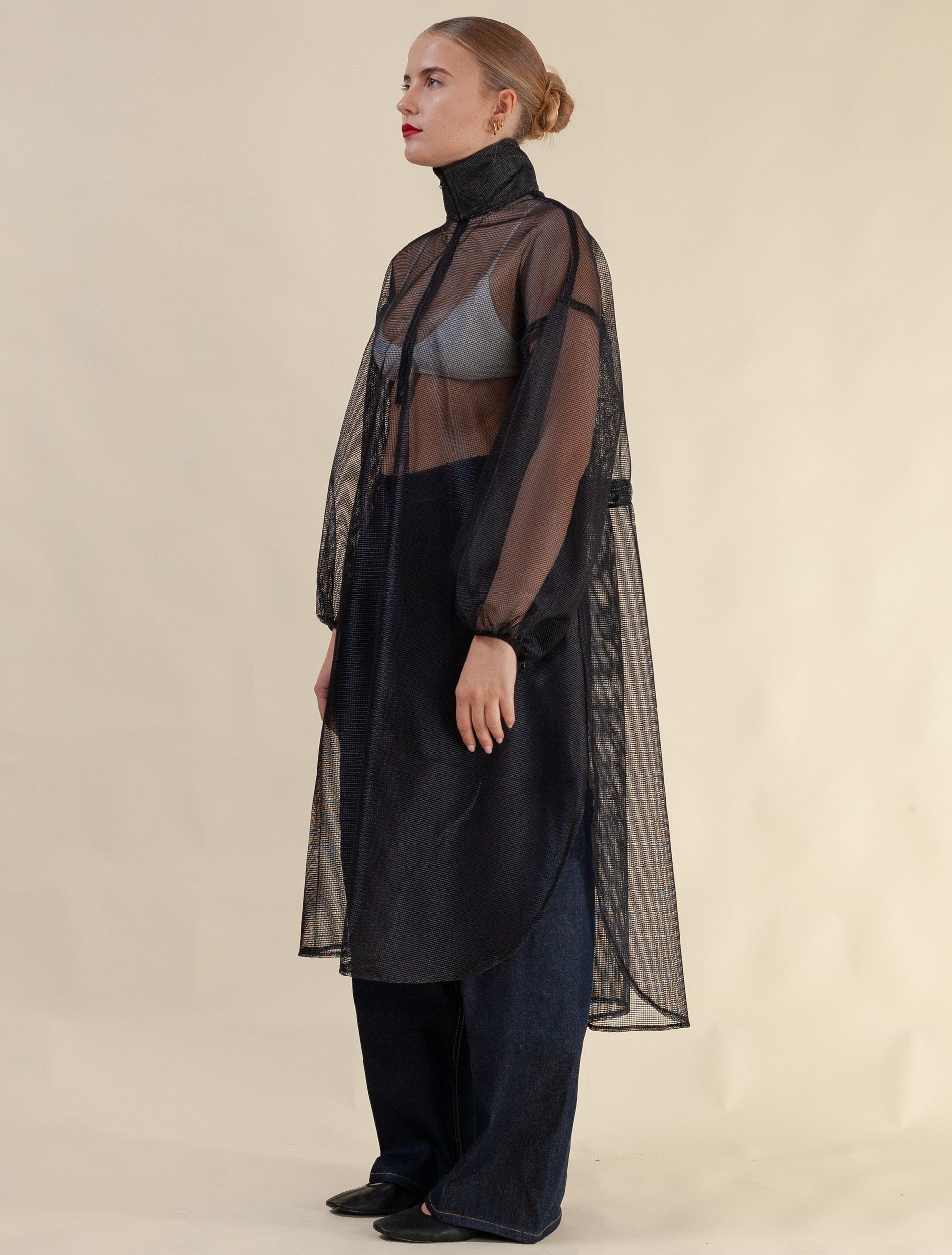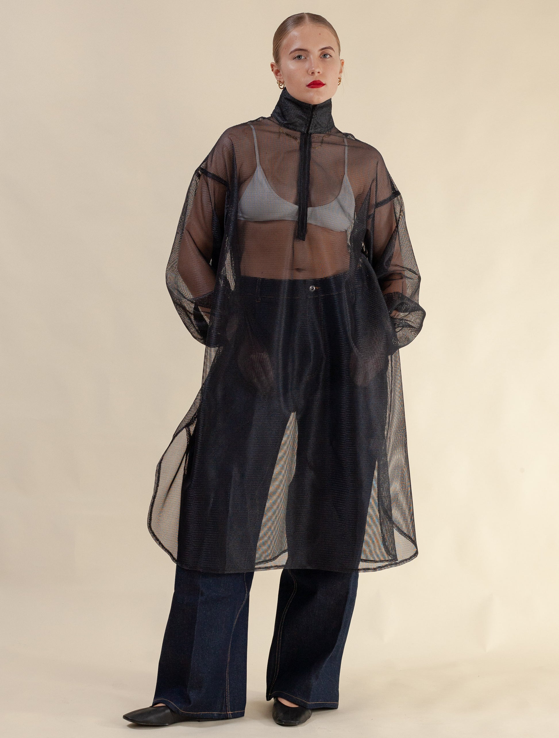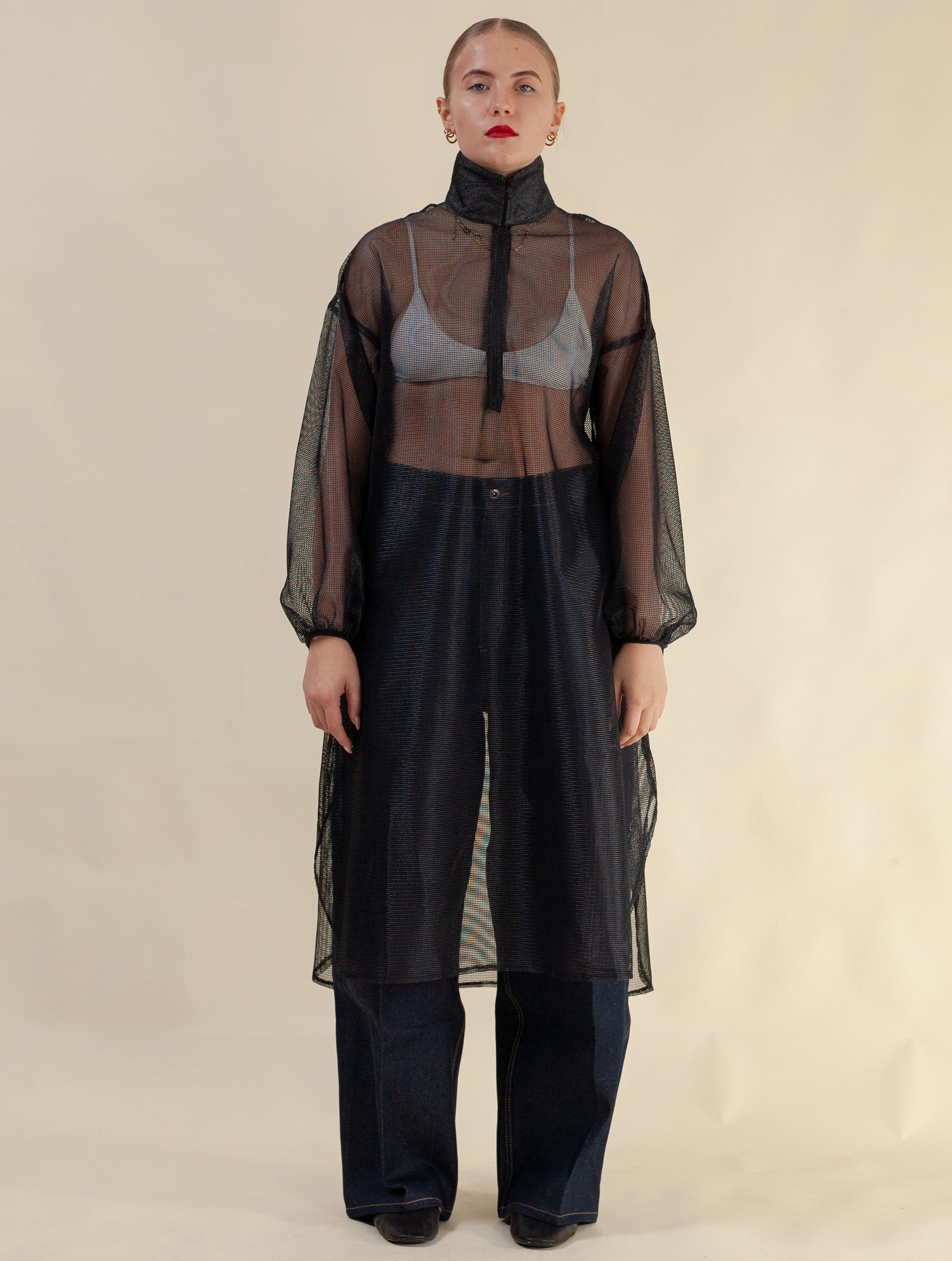 Made from superior quality technical Mesh. It has a zip front turtle neck detail, long billowing sleeves with invisible zip closure details for trans-seasonal versatility. It also has an adjustable draw string back detail making it a comfortable everyday piece for a professional and relaxed look. It has an angelic flow as you walk and is slightly longer at the back than the front.