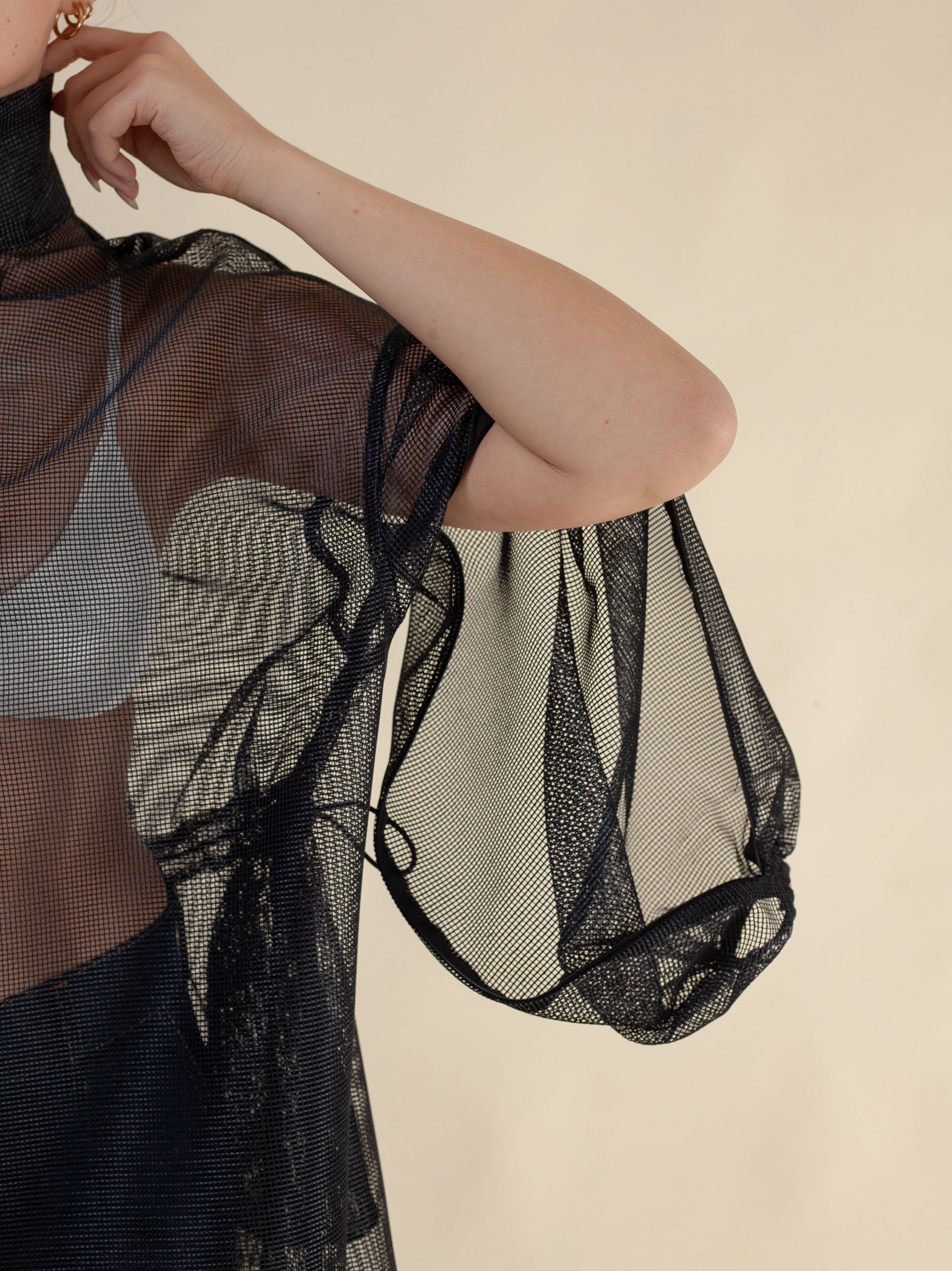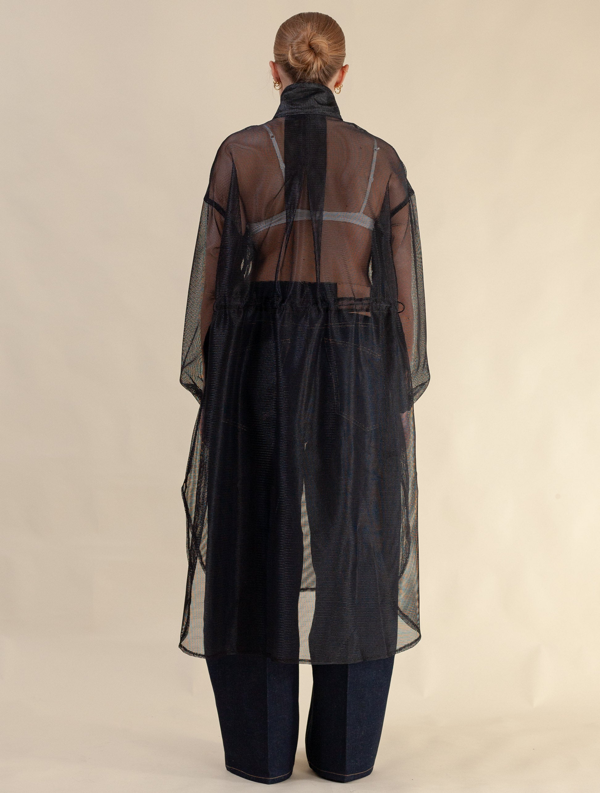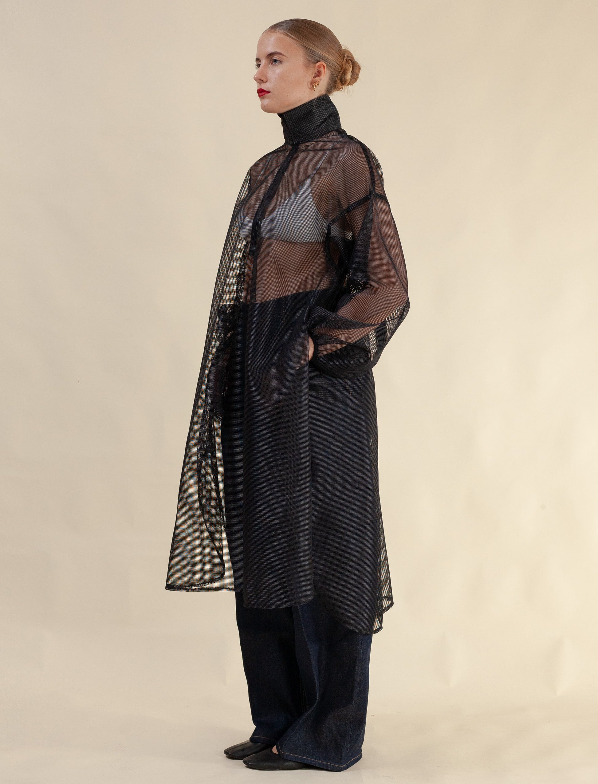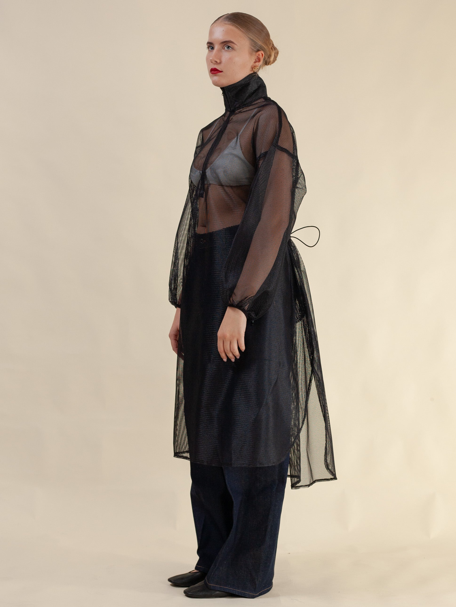 Made from superior quality technical Mesh. It has a zip front turtle neck detail, long billowing sleeves with invisible zip closure details for trans-seasonal versatility. It also has an adjustable draw string back detail making it a comfortable everyday piece for a professional and relaxed look. It has an angelic flow as you walk and is slightly longer at the back than the front.
