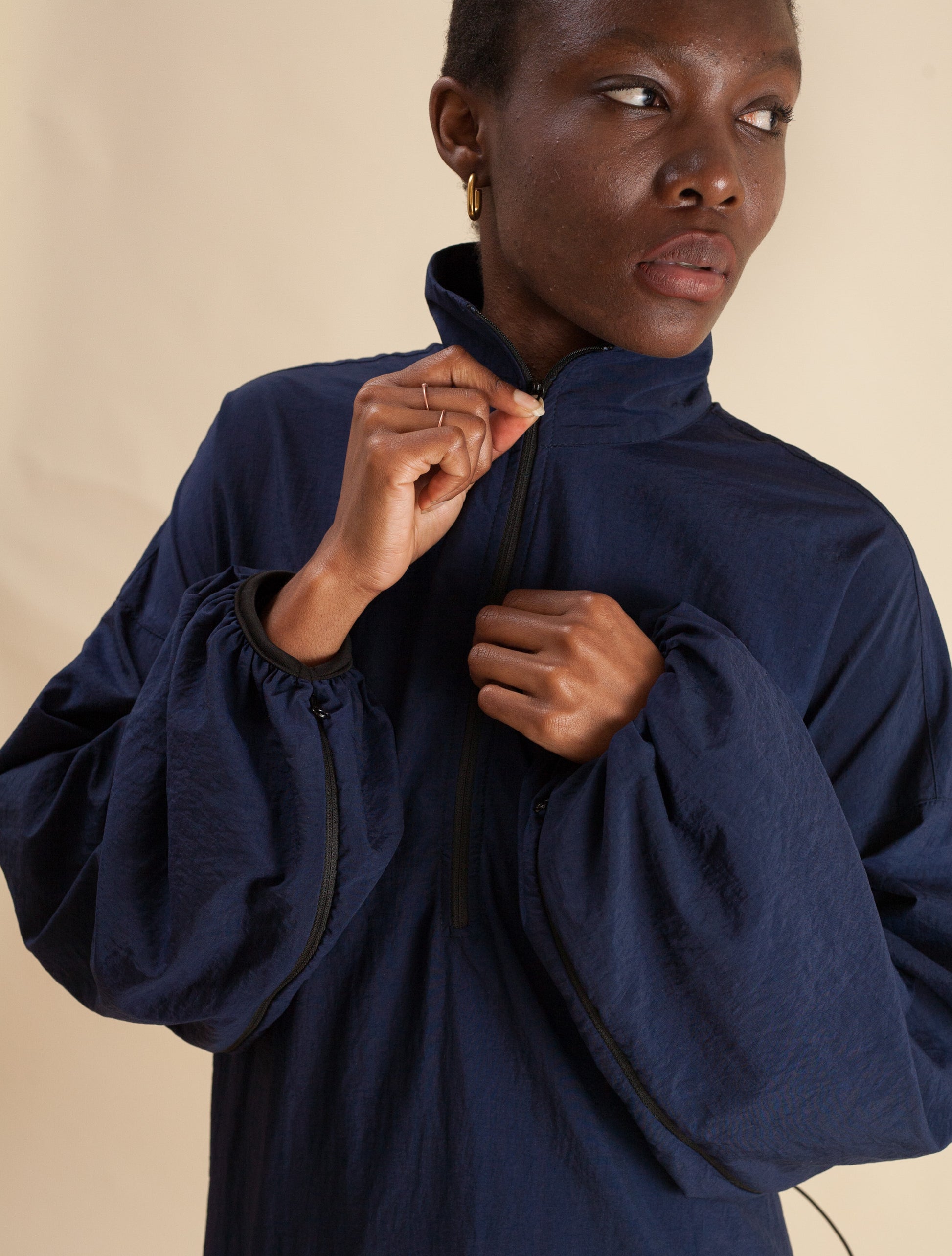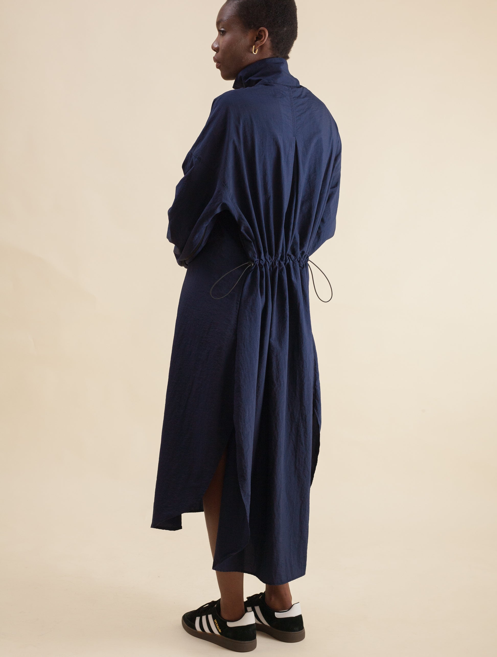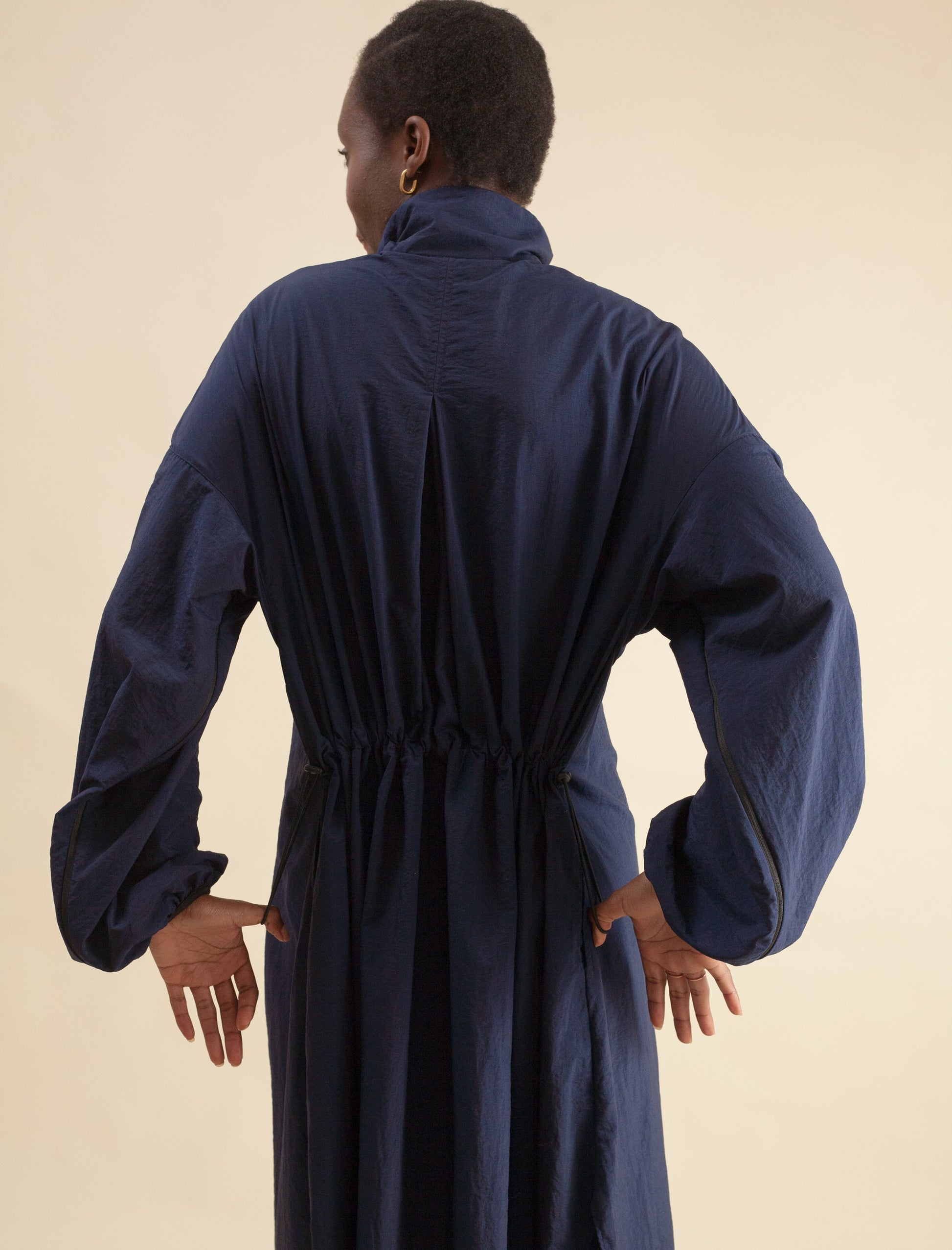 Made from superior quality technical fabric. It has a zip front turtle neck detail, long, billowing sleeves with invisible zip closure details for trans-seasonal versatility. It also has an adjustable draw string back detail making it a comfortable everyday piece for a professional and relaxed look. It has an angelic flow as you walk with it being slightly dropped at the back.