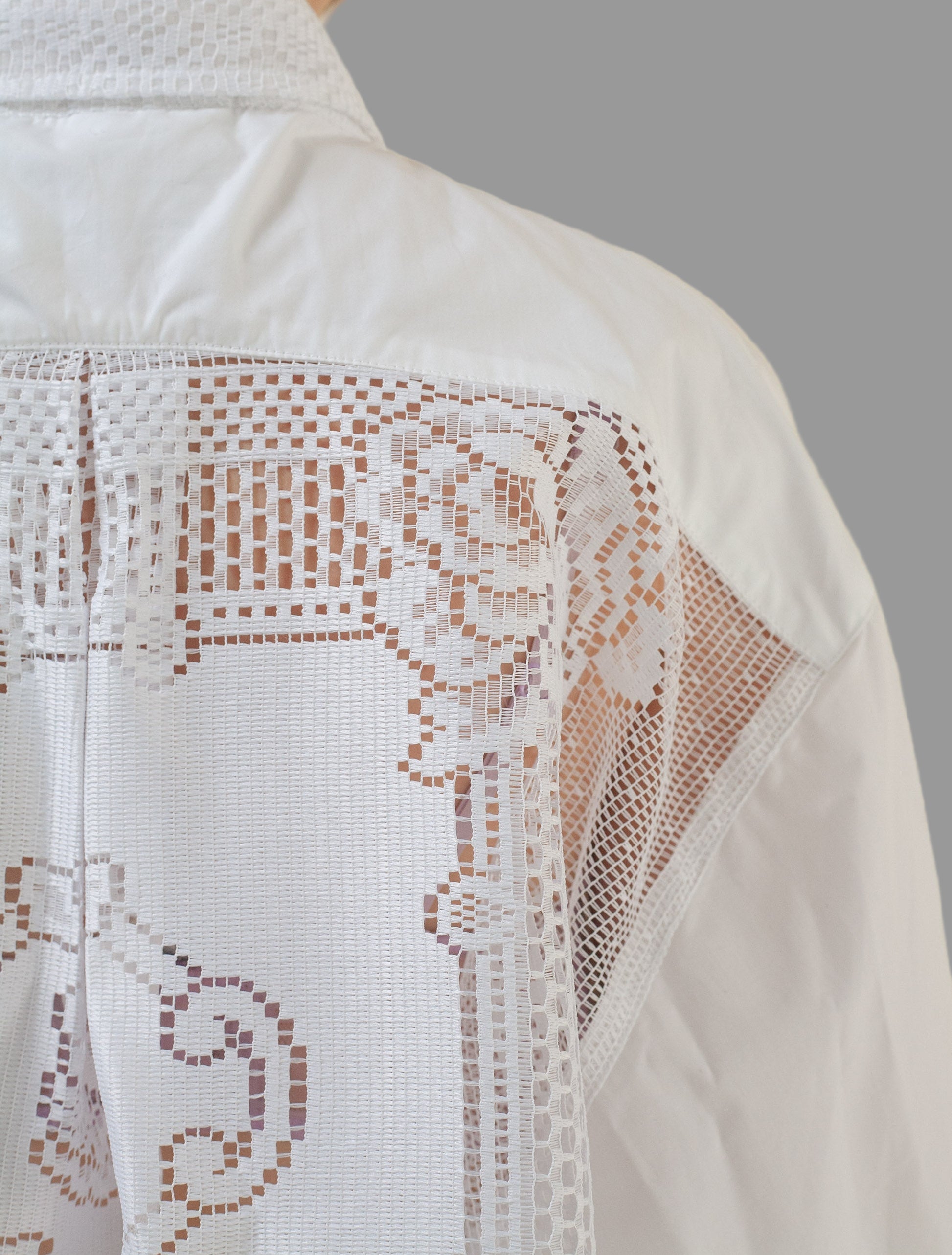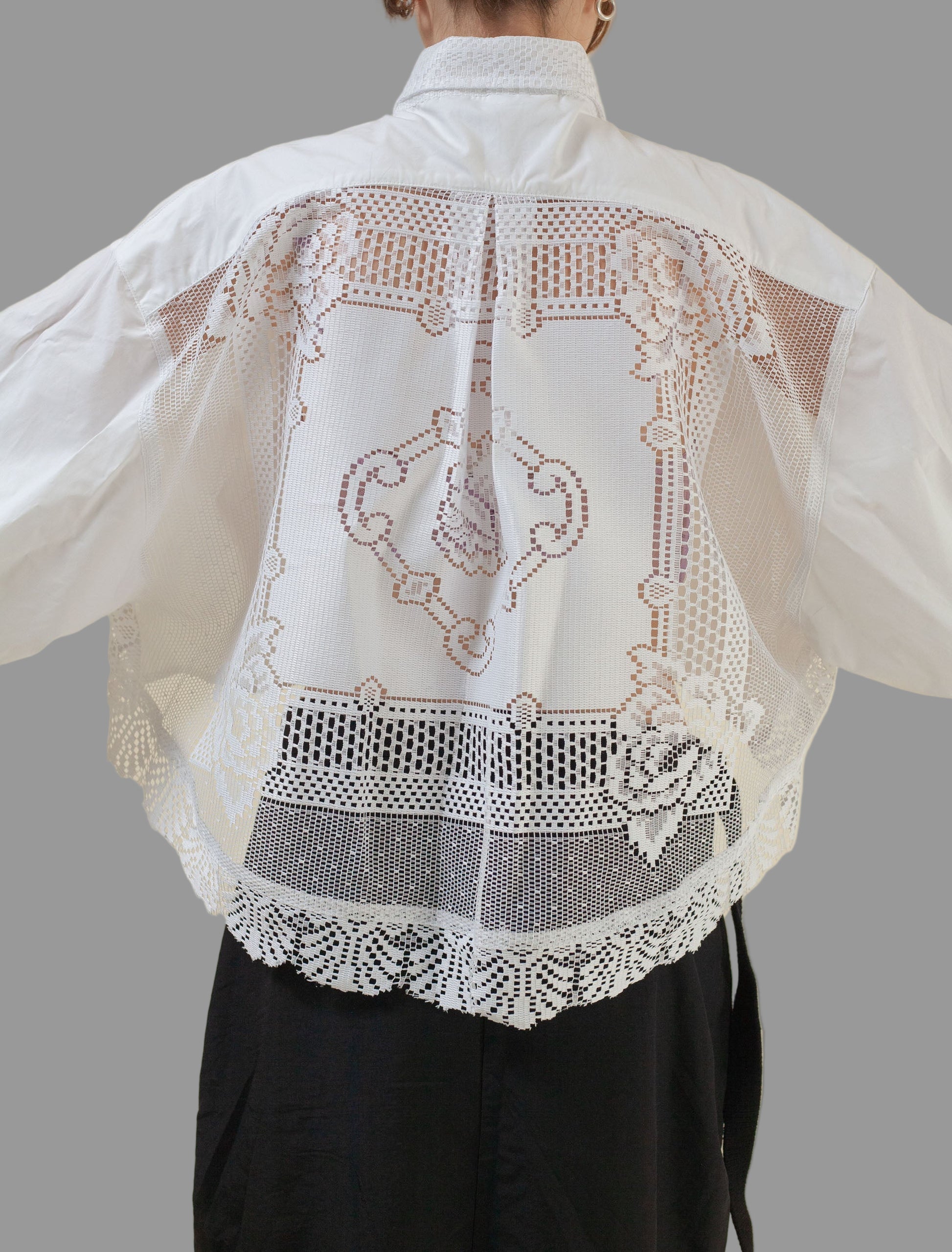 Made from Cotton Poplin as the body of the shirt with the back details being entirely lace with scallops at the bottom with lace detail cuff sleeves. The Shirt is a comfortable minimalist, everyday essential, made with the utmost care to detail and dropped back. It is oversized and relaxed fit and inclusive of many different body types.