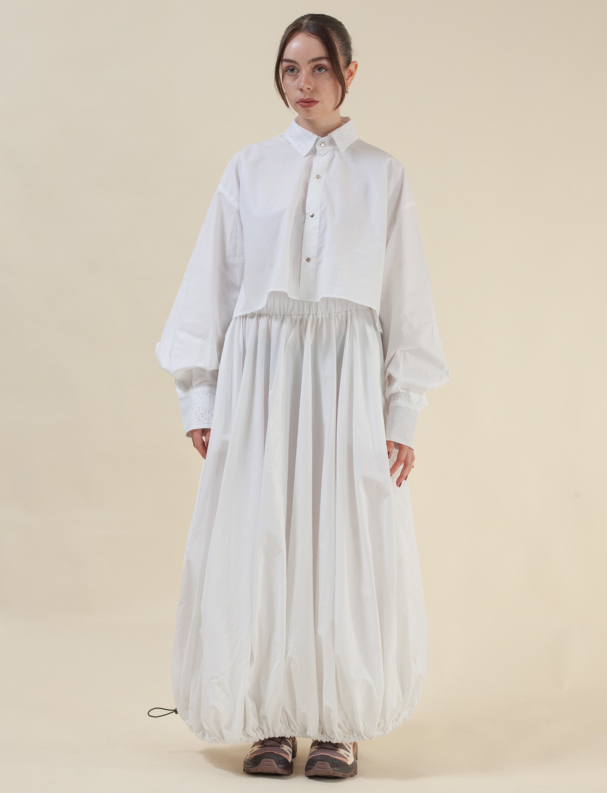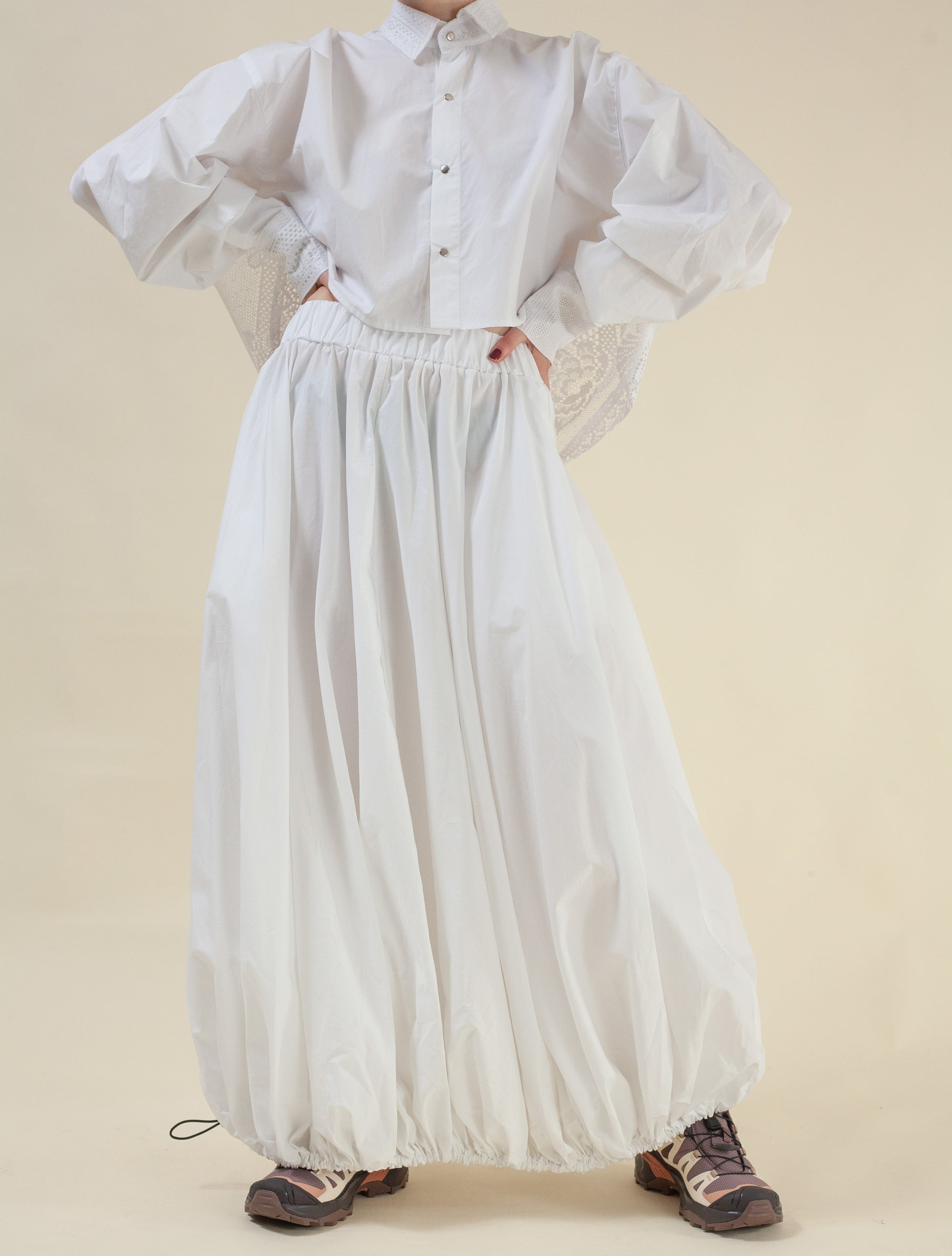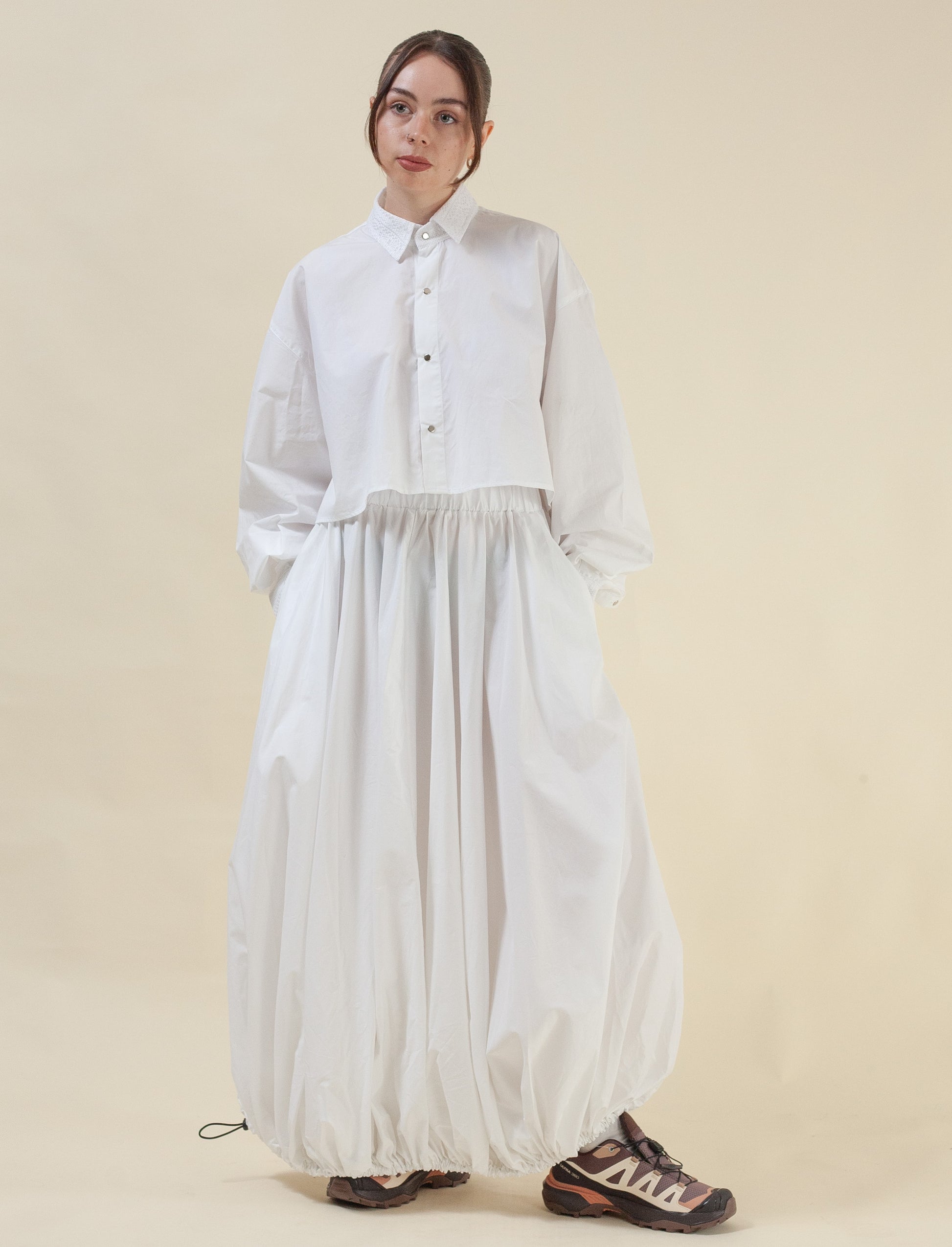 Made from Cotton Poplin (300 thread count). The ultimate Summer or Winter Skirt with draw-string pull detail at the bottom to allow for more volume. It has an elastic finish at waist for comfort and 2 pockets. Wear with slip-ons, sneakers for the ultimate modular look.