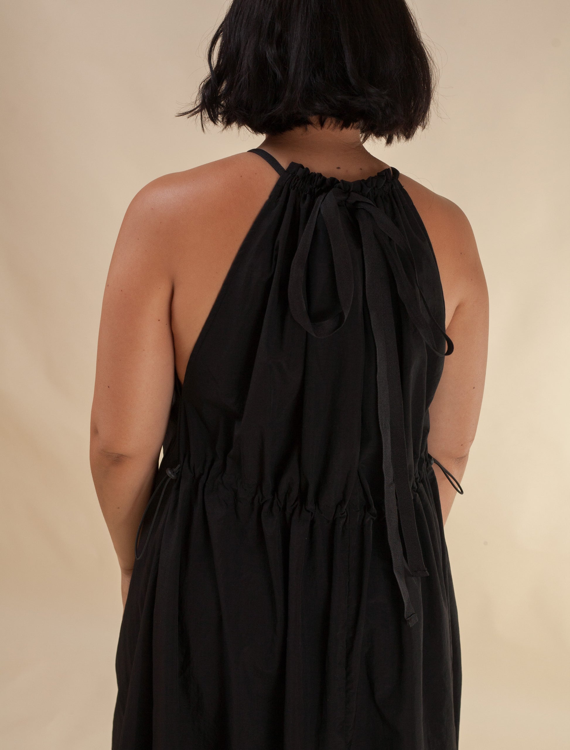 Made from Superior Quality Technical Fabric. The ultimate Summer Halter Dress. It has an adjustable ribbon detail at the top which pleats the fabric with relaxed drop until mid-calf with two side slits. It also has an adjustable draw-string and toggle finish at the back at the waist for shaping however you like, making it versatile to wear on those long, hot days. The arm hole is cut further down for size inclusivity and comfort.
