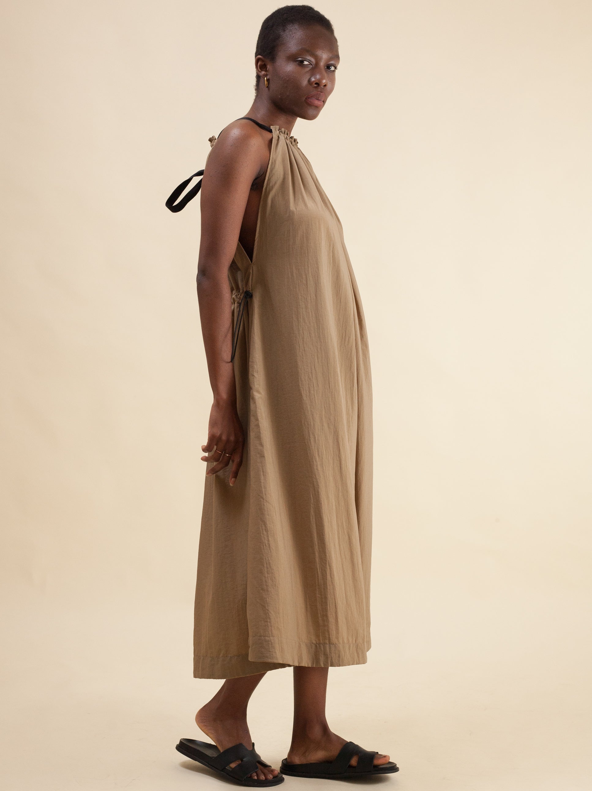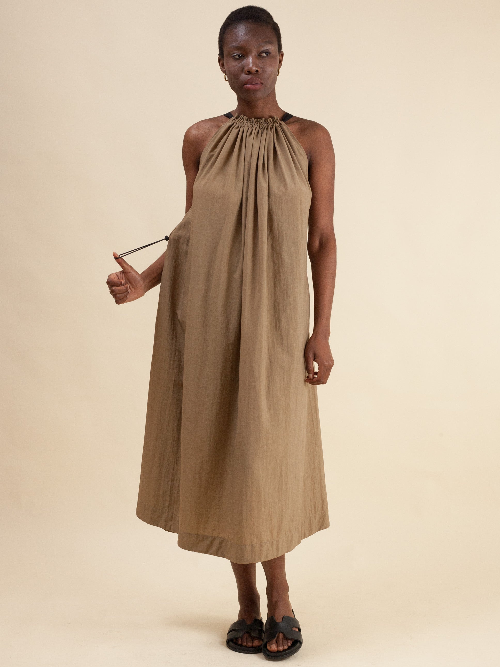 Made from Superior Quality Technical Fabric. The ultimate Summer Halter Dress. It has an adjustable ribbon detail at the top which pleats the fabric with relaxed drop until mid-calf with two side slits. It also has an adjustable draw-string and toggle finish at the back at the waist for shaping however you like, making it versatile to wear on those long, hot days. The arm hole is cut low down for size inclusivity and comfort.