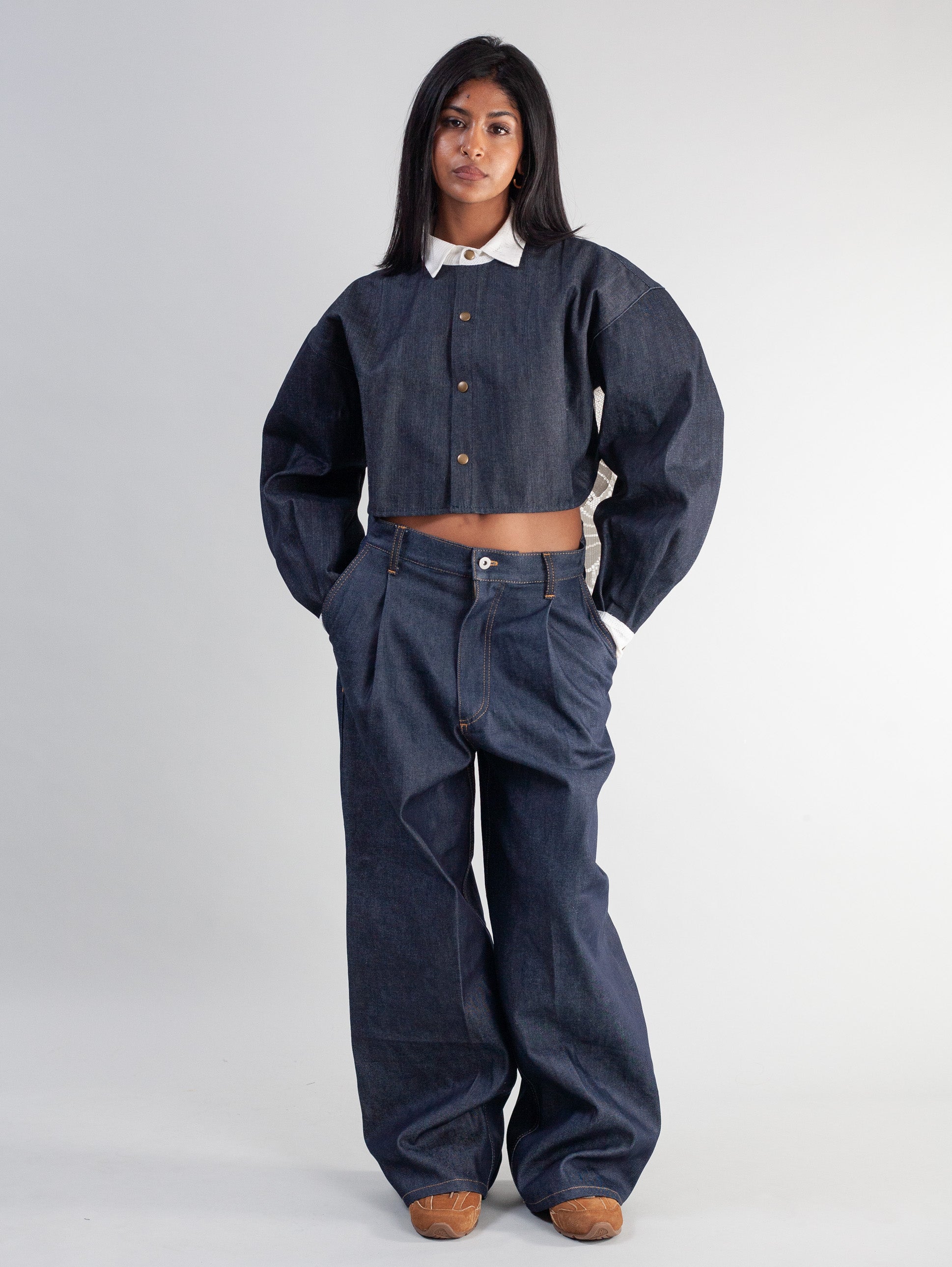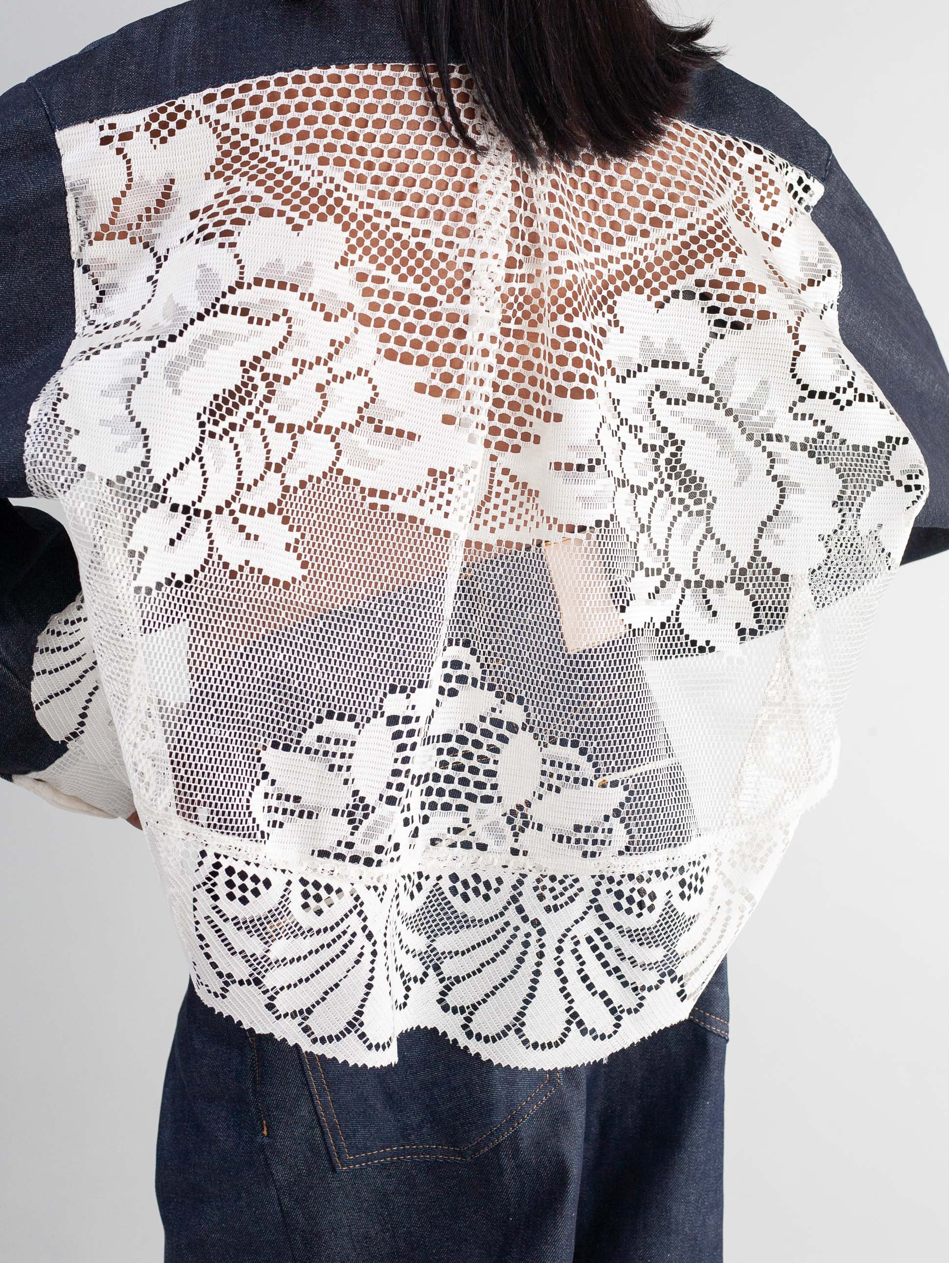 This versatile cropped jacket combines premium Japanese denim with an elegant lace back panel, creating a sophisticated piece that transcends seasonal trends. Designed with meticulous attention to construction details and a thoughtfully dropped hemline, it delivers both comfort and refined aesthetics. The relaxed, oversized silhouette accommodates diverse body types while maintaining a polished appearance, making it an indispensable layering piece for any discerning wardrobe.
