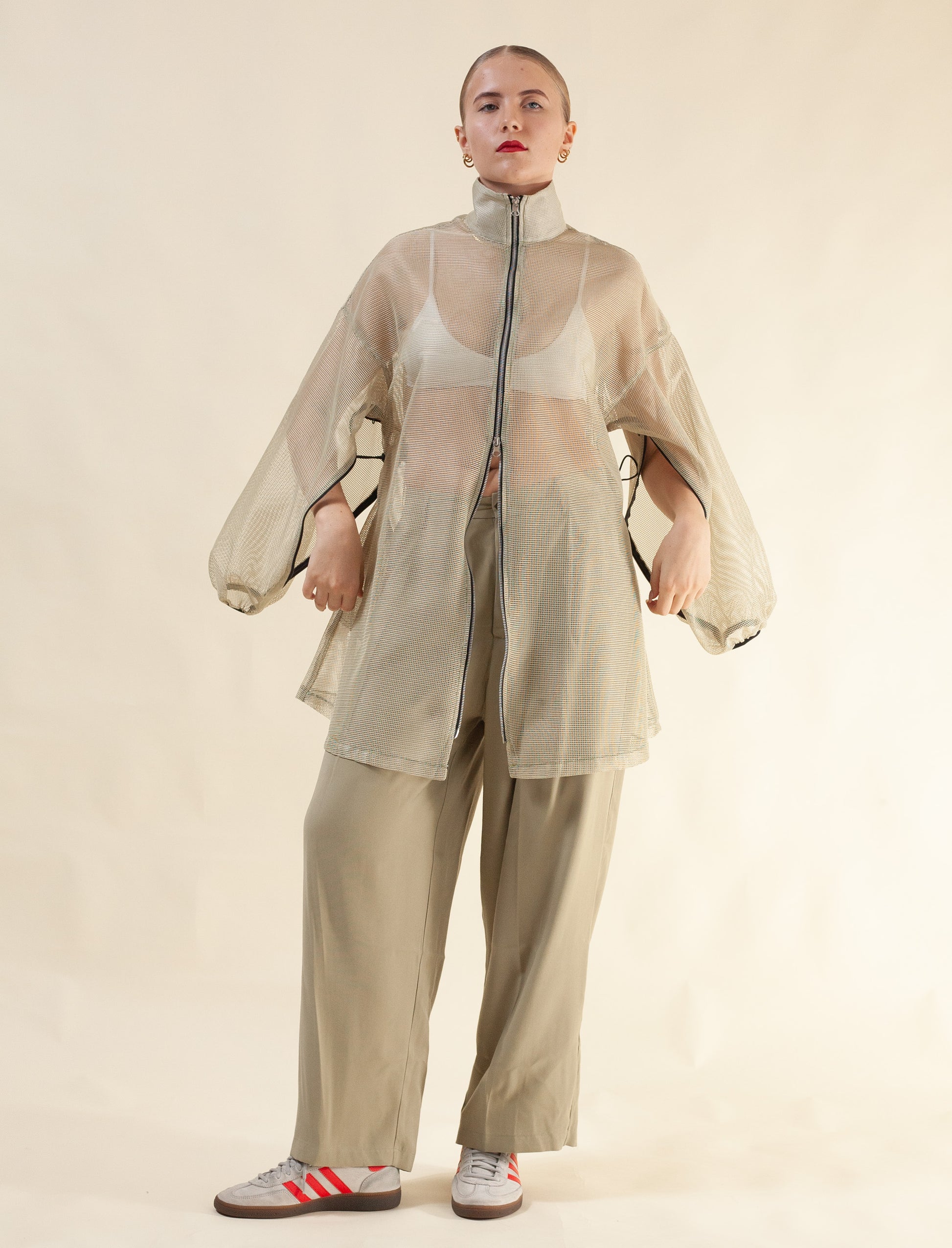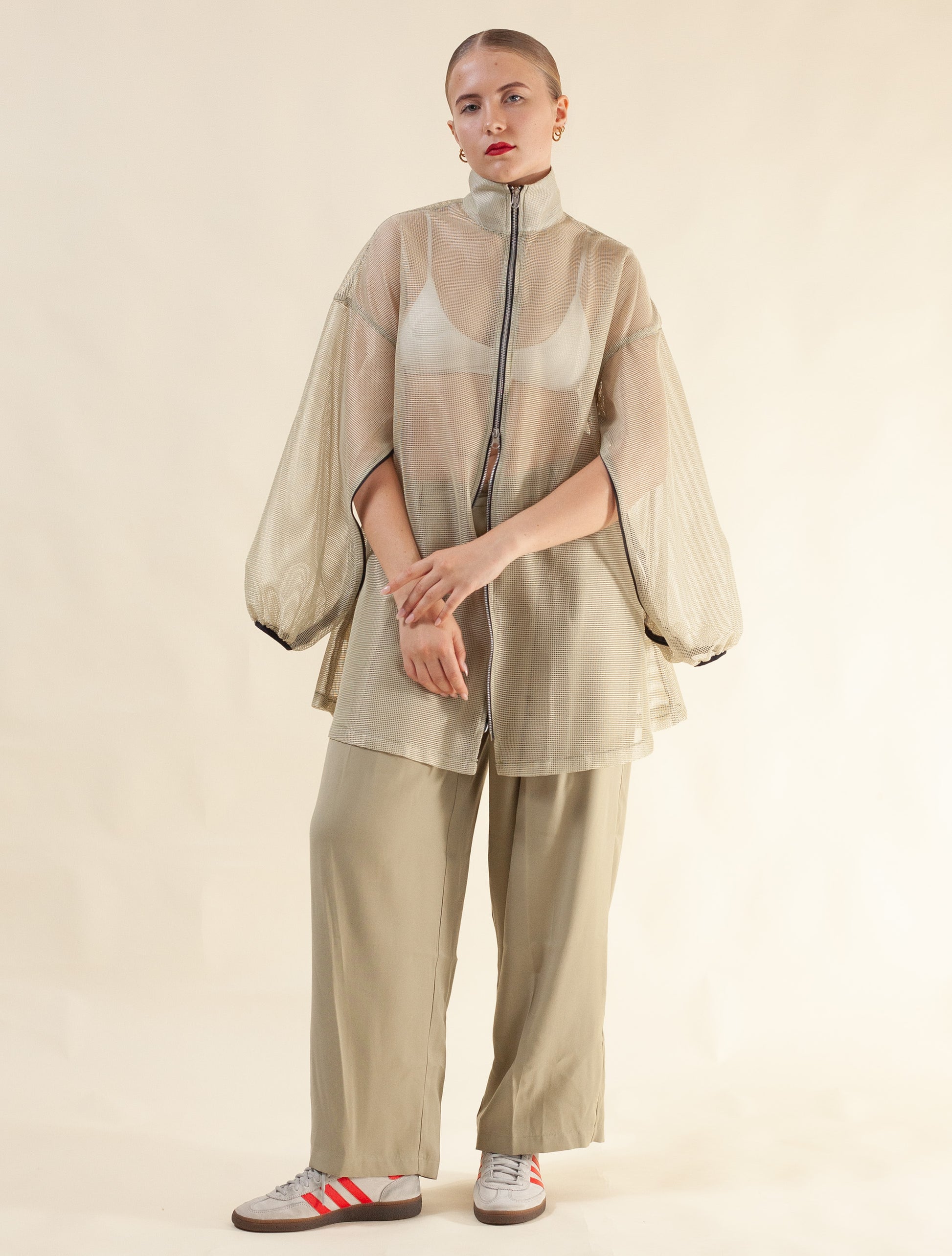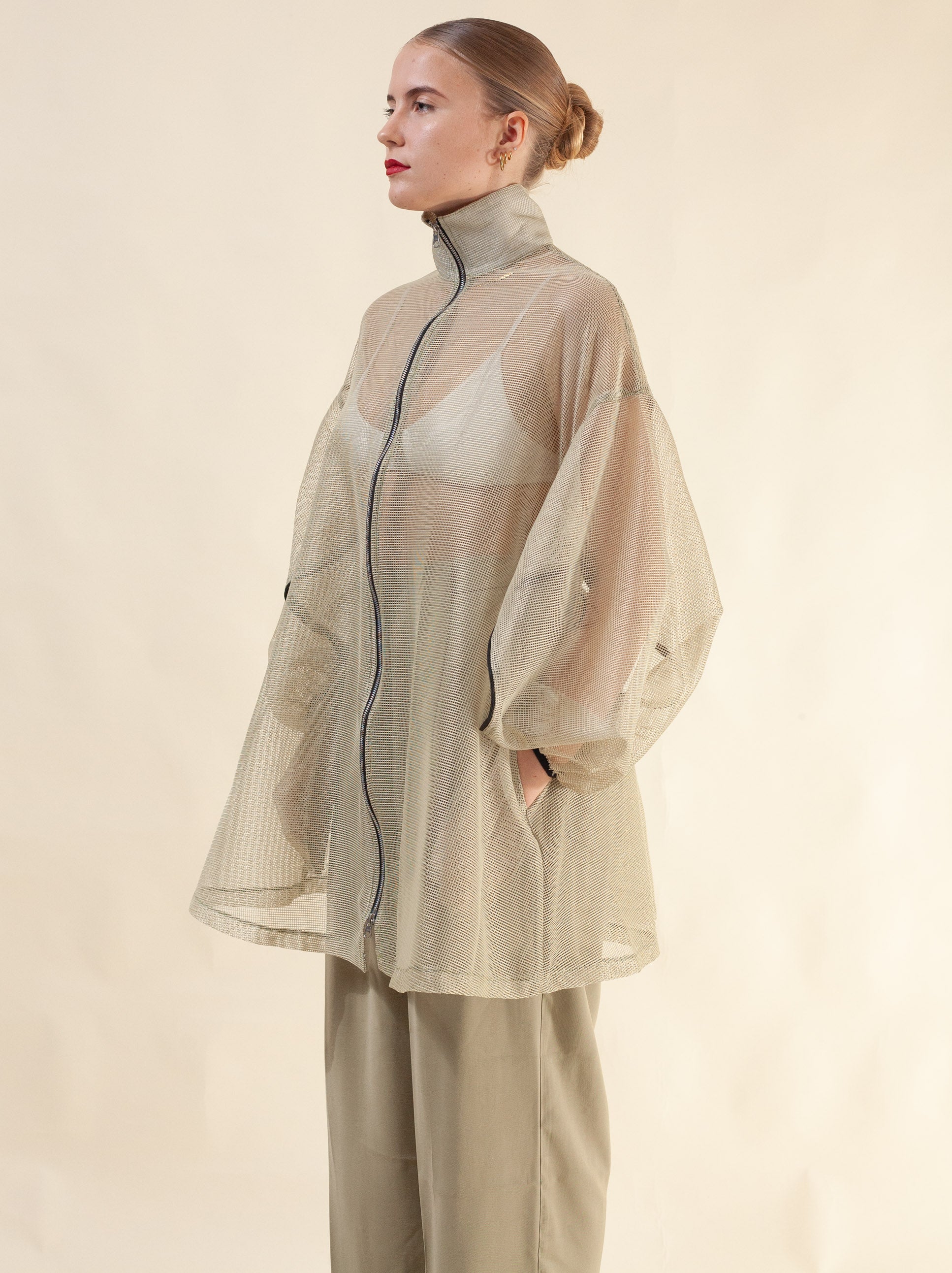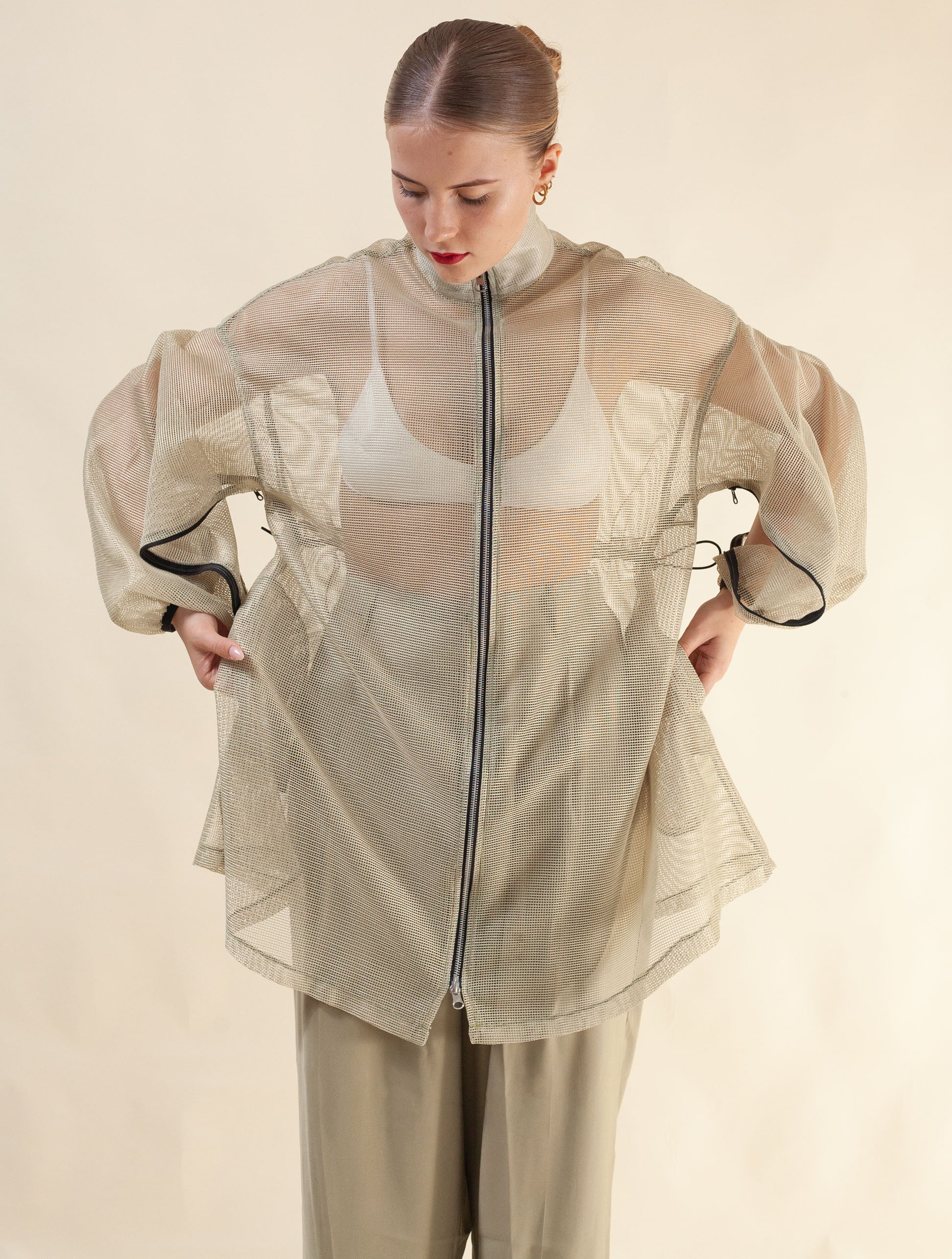 Made from superior quality technical mesh fabric. It has a double zip detail, long billowing sleeves with invisible zip closure details for trans-seasonal versatility. It also has an adjustable draw string back detail making it a comfortable everyday piece for a professional and relaxed look.