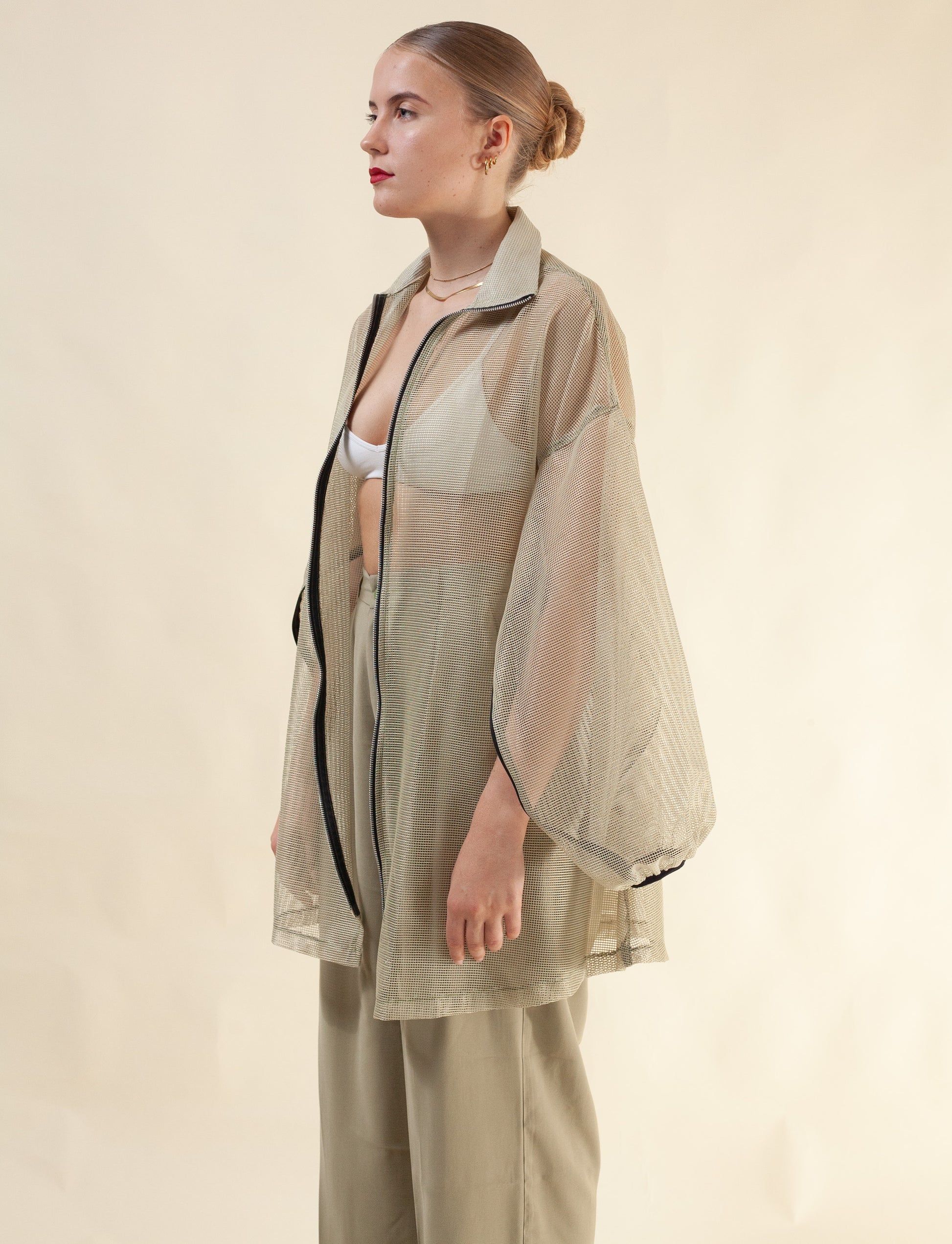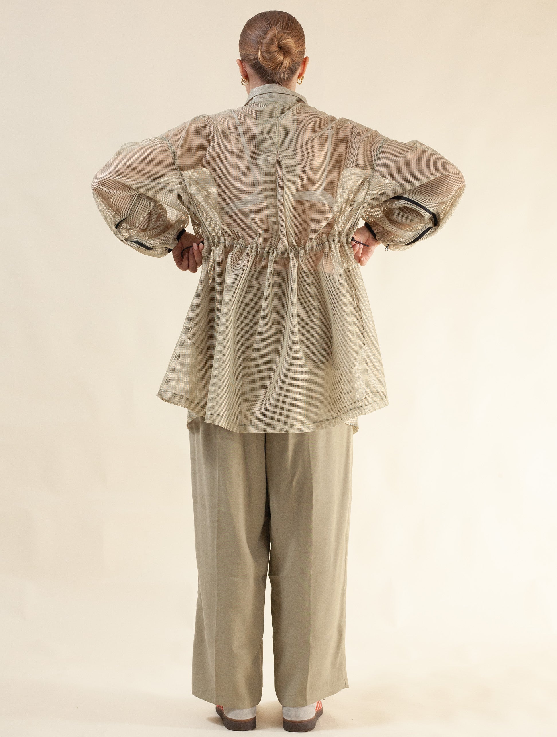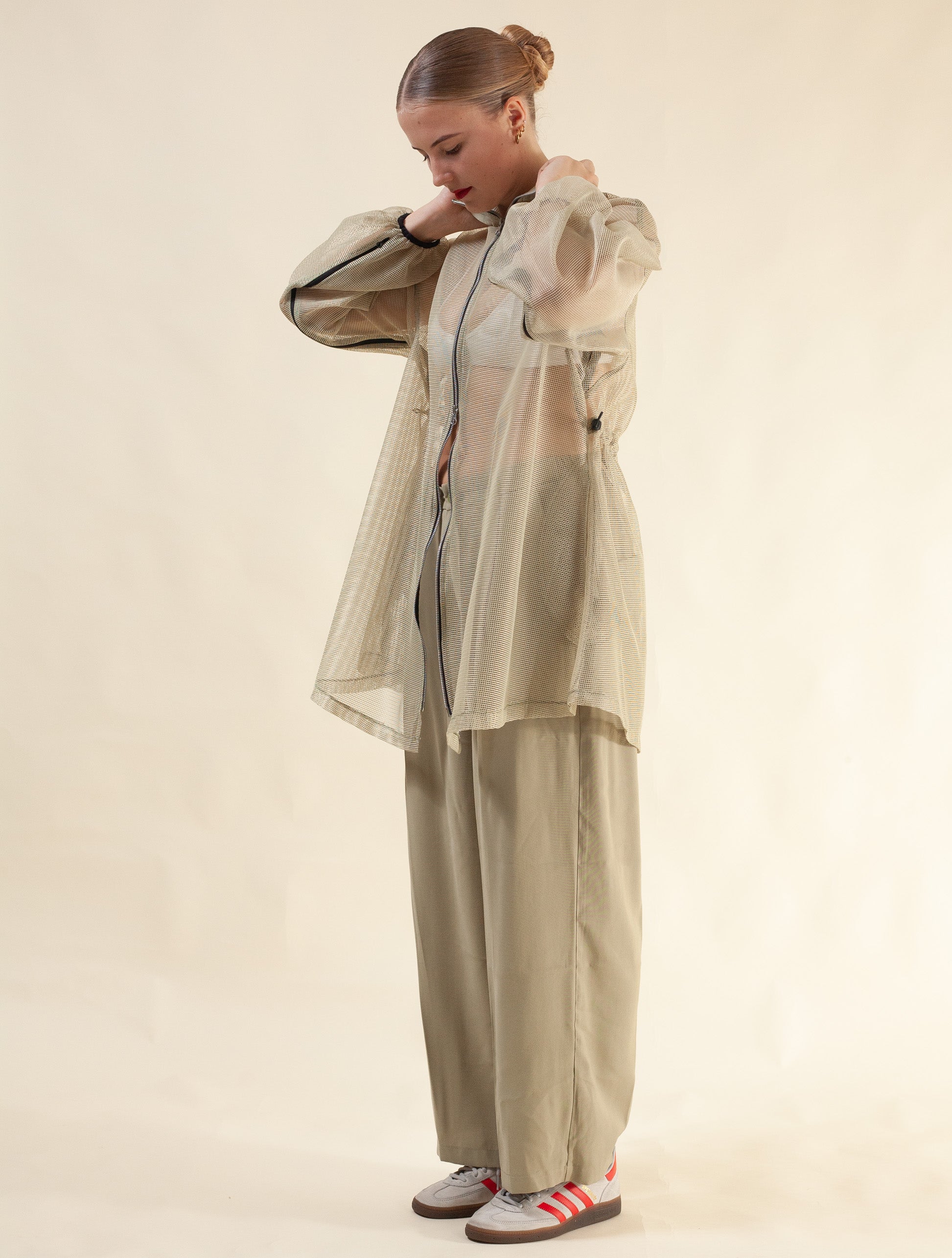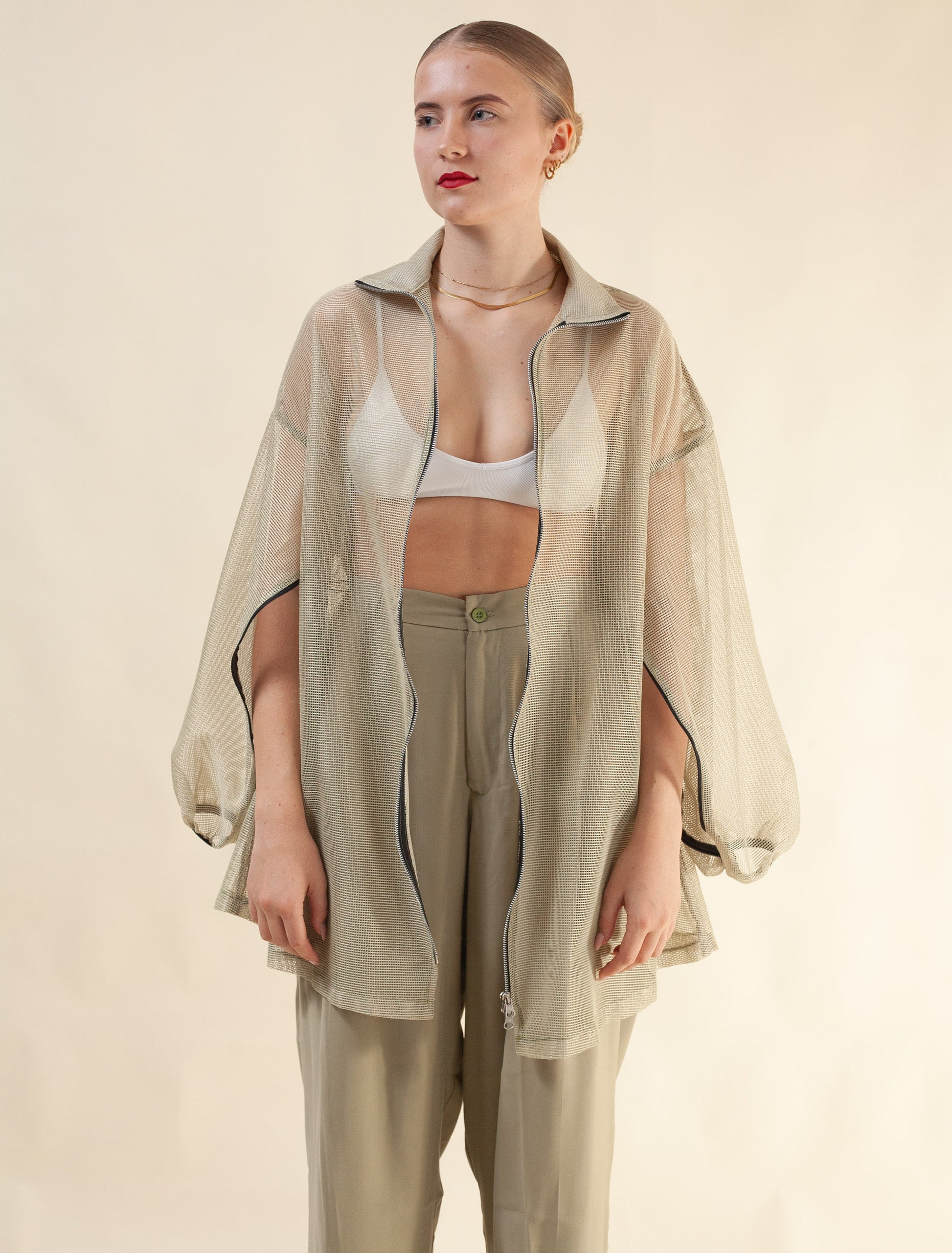 Made from superior quality technical mesh fabric. It has a double zip detail, long billowing sleeves with invisible zip closure details for trans-seasonal versatility. It also has an adjustable draw string back detail making it a comfortable everyday piece for a professional and relaxed look.