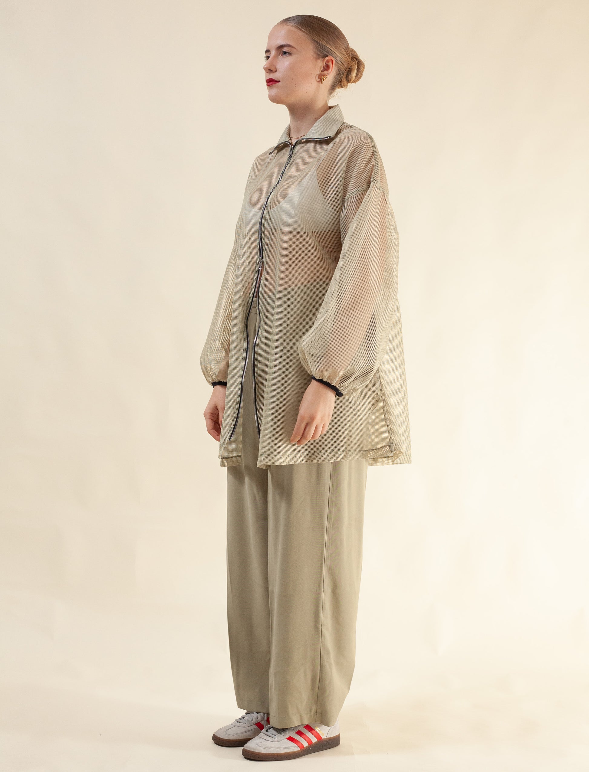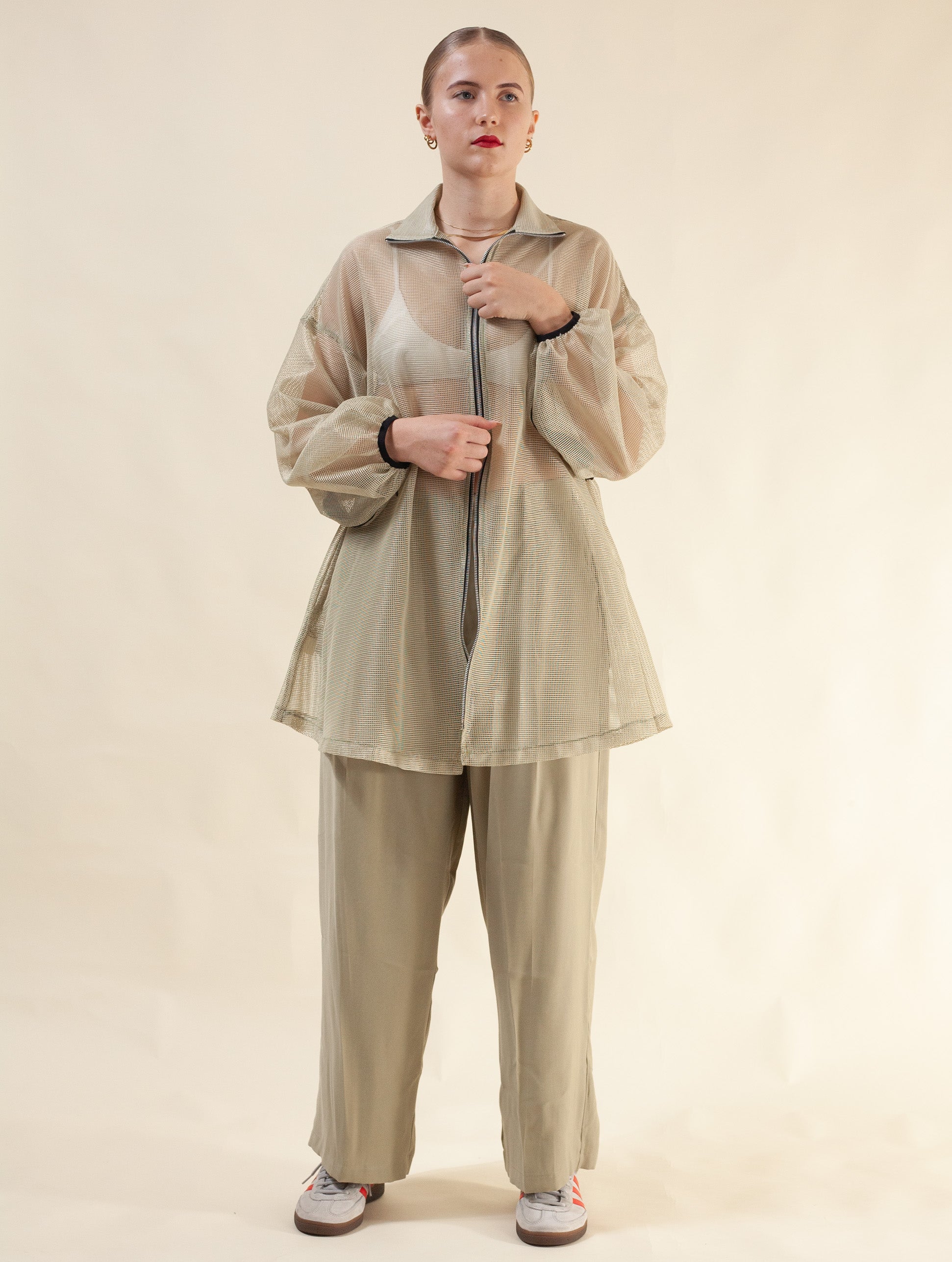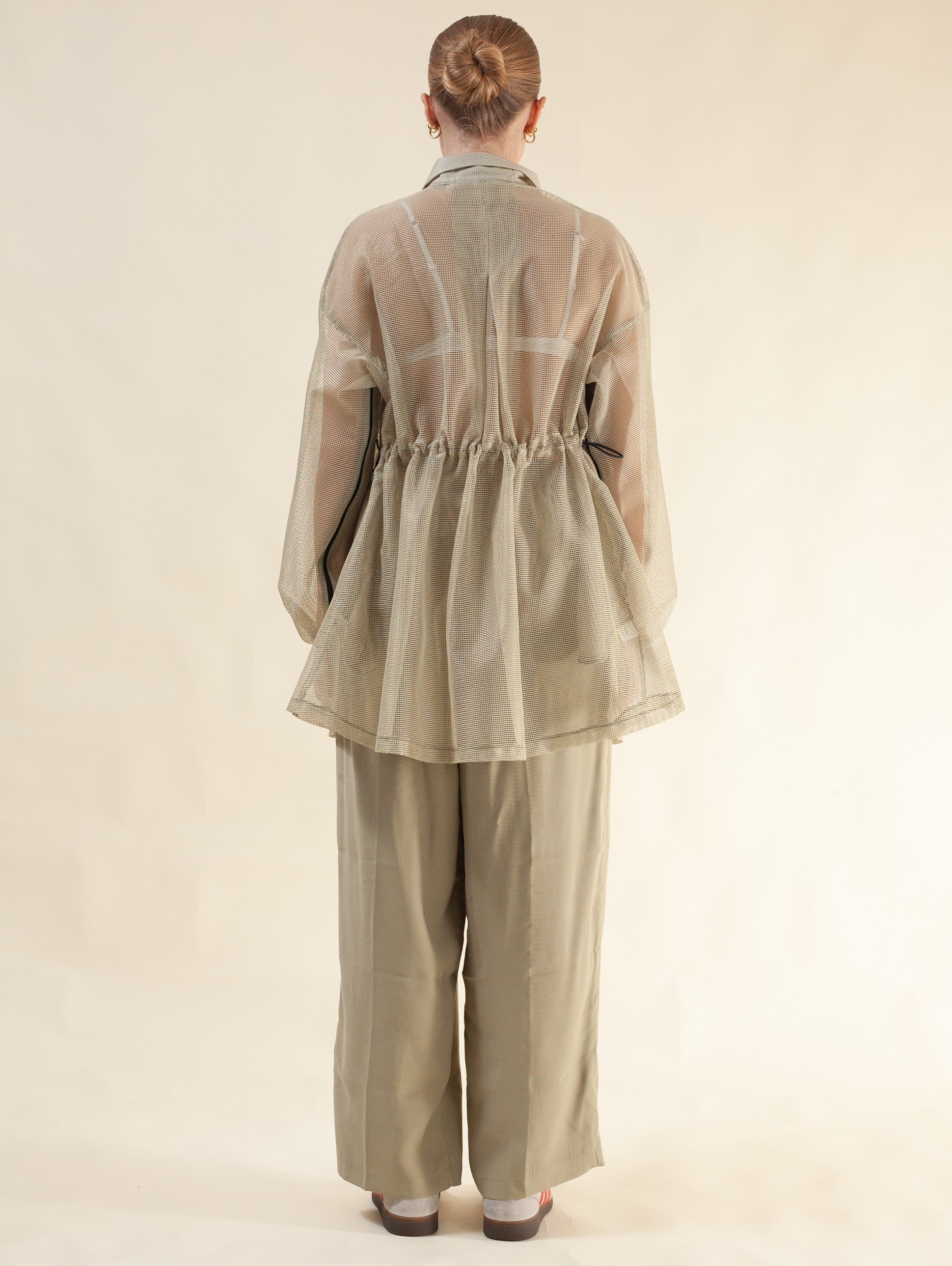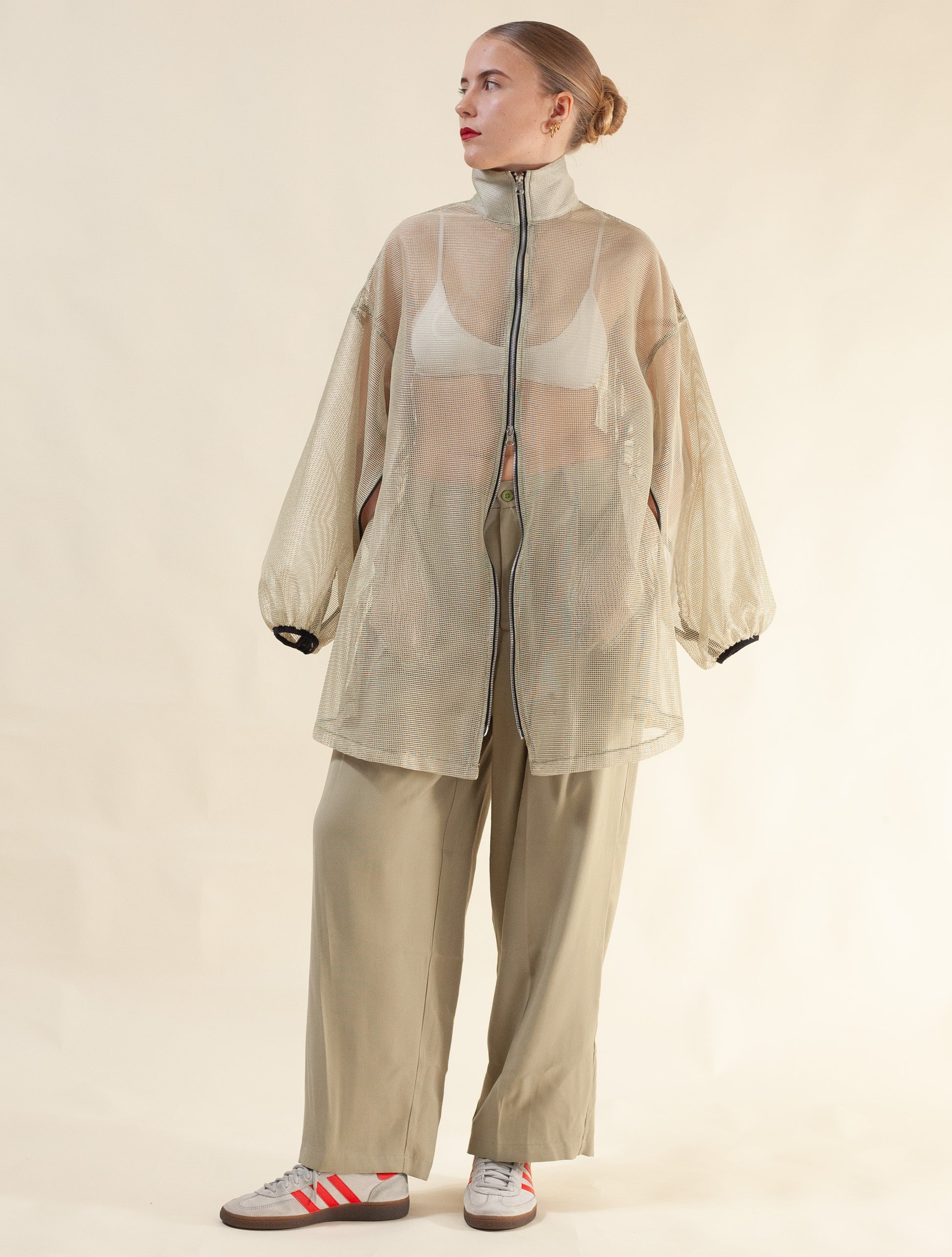 Made from superior quality technical mesh fabric. It has a double zip detail, long billowing sleeves with invisible zip closure details for trans-seasonal versatility. It also has an adjustable draw string back detail making it a comfortable everyday piece for a professional and relaxed look.