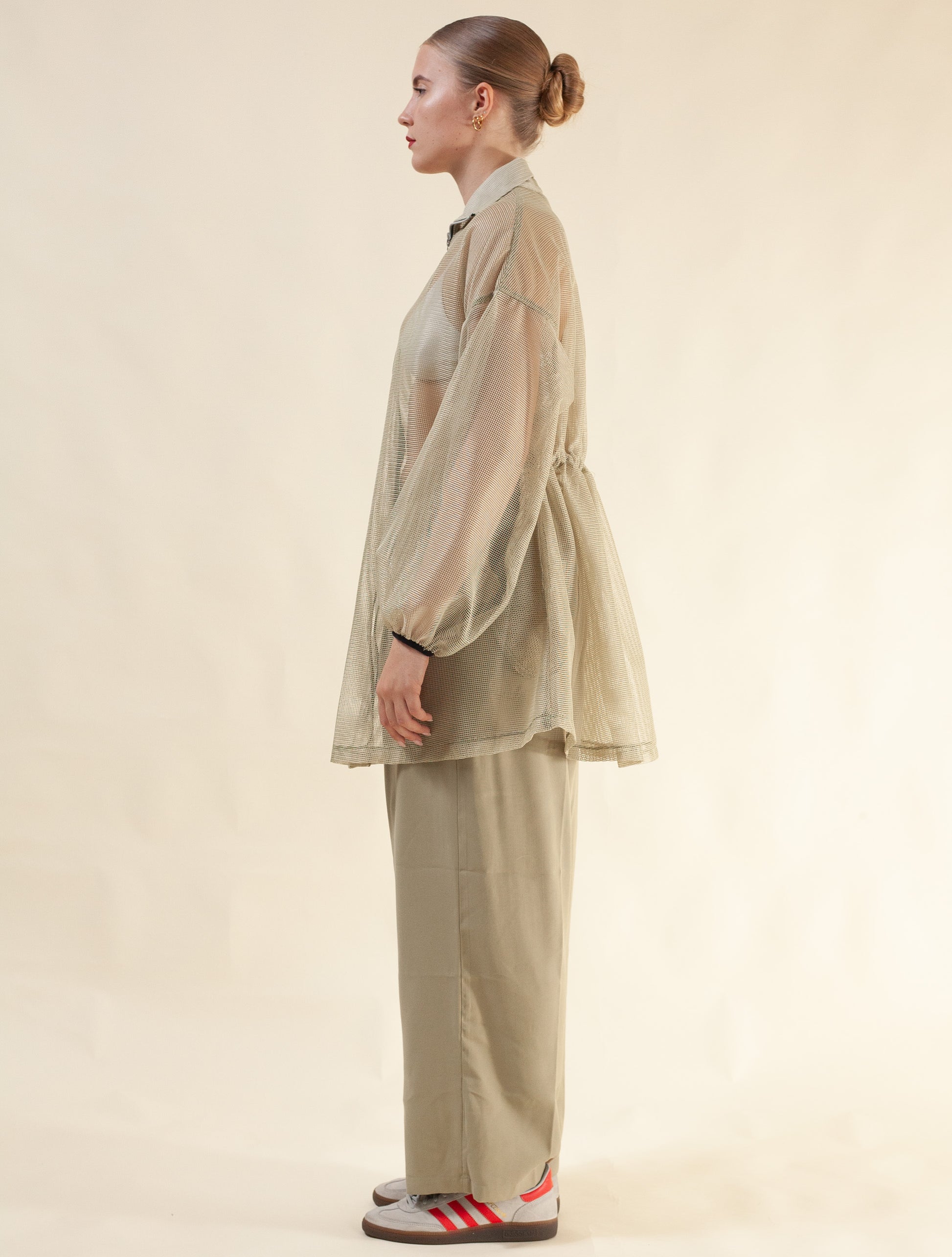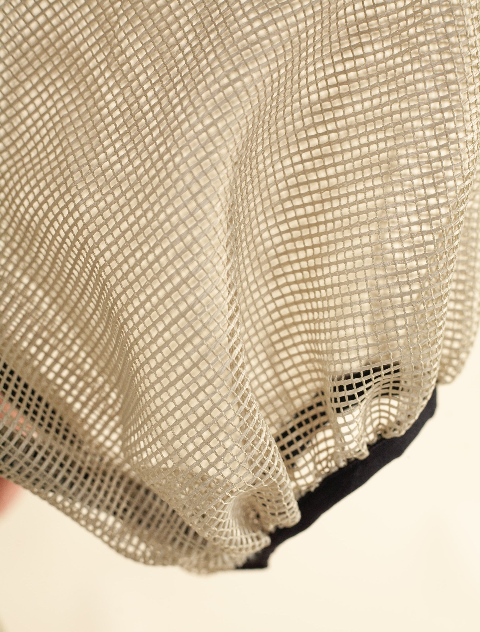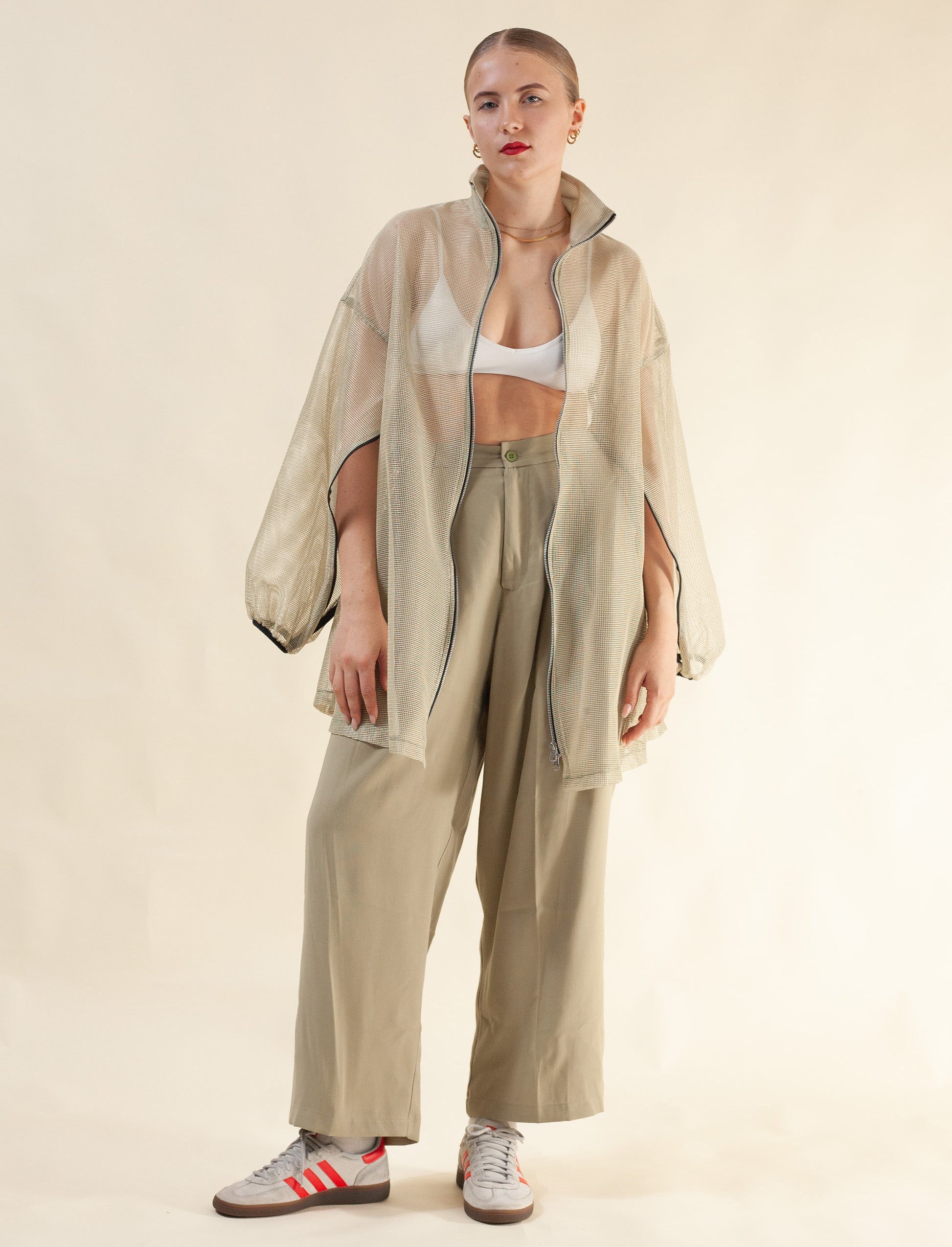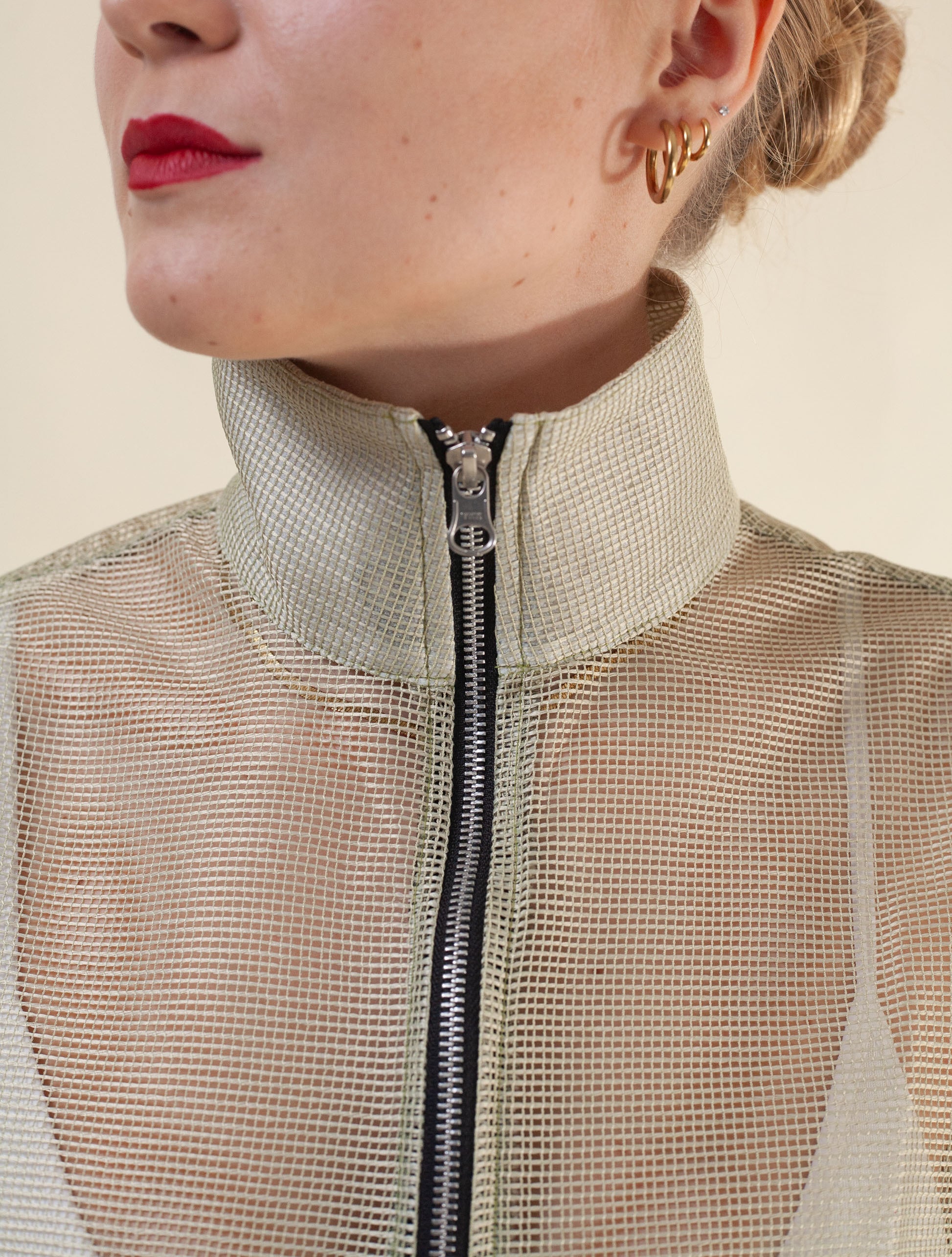 Made from superior quality technical mesh fabric. It has a double zip detail, long billowing sleeves with invisible zip closure details for trans-seasonal versatility. It also has an adjustable draw string back detail making it a comfortable everyday piece for a professional and relaxed look.