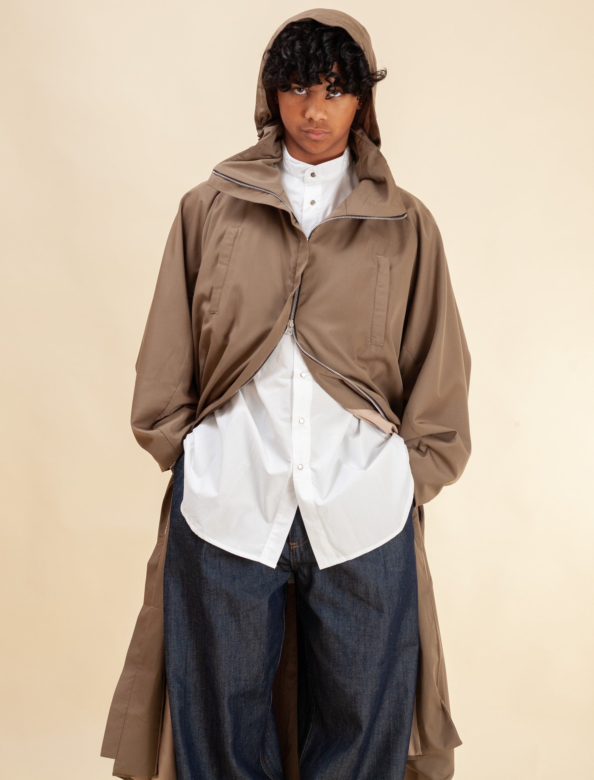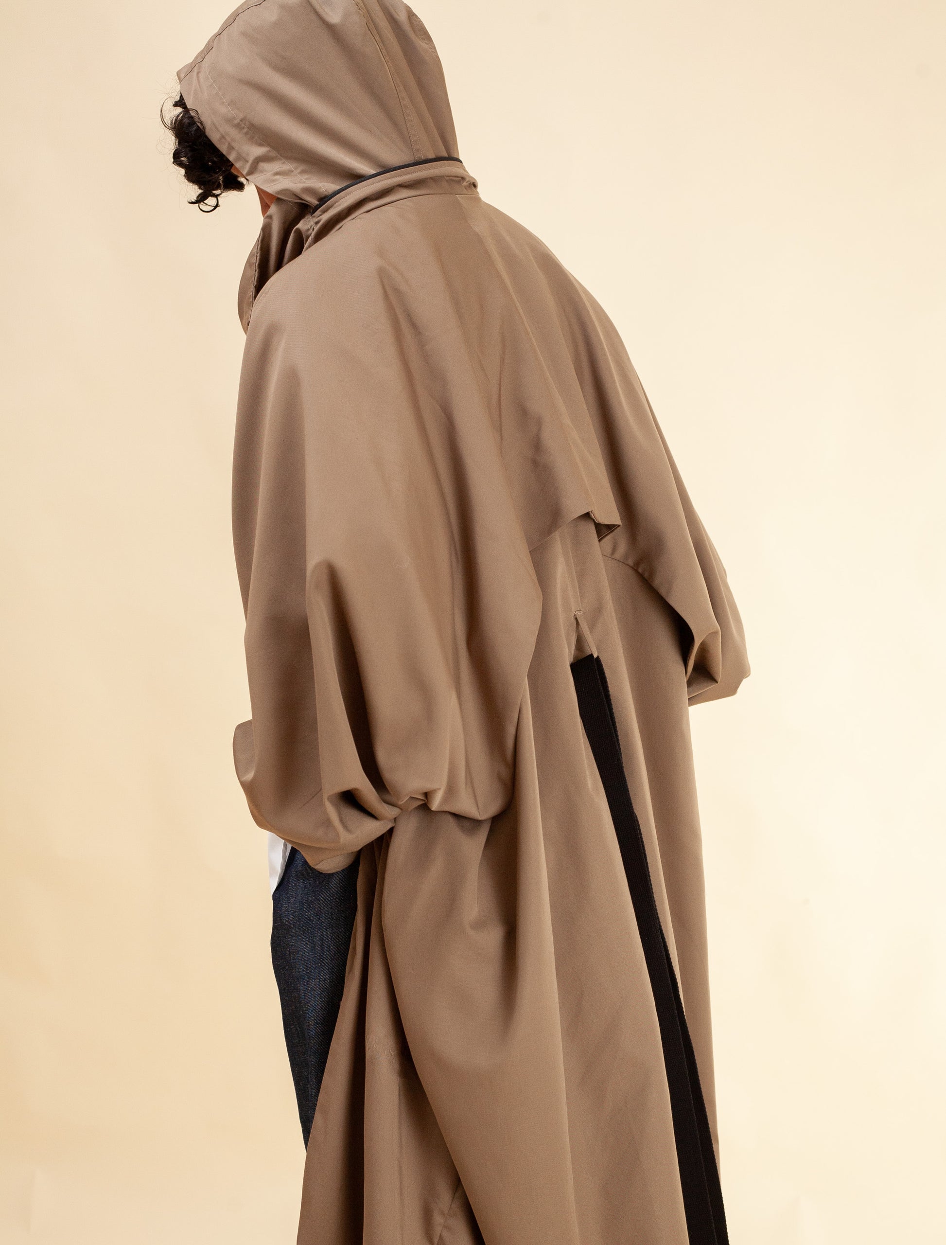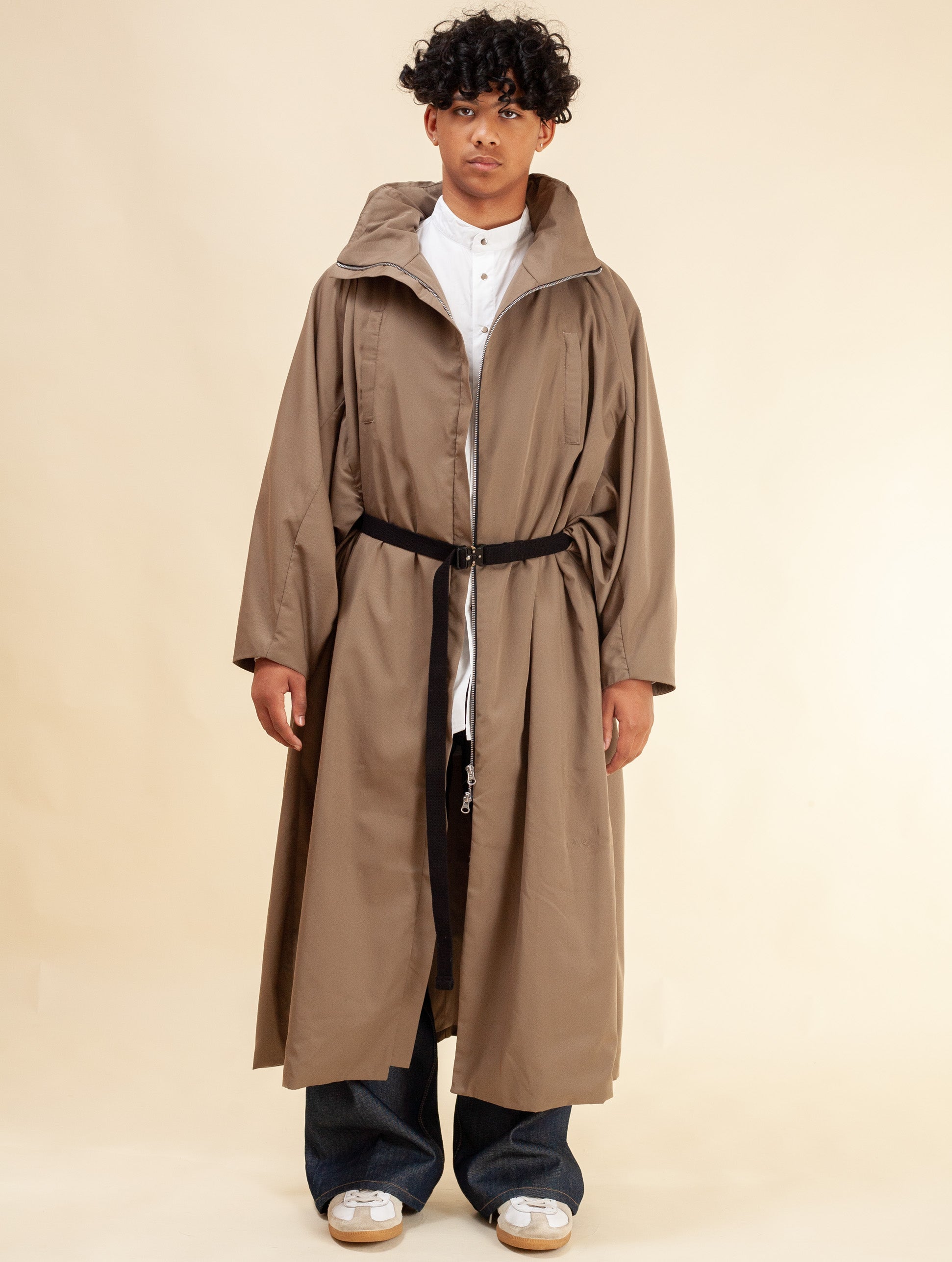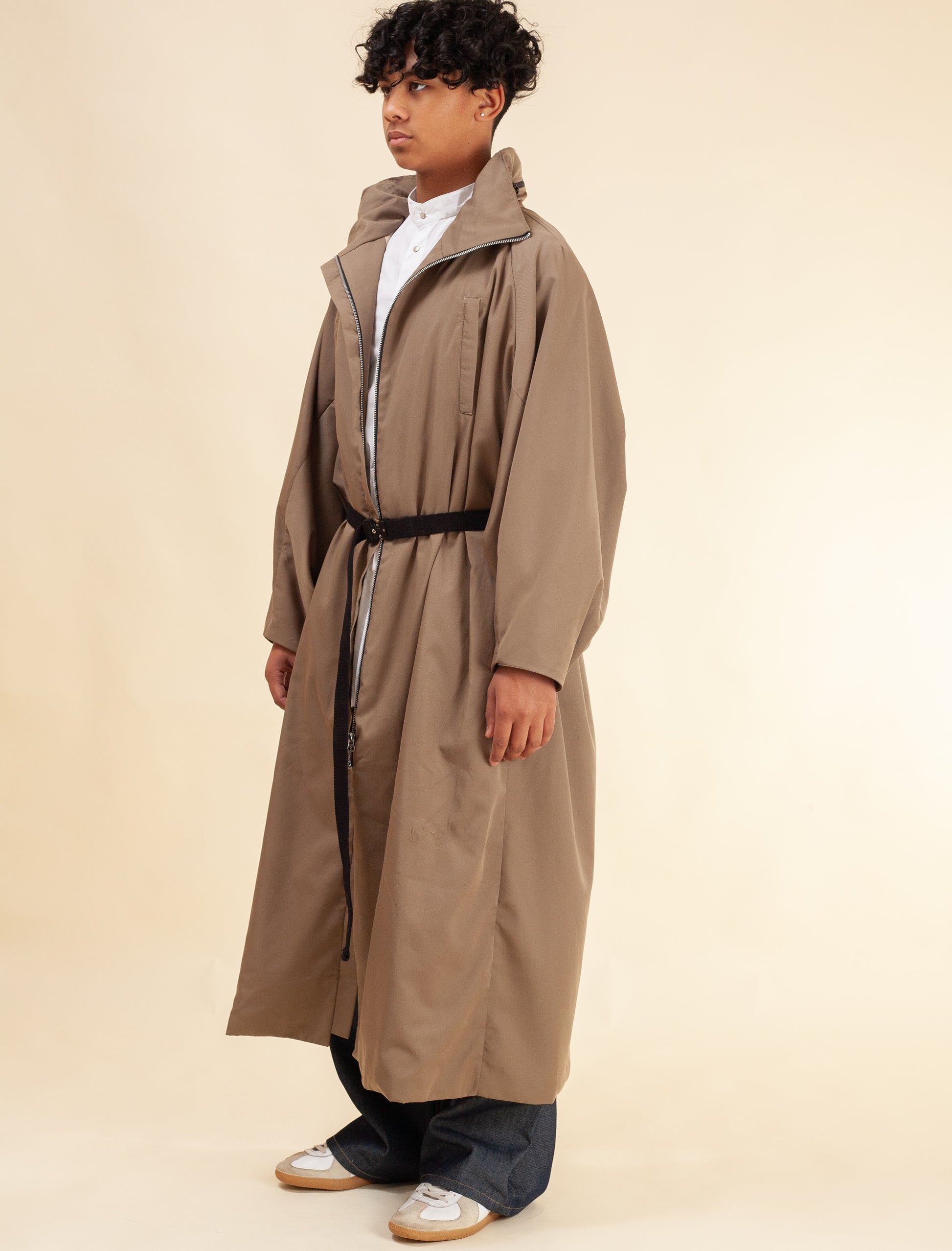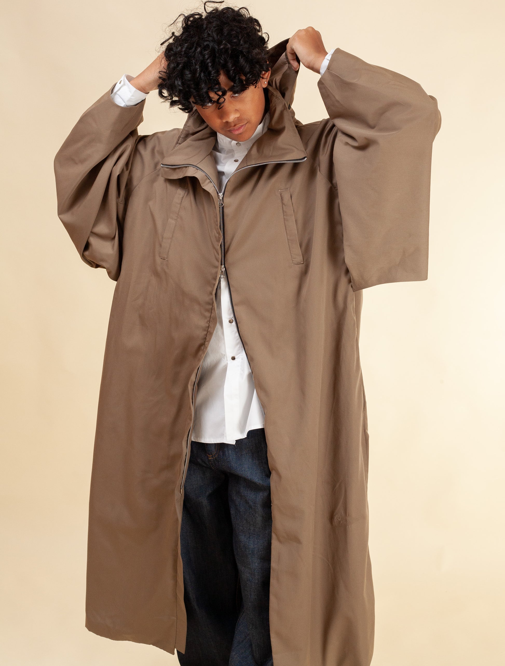 Made from High quality technical fabric and cotton twill blend. The Trench coat features a hidden hood within the collar with adjustable drawstring and a zip that follows all the way up the neck with bottom pocket detail. It has a Made with considerable design thinking. It has a kimono style opening on the sleeve that can be worn both ways. The sleeve is considerably wider and then tapered with a small pleat to serve as functional tightening. It is full length.