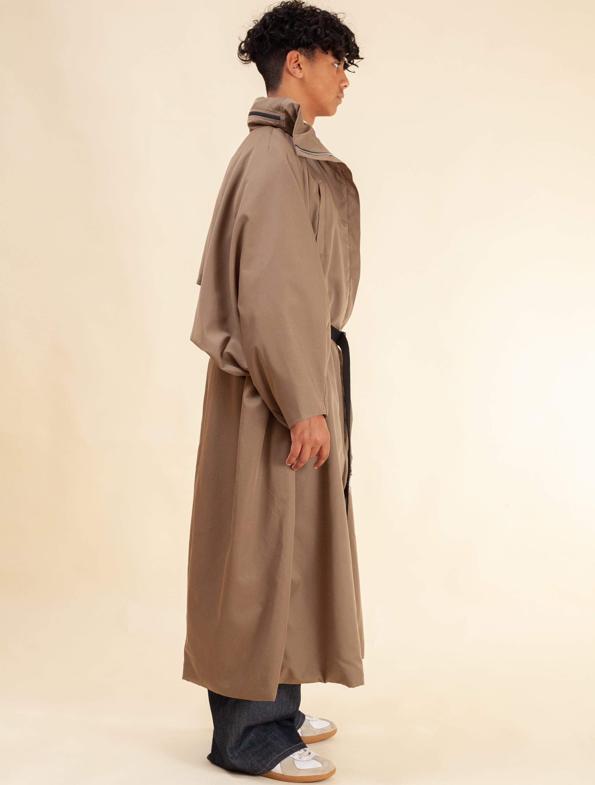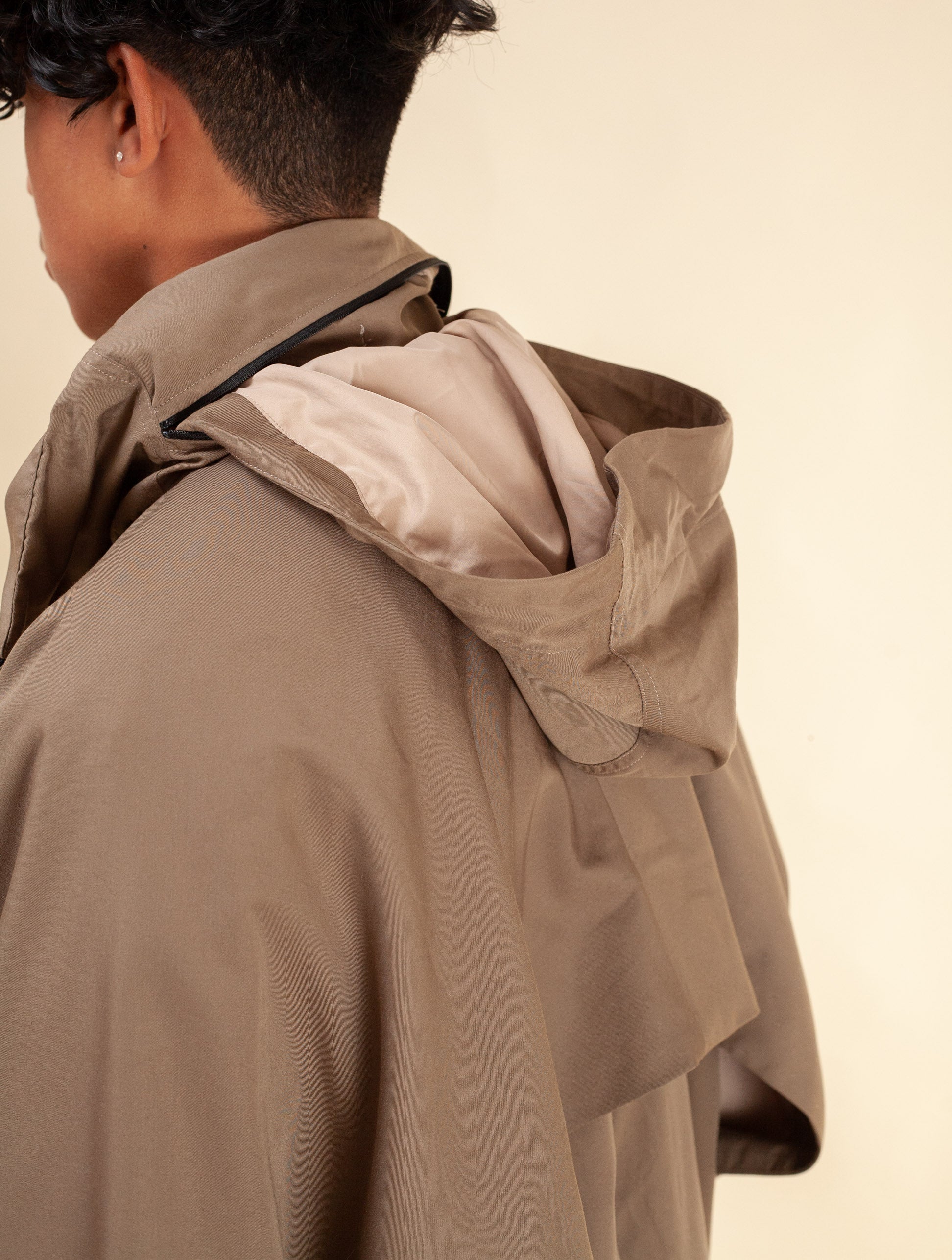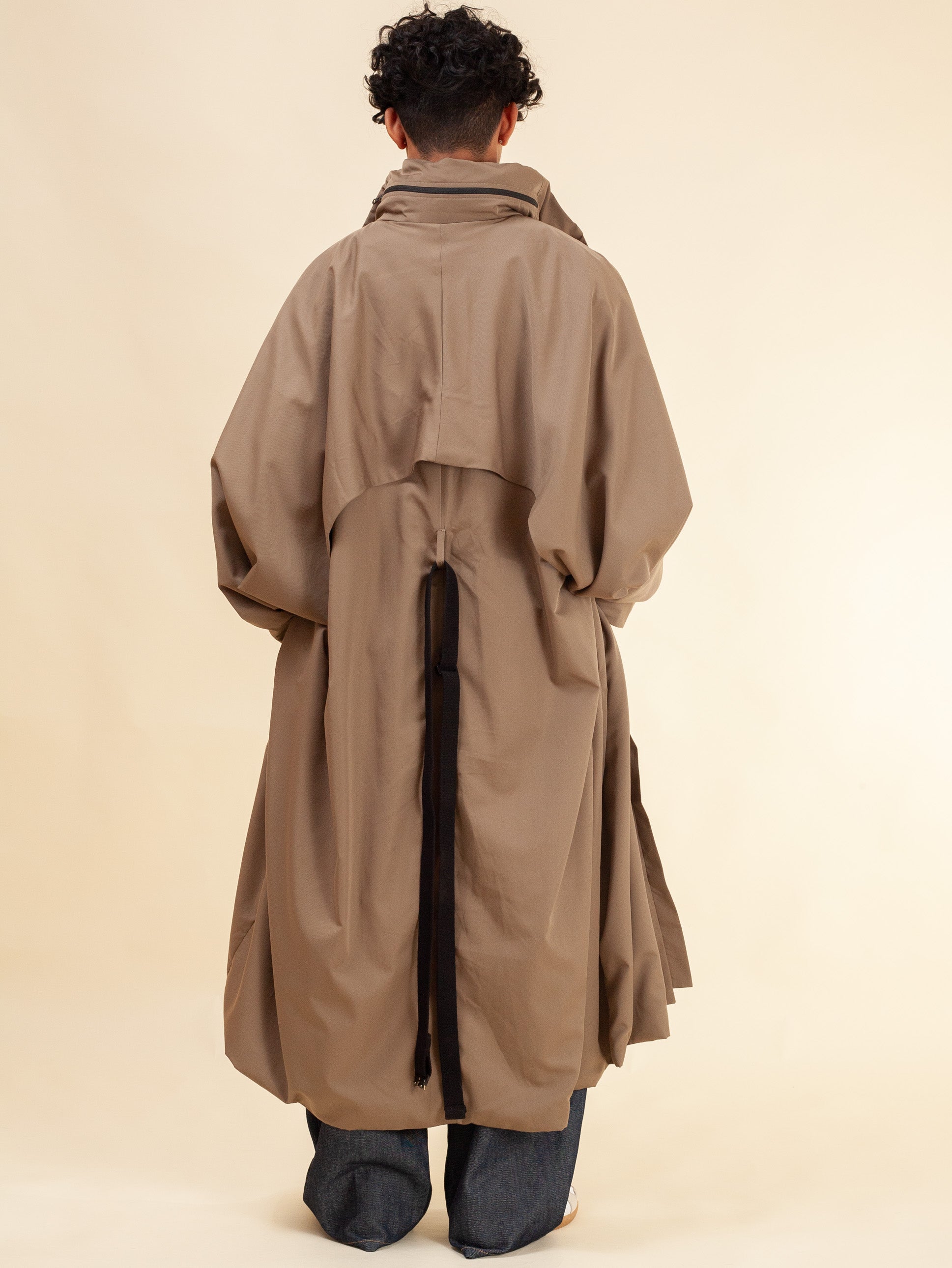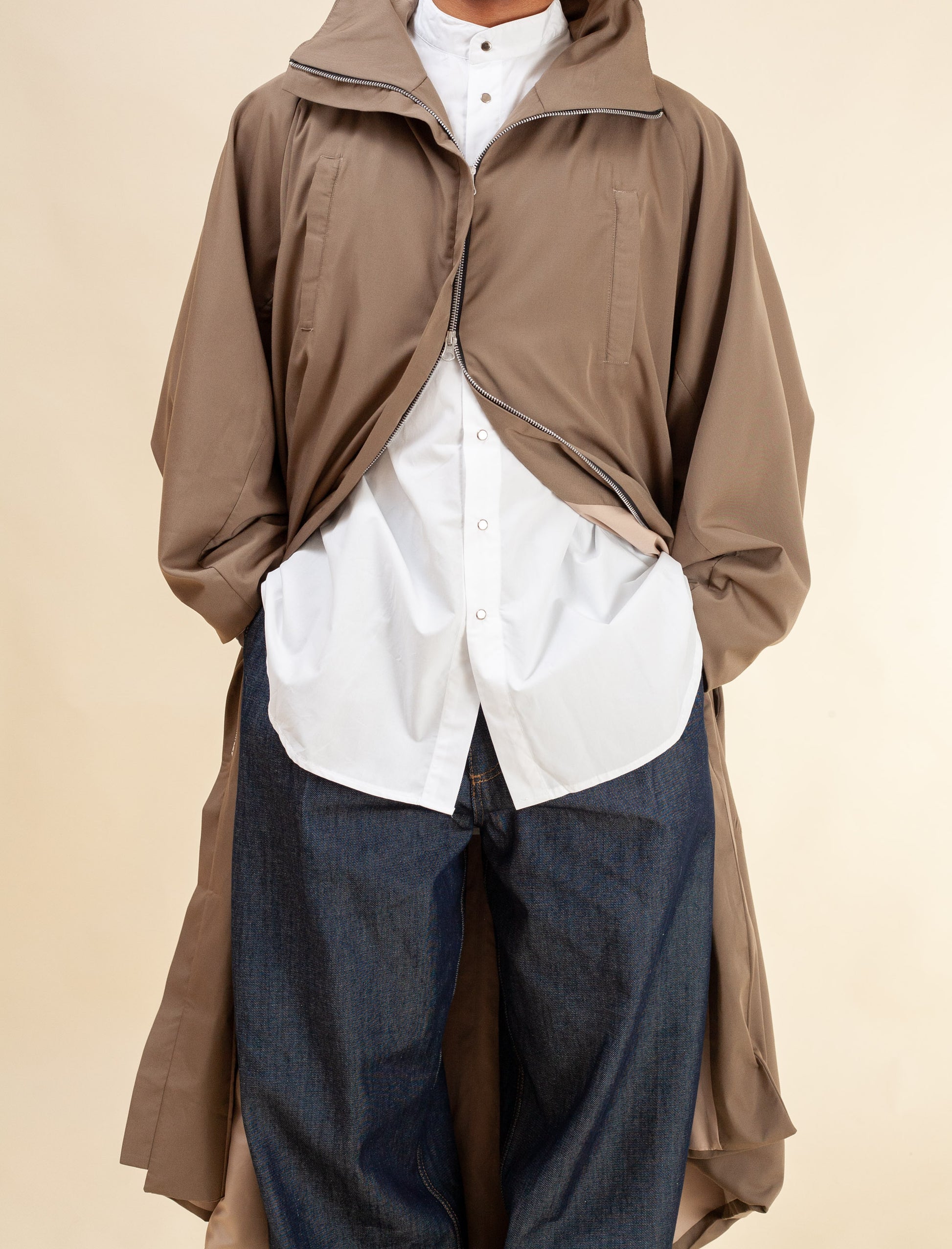 Made from High quality technical fabric and cotton twill blend. The Trench coat features a hidden hood within the collar with adjustable drawstring and a zip that follows all the way up the neck with bottom pocket detail. It has a Made with considerable design thinking. It has a kimono style opening on the sleeve that can be worn both ways. The sleeve is considerably wider and then tapered with a small pleat to serve as functional tightening. It is full length.