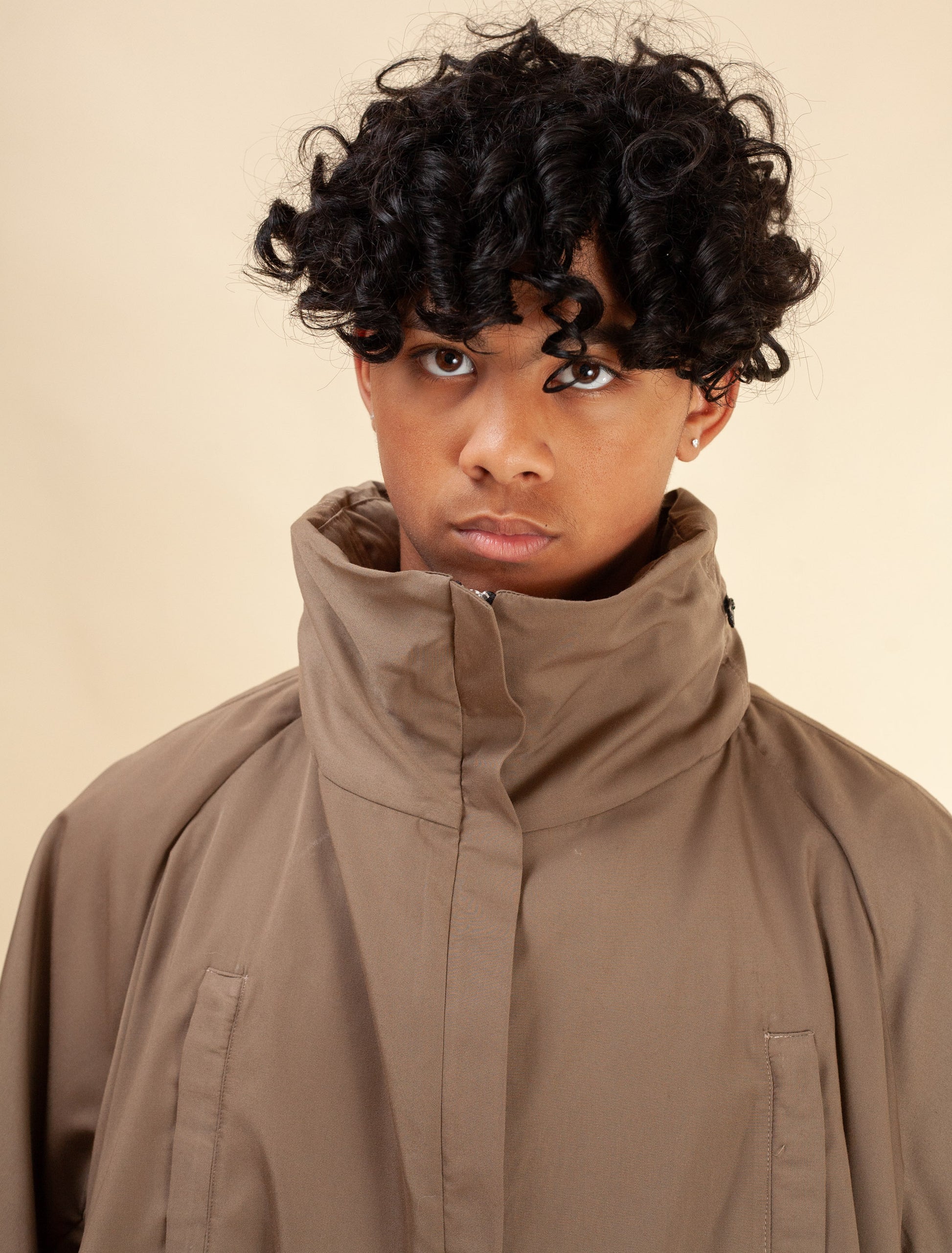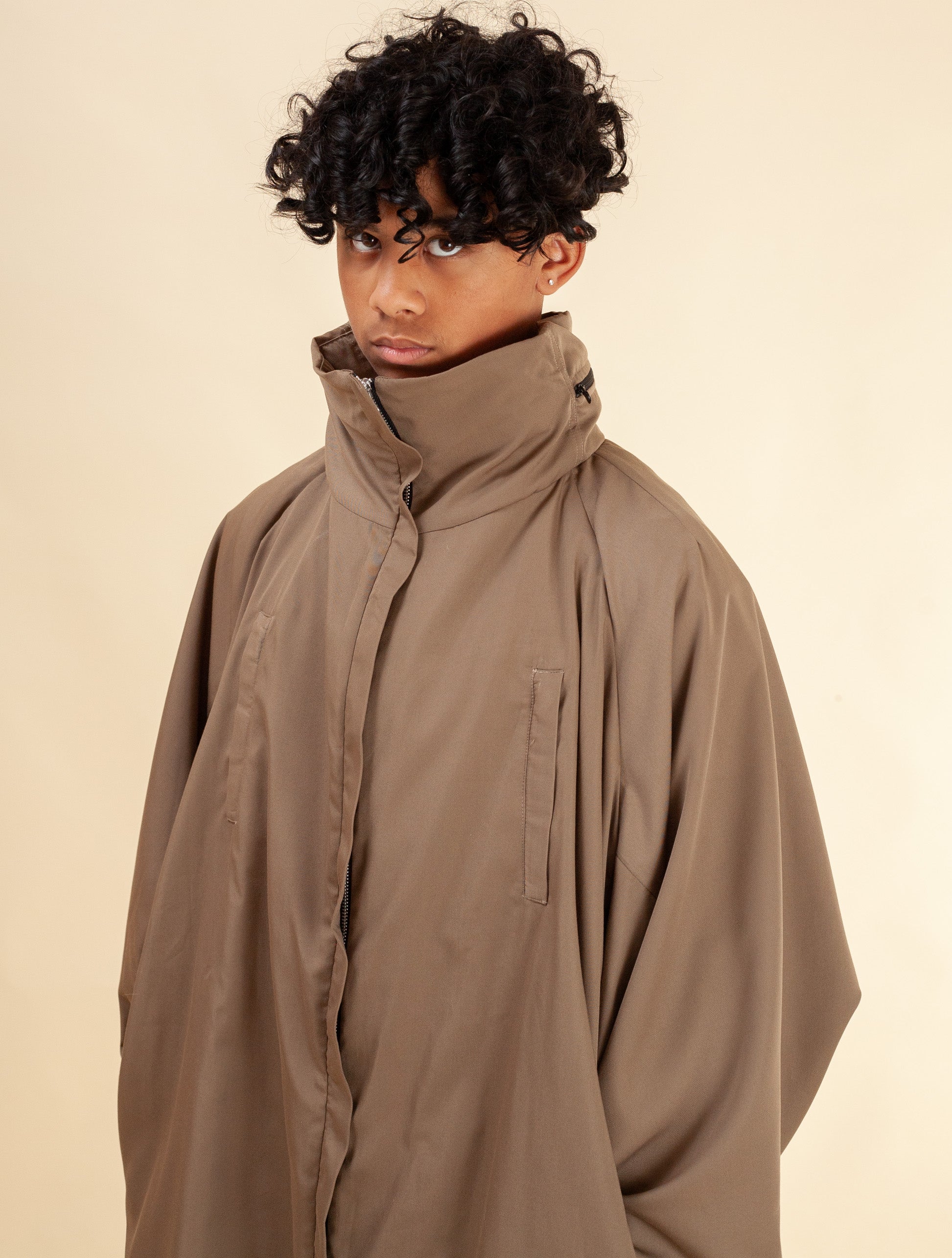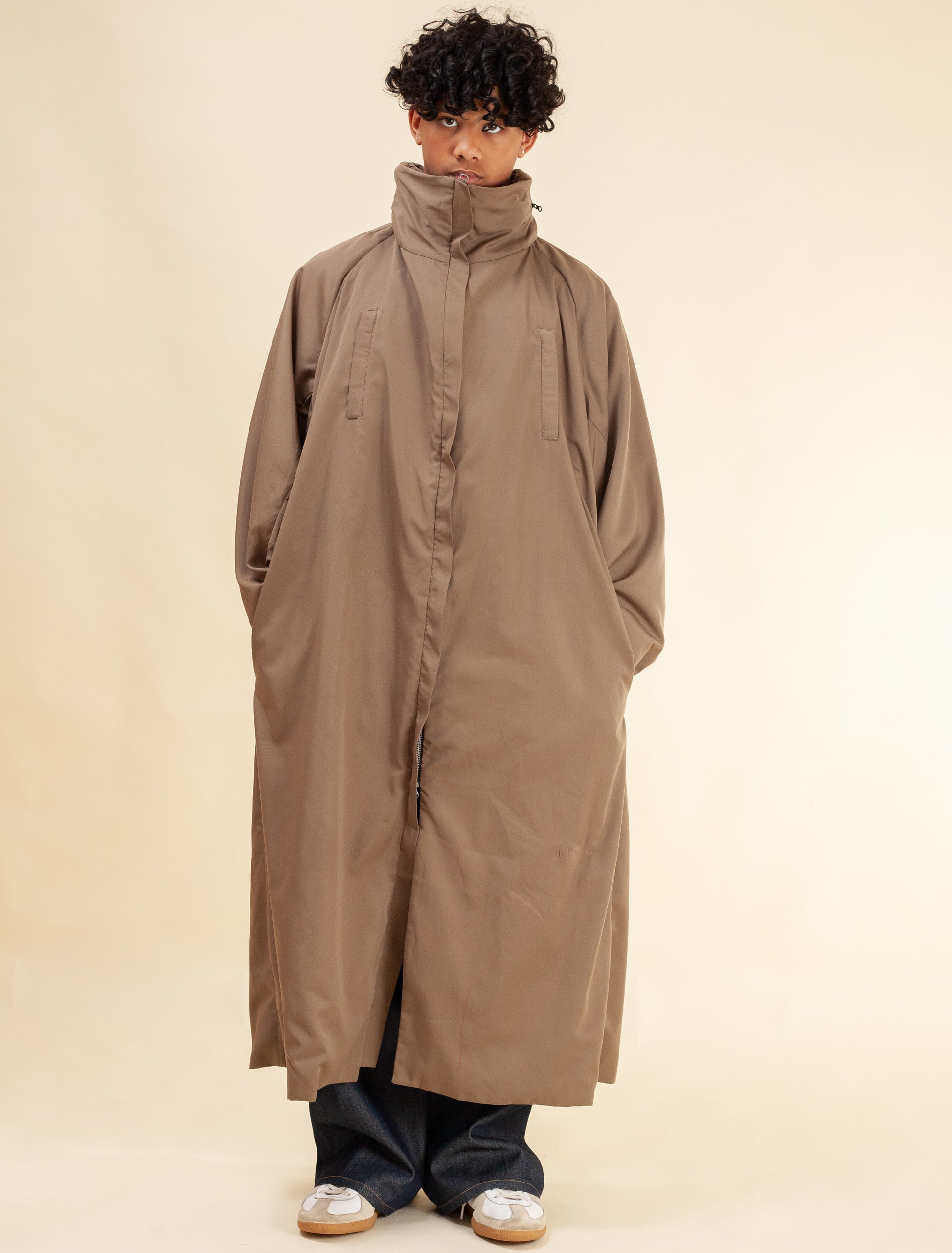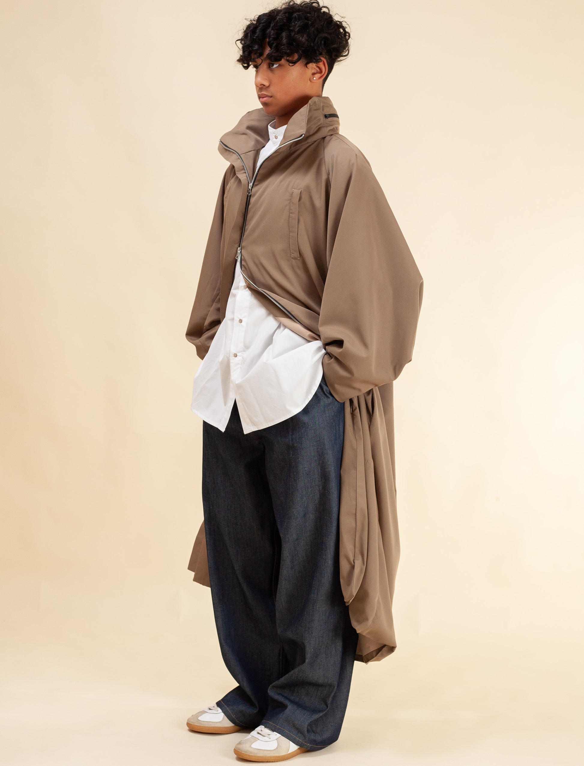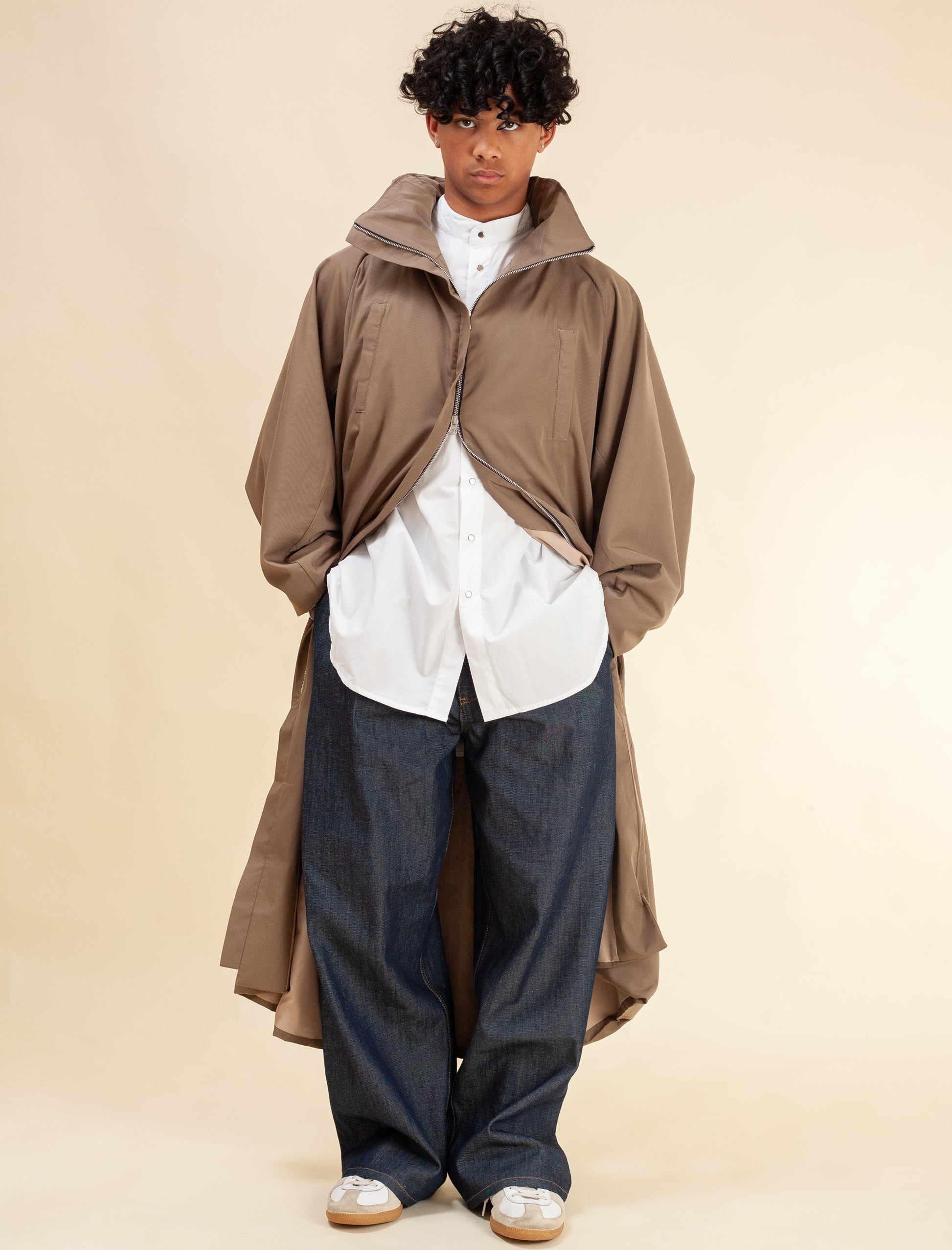 Made from High quality technical fabric and cotton twill blend. The Trench coat features a hidden hood within the collar with adjustable drawstring and a zip that follows all the way up the neck with bottom pocket detail. It has a Made with considerable design thinking. It has a kimono style opening on the sleeve that can be worn both ways. The sleeve is considerably wider and then tapered with a small pleat to serve as functional tightening. It is full length.