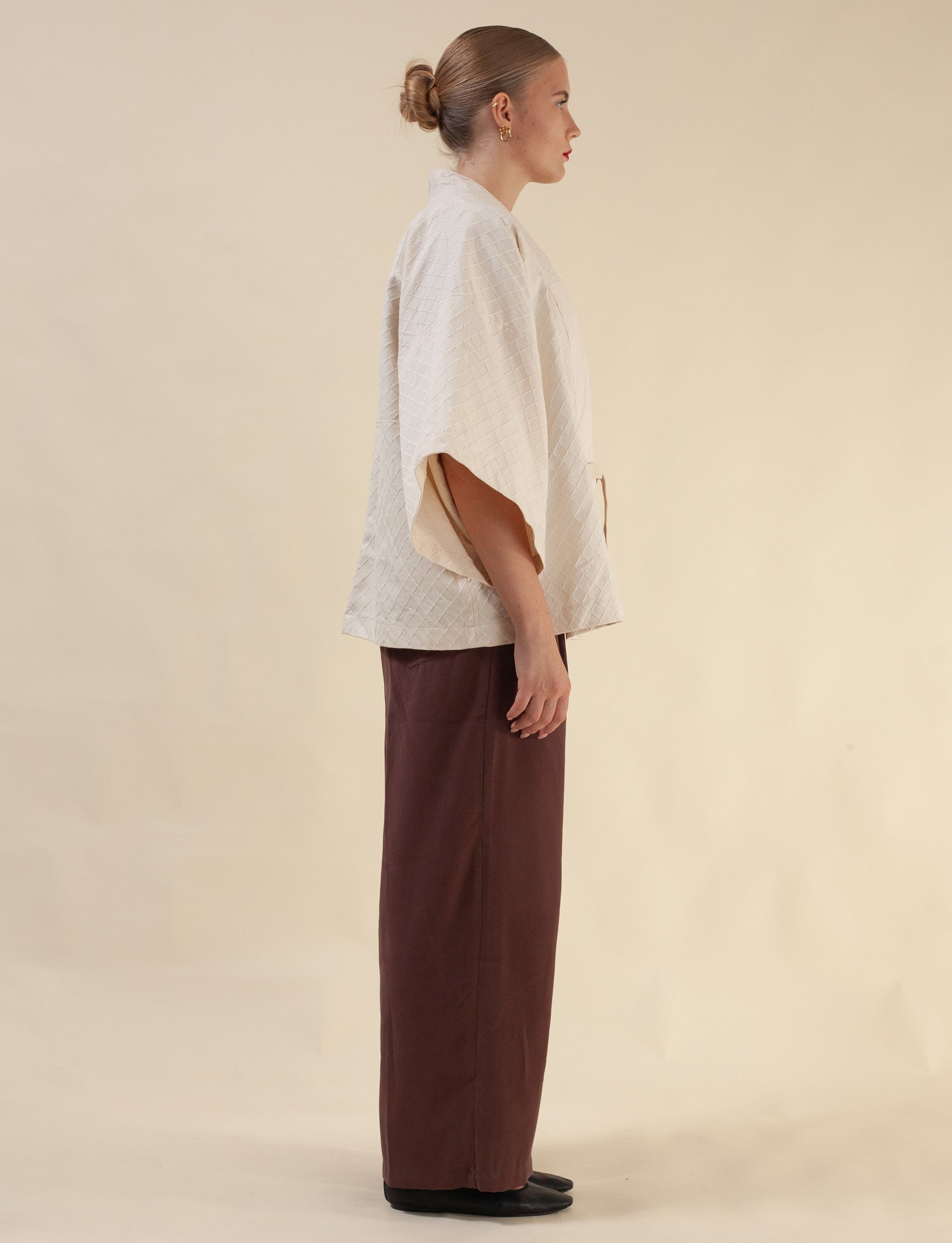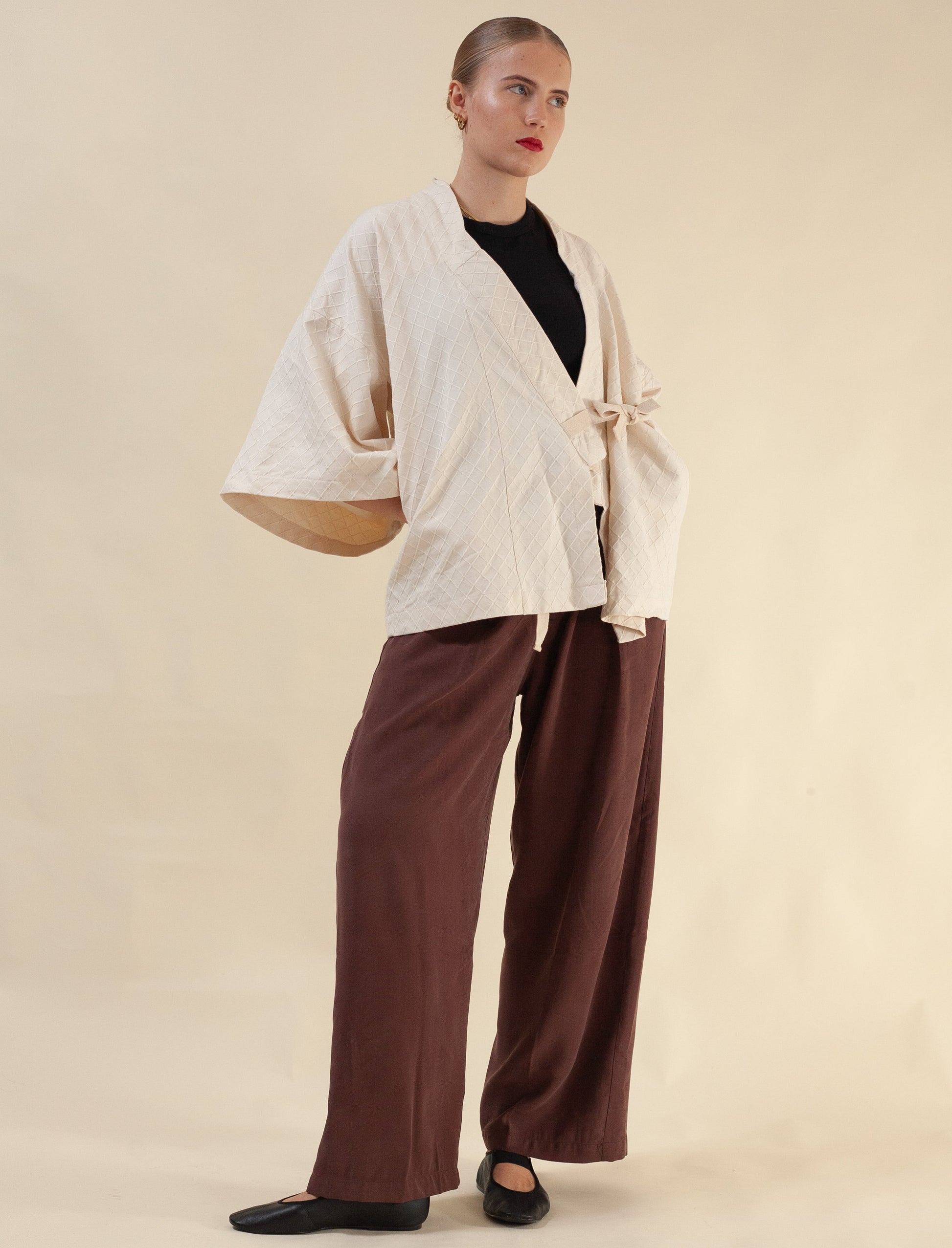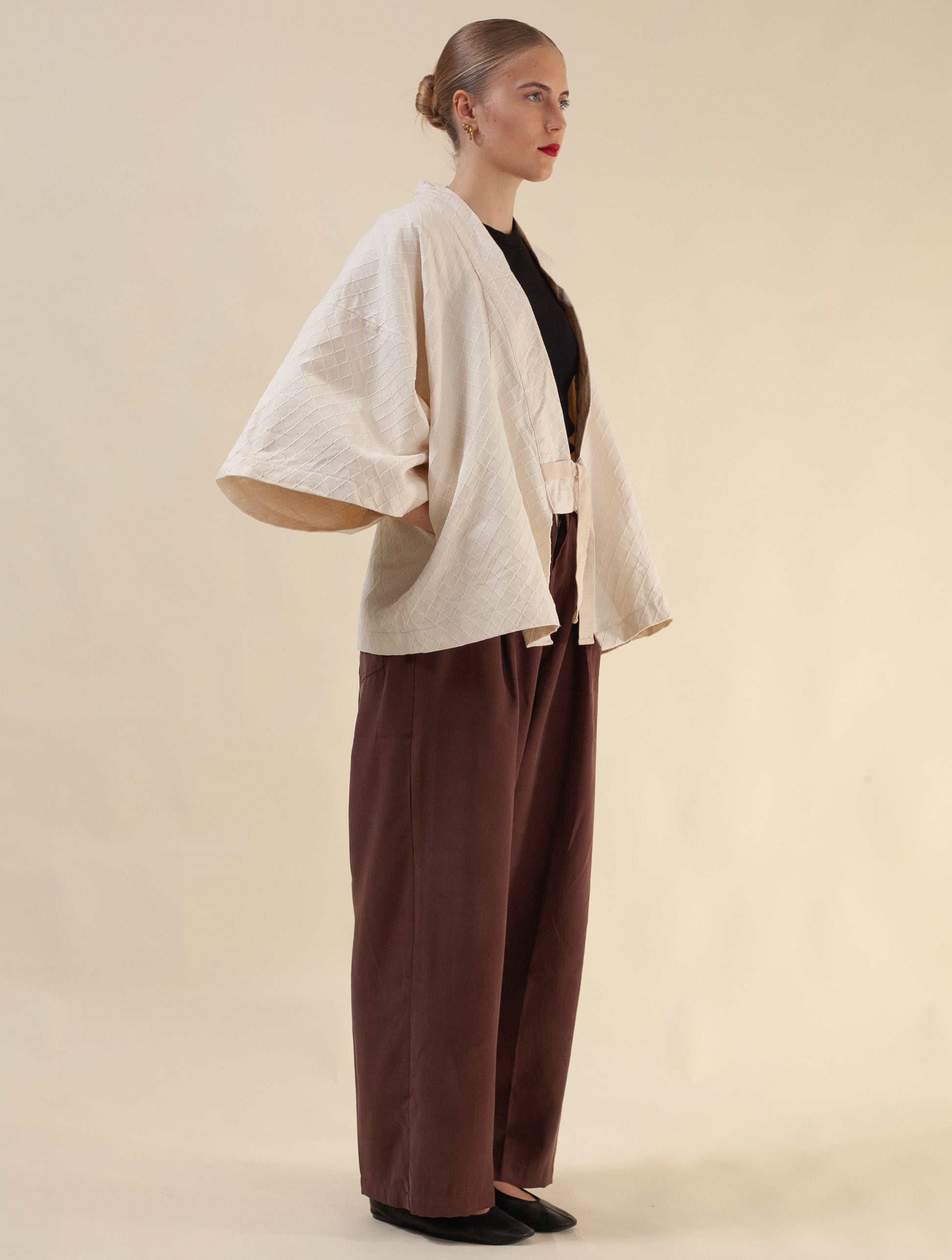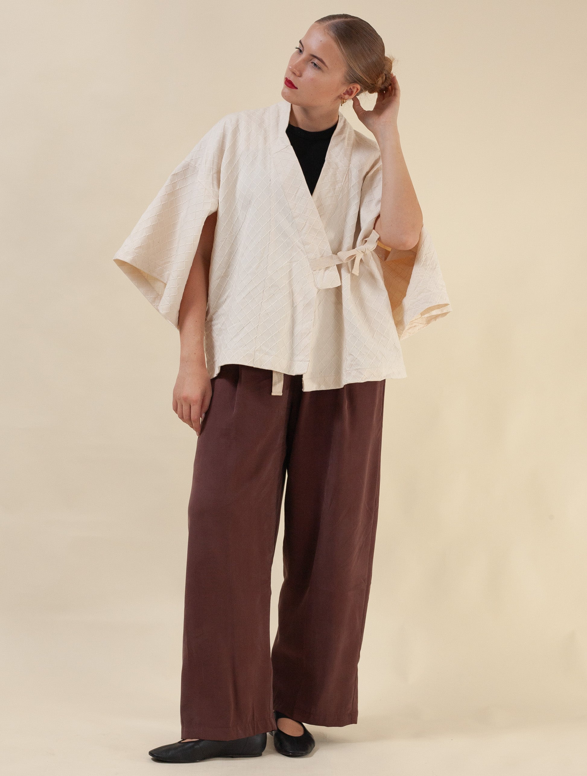 Made from Woven Jacquard Cotton Twill. It is inspired by the original form and Silhouette of a Japanese Kimono with alternate armholes. It’s an effortless, chic and comfortable piece. The ties are designed with 100% Cotton twill ribbon and is in contrast to the fabric and is able to tie on the inside and out.