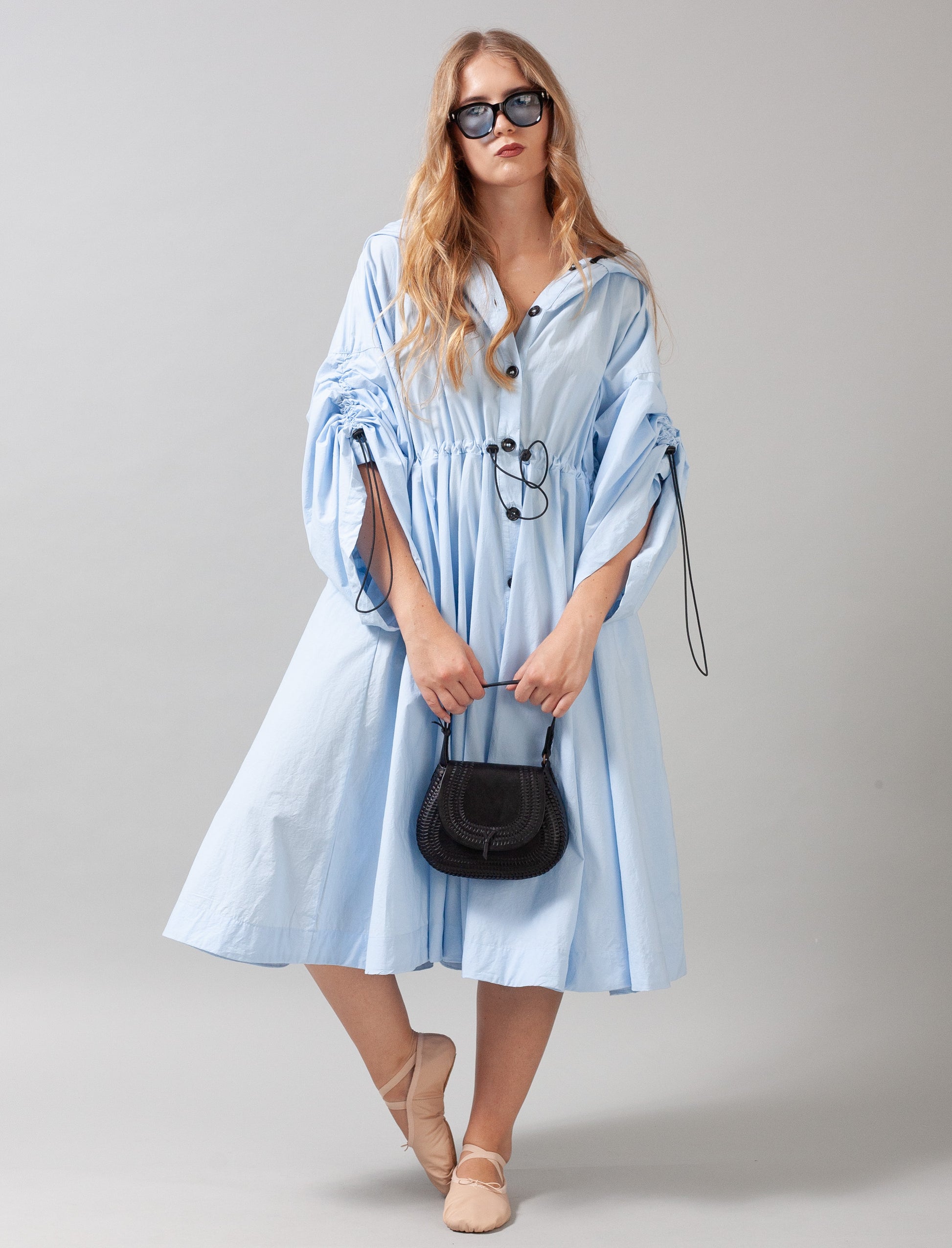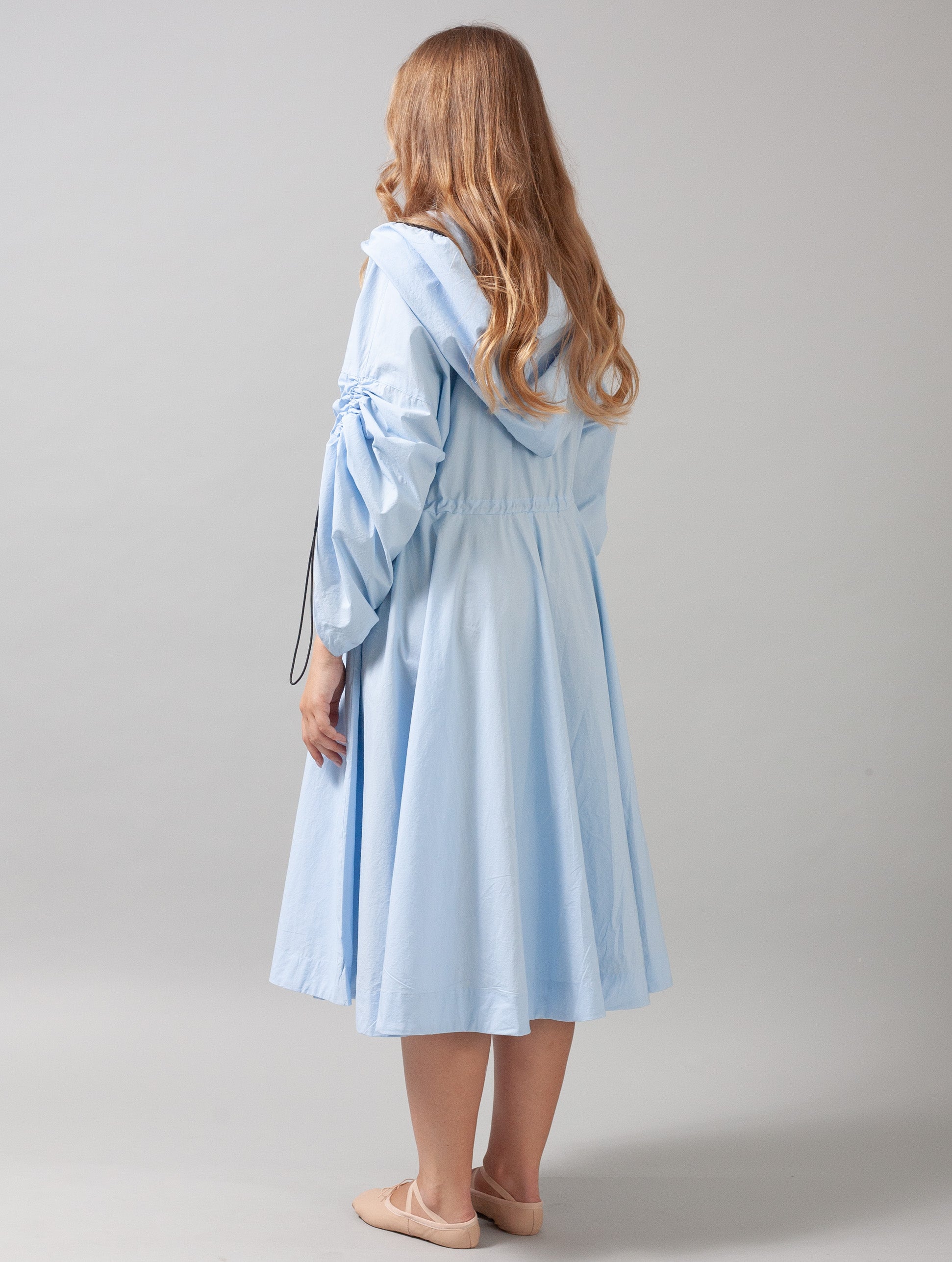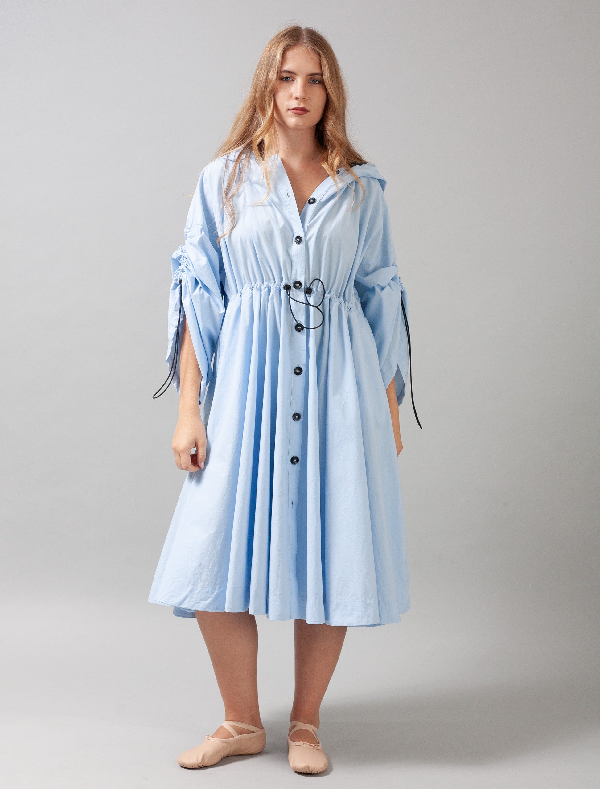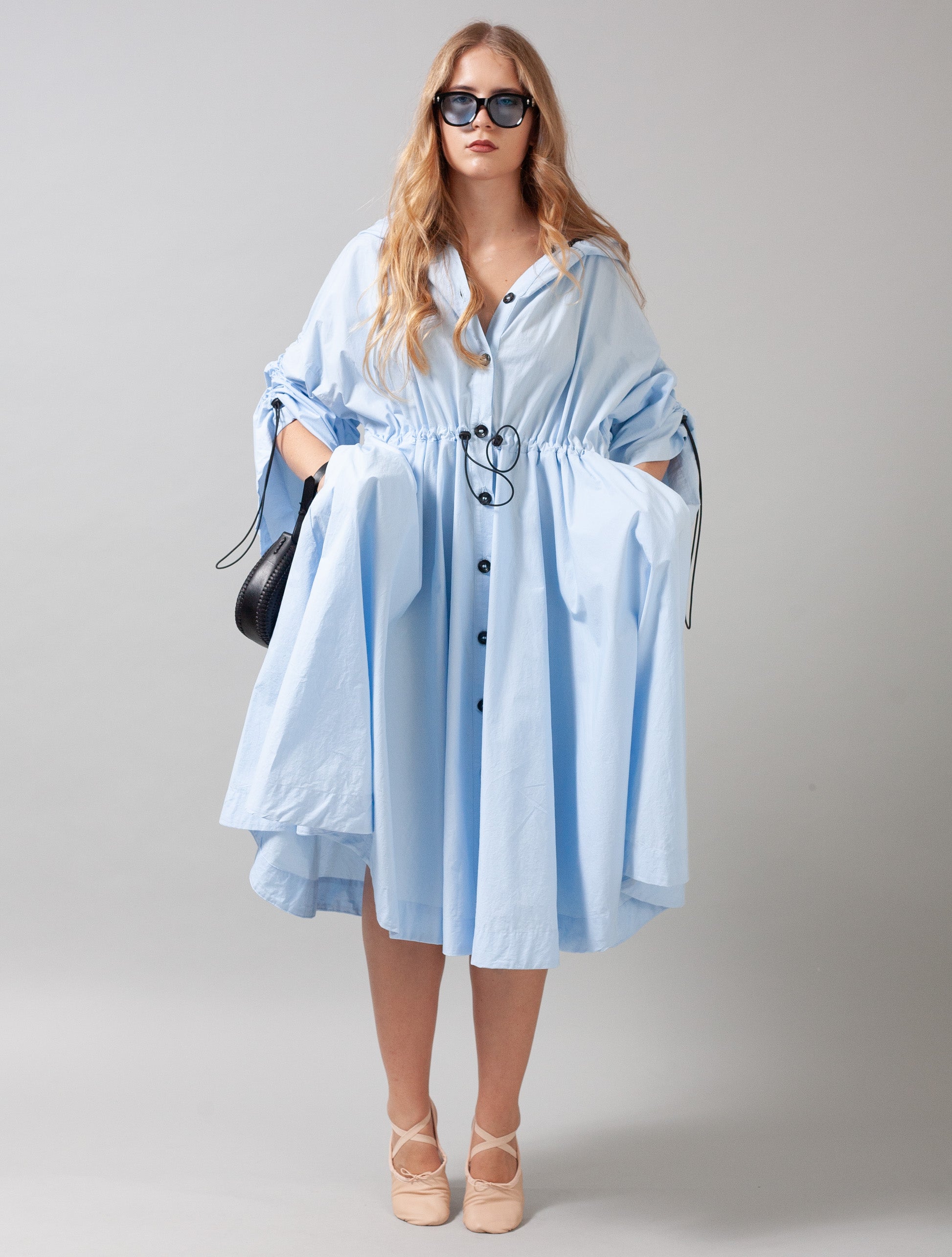 Made from compressed cotton poplin. It has button closure detail all the way down to be able to wear completely open, with an oversized hood, long billowing sleeves with draw string adjustable sleeves. It also has an adjustable draw string detail s in the front, making it a comfortable everyday piece for a relaxed look for a professional and relaxed look. It can be worn as a coat, shirt or dress.