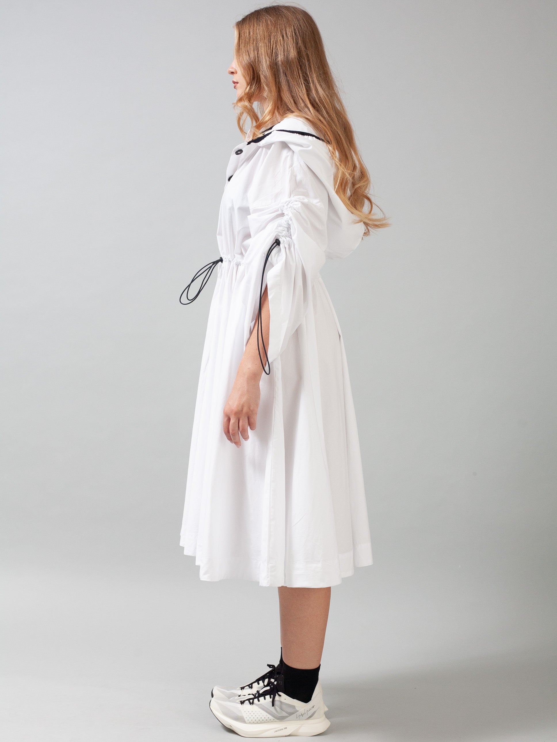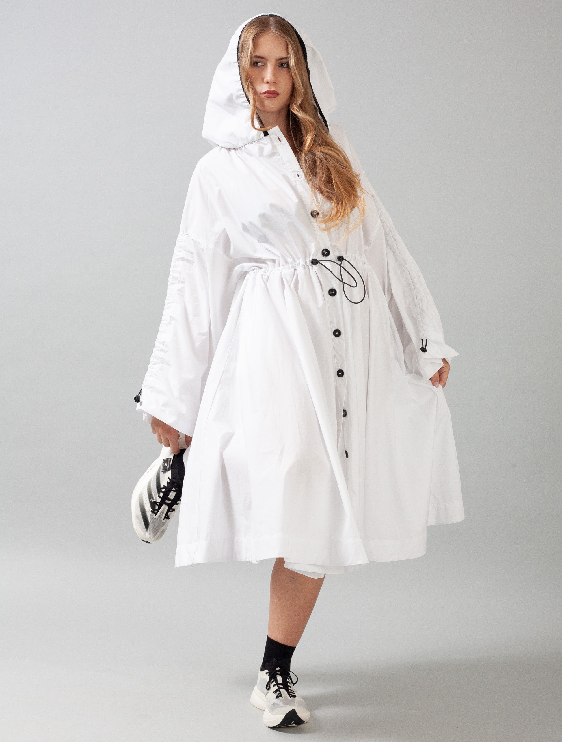 Made from compressed cotton poplin. It has button closure detail all the way down to be able to wear completely open, with an oversized hood, long billowing sleeves with draw string adjustable sleeves. It also has an adjustable draw string detail s in the front, making it a comfortable everyday piece for a relaxed look for a professional and relaxed look. It can be worn as a coat, shirt or dress.